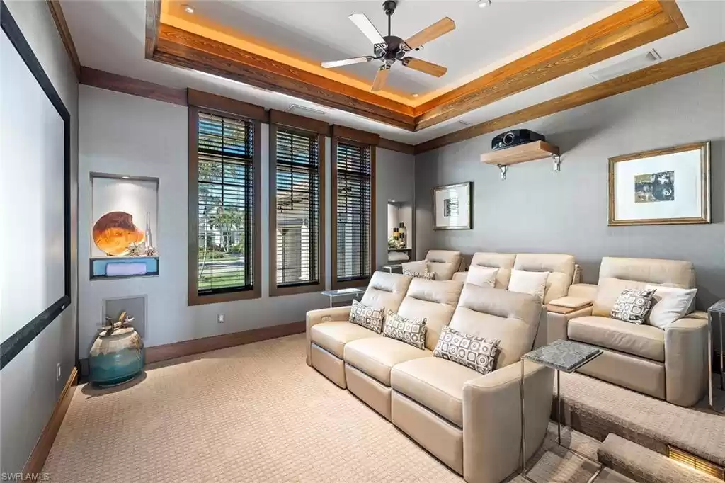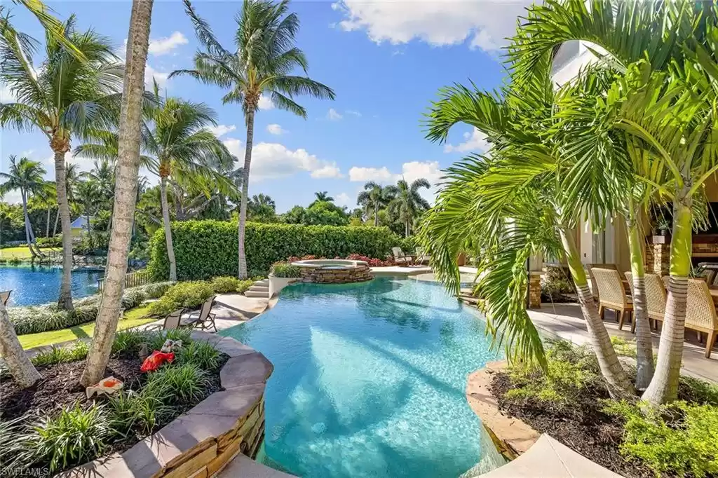 In the heart of Naples, this exquisite lakefront estate home is the epitome of luxury, tranquility and sophistication. Designed by renowned architect John Cooney, with warm tones and a cool minimalist design, this 7,660-square-foot lakefront estate is a masterpiece. As you step through the grand entrance, you'll be captivated by the subtle elegance and meticulous attention to detail. The gourmet kitchen is a chef's dream, equipped with luxury appliances, two islands and an adjoining dining room. The adjacent living area features a gas fireplace, a wine area with double beverage refrigerators, a wet bar plus an adjacent theatre room. The primary suite is a sanctuary with sitting area, a spa-like en-suite bath and attached fitness room. The covered lanai creates a seamless indoor-outdoor living experience featuring a gas fireplace and ample space for lounging and dining with panoramic lake views. A separate guest cabana overlooks the spectacular infinity pool, multiple sitting areas and lake. Just three blocks from the beach and minutes from 5th Avenue South, Bougainvillea Road offers a serene escape amid luxurious residences and manicured tropical landscapes.