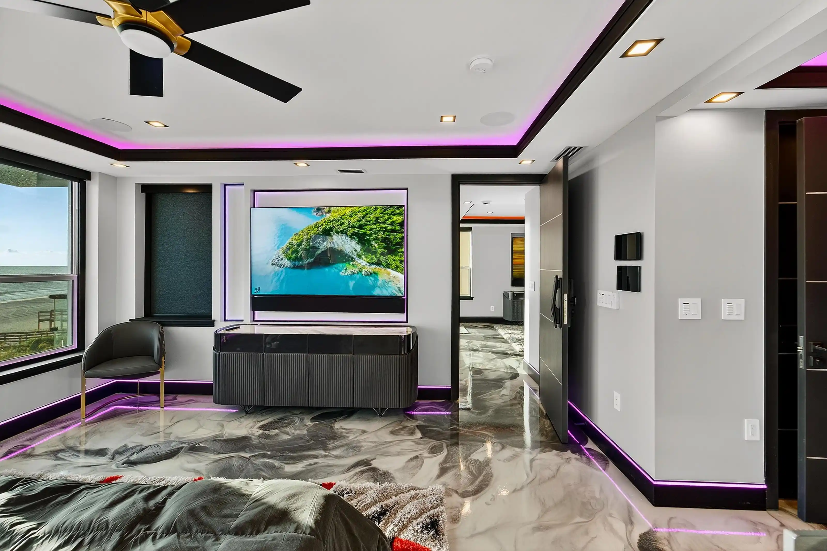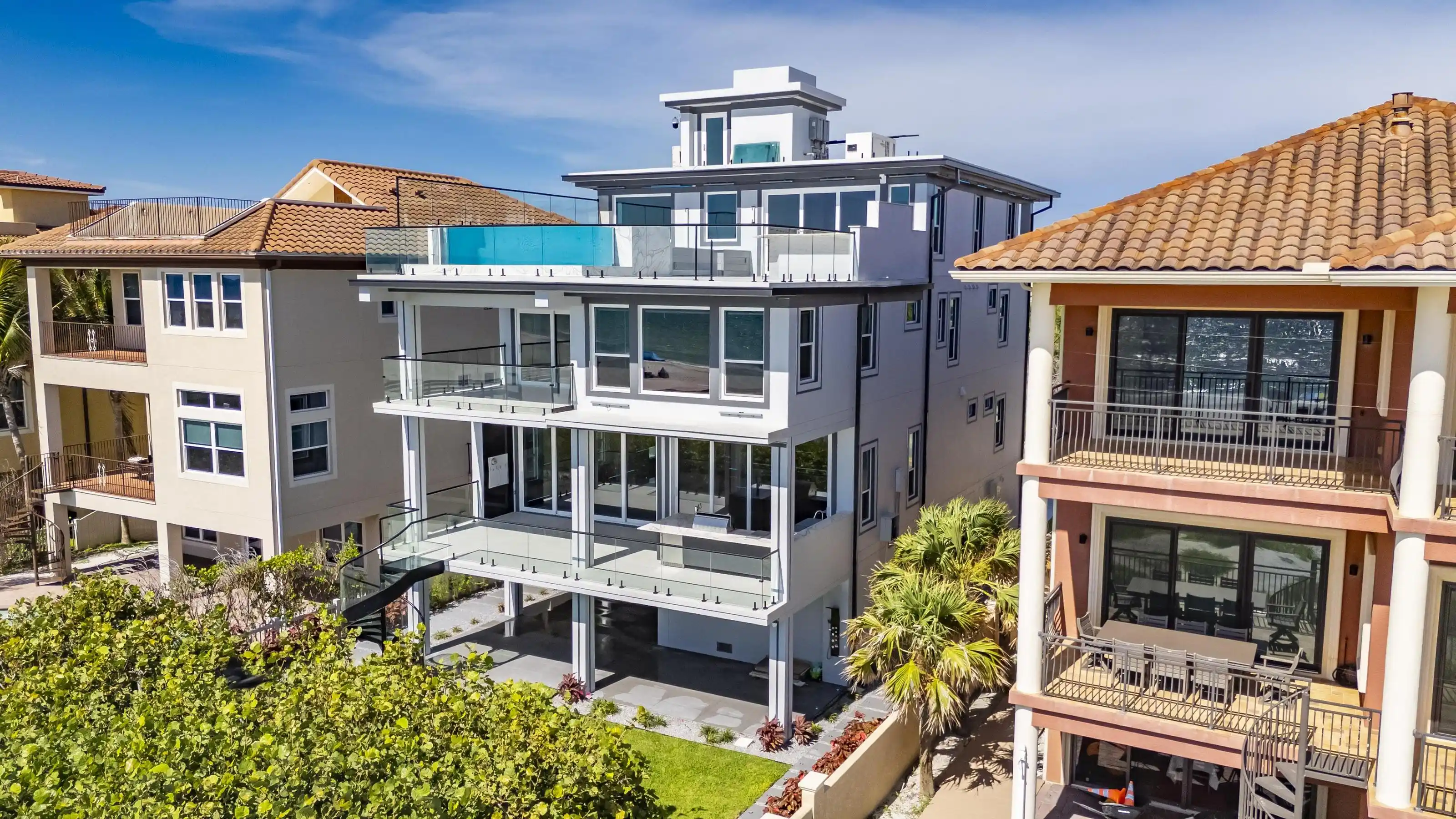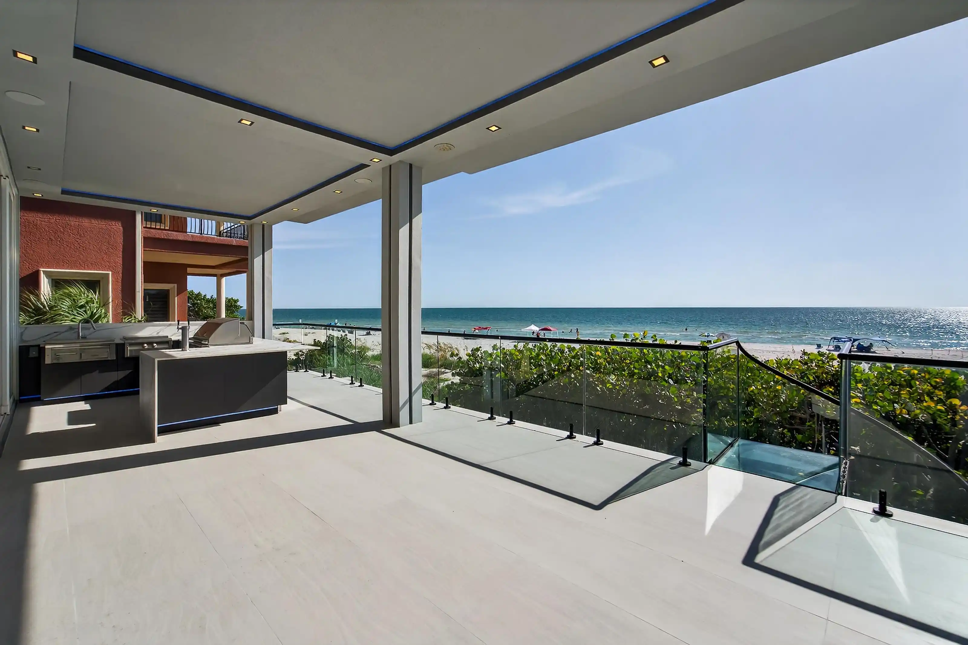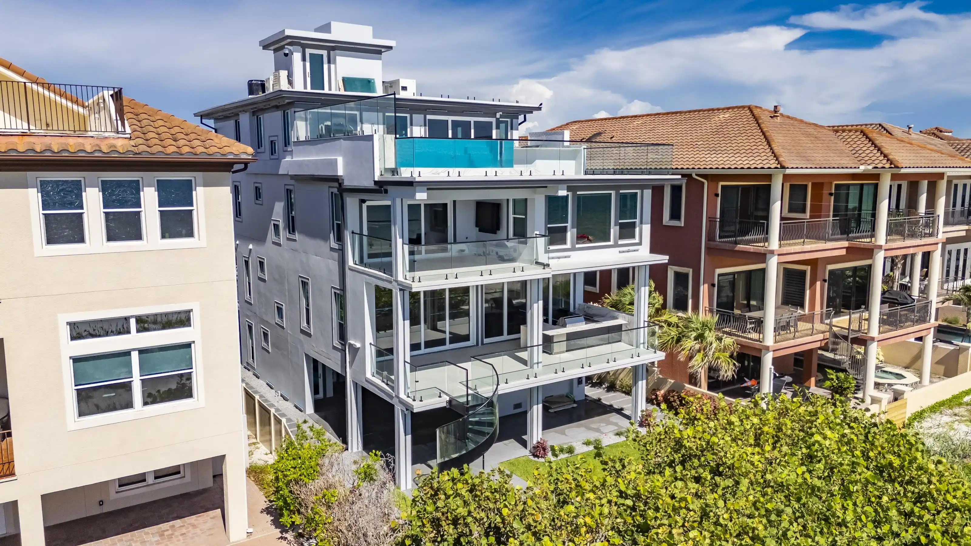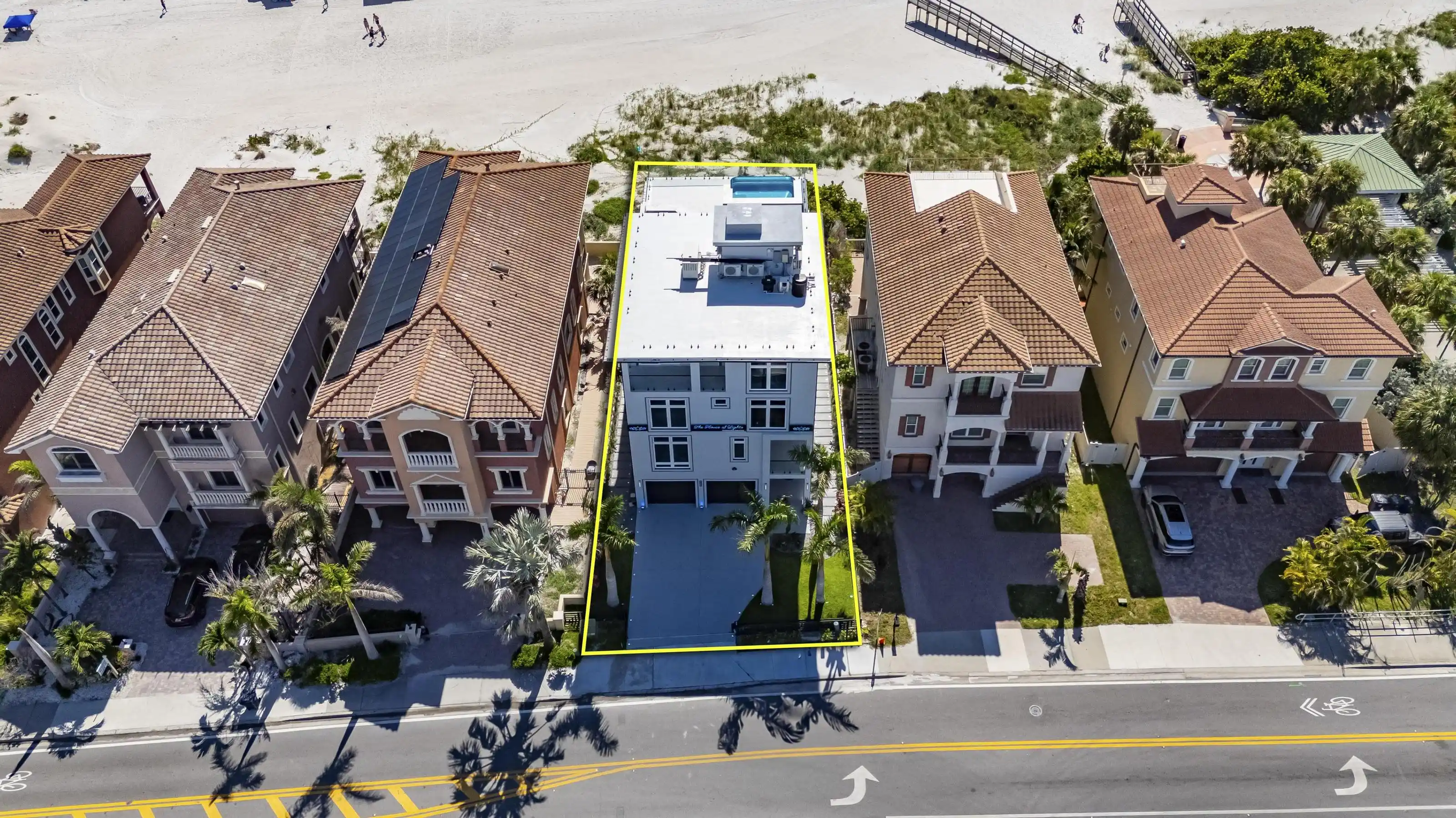 Experience beachfront luxury in this 2025 custom concrete-built home on Treasure Island. Elevated 18 feet above sea level, this 5-bed, 7-bath residence offers 5,198 sq ft of high-end living, complete with a 32kW generator, Tesla chargers, and rooftop infinity pool. The main level features open living, a chef’s kitchen with double ovens, espresso machine, pot filler, and walk-in pantry.