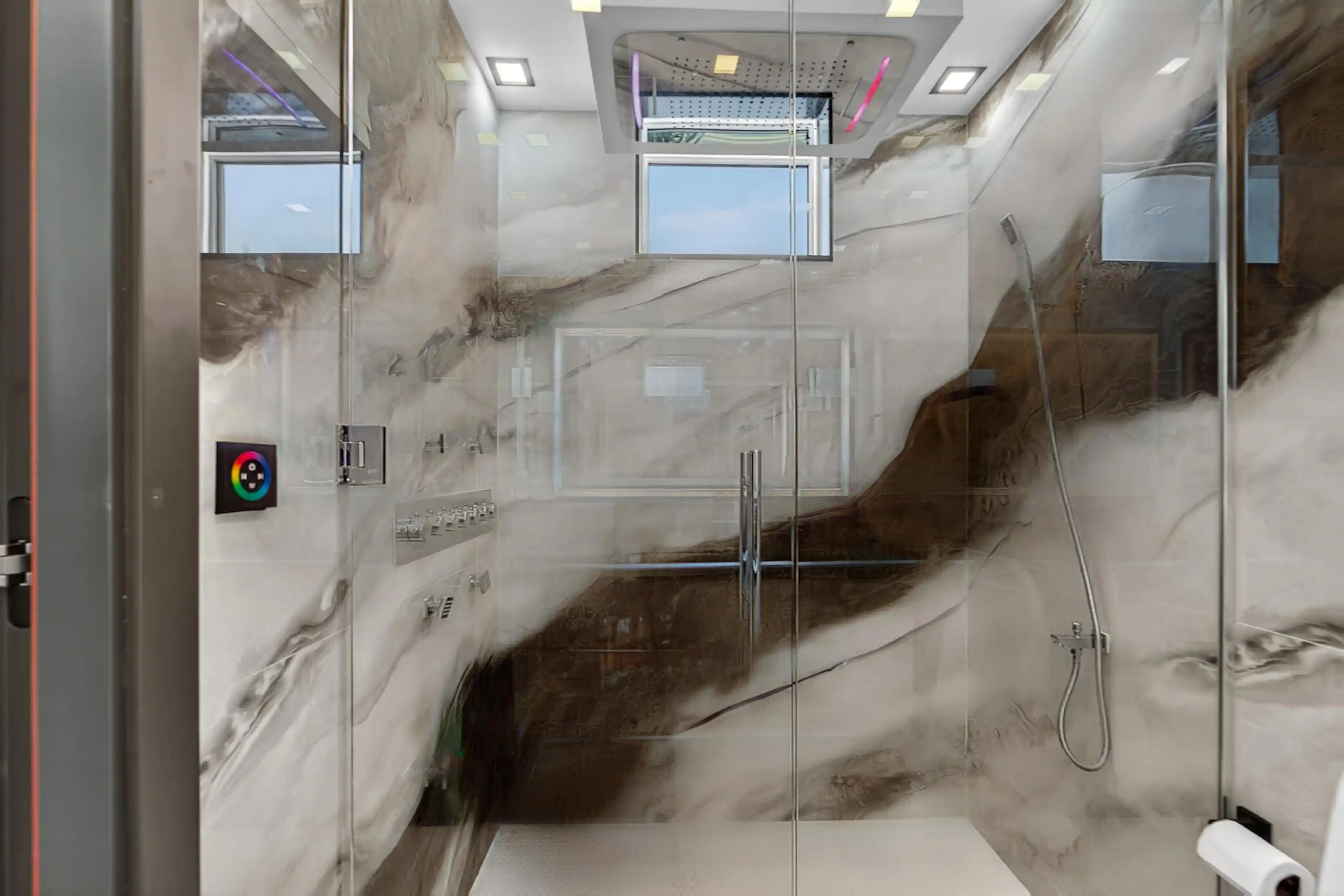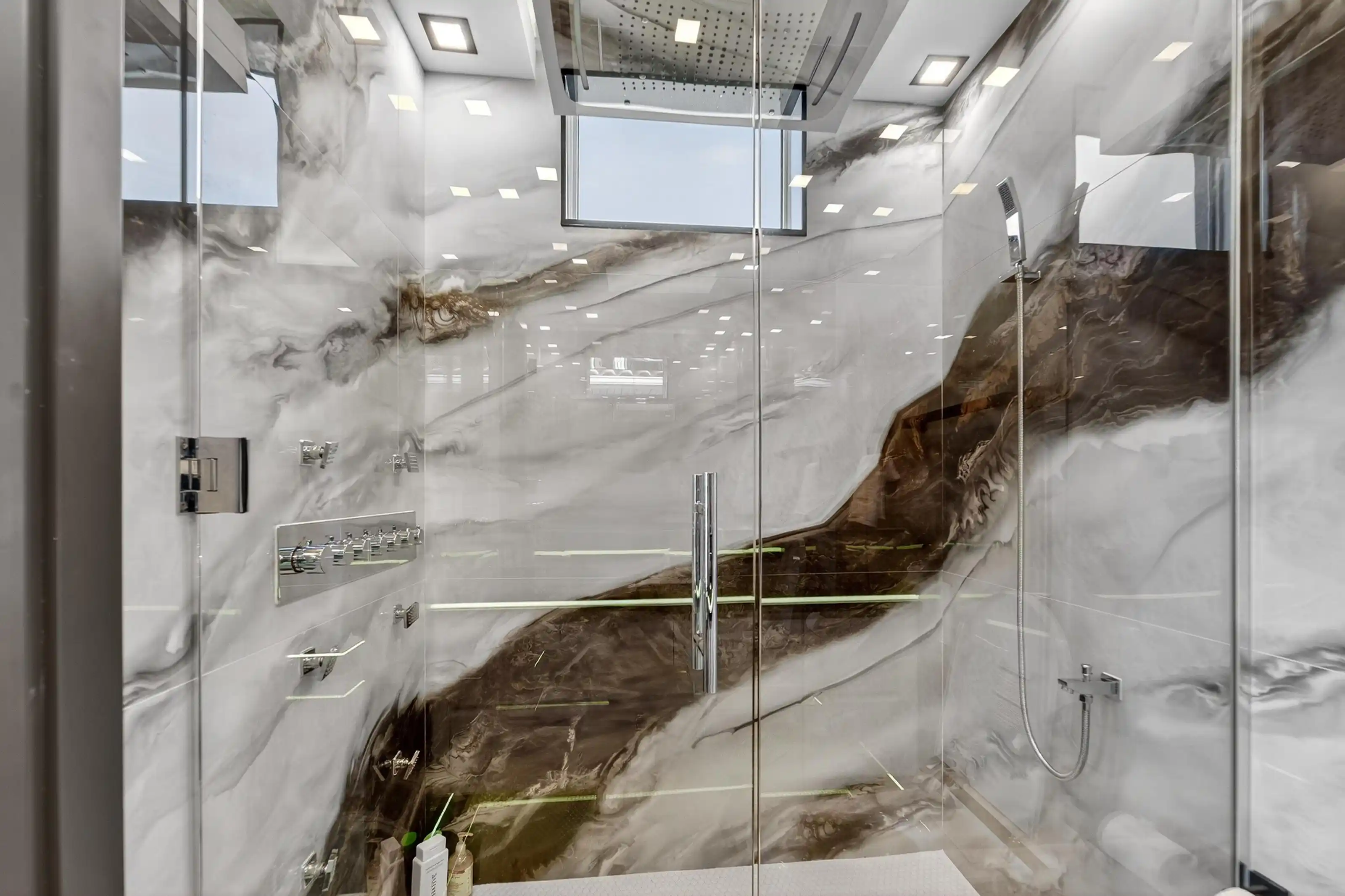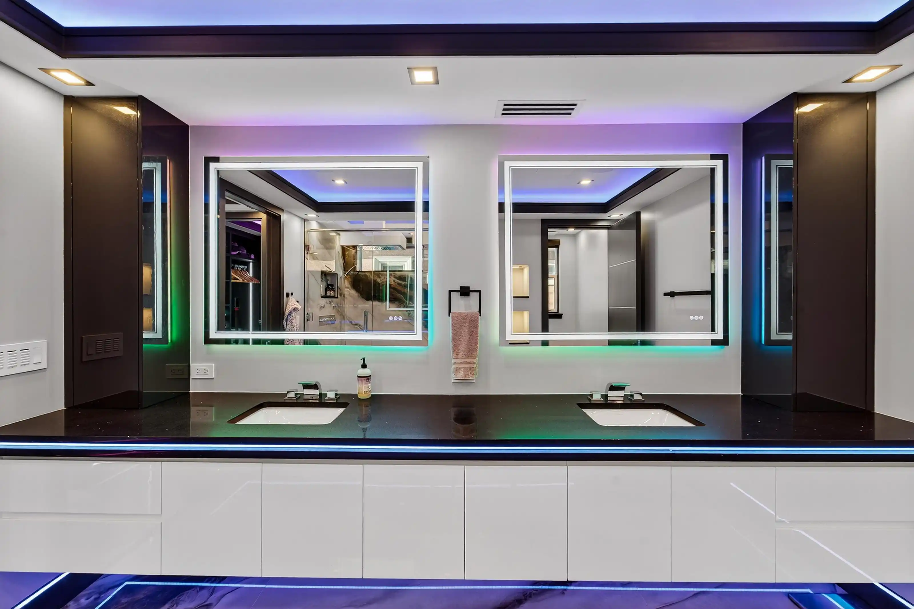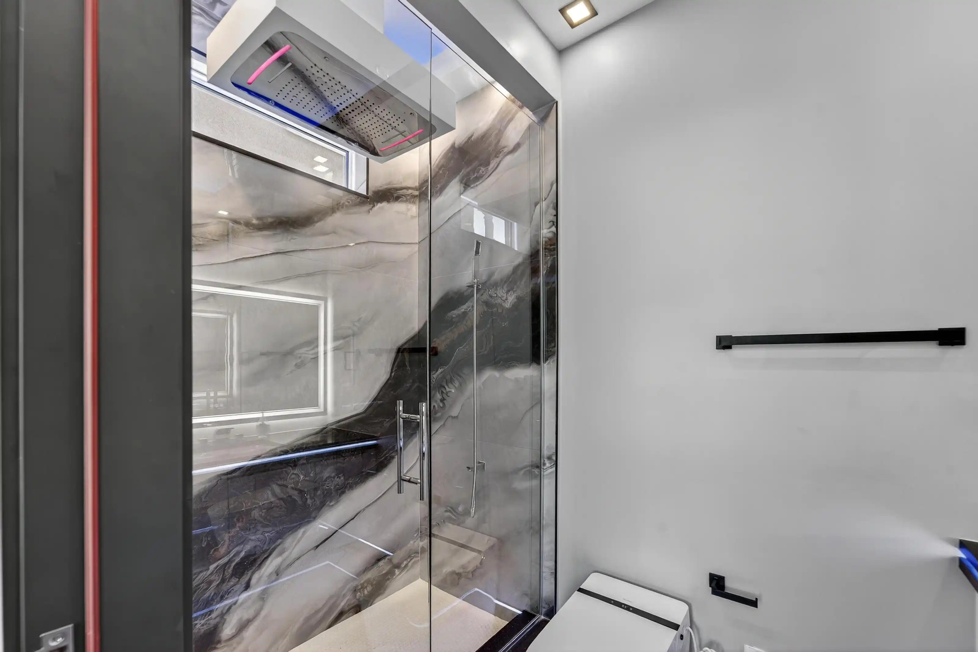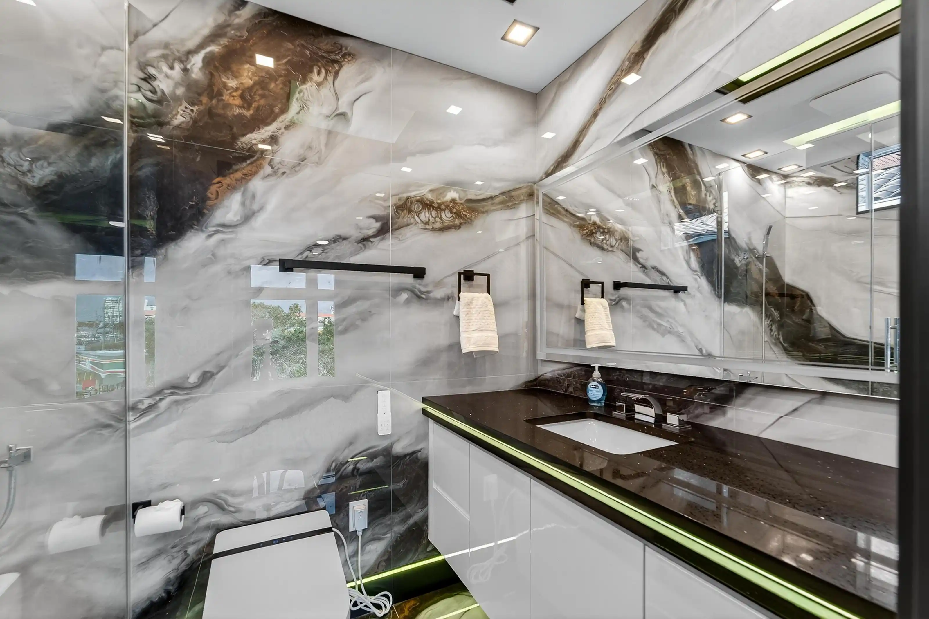 Exquisitely designed with a modern contemporary Miami/Palm Beach aesthetic, this exceptional 3/- acre new construction estate is the true essence of Water Mill opulence. The fully furnished 9,400 SF residence features 8 en-suite bedrooms, 12 bathrooms, a heated gunite pool with hot tub, a glass pool house, and an all-weather tennis court.