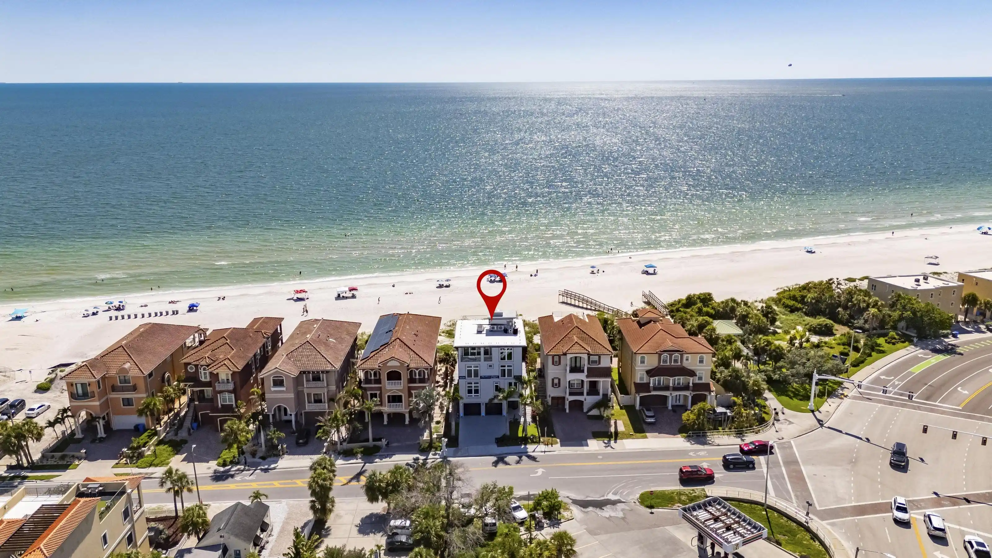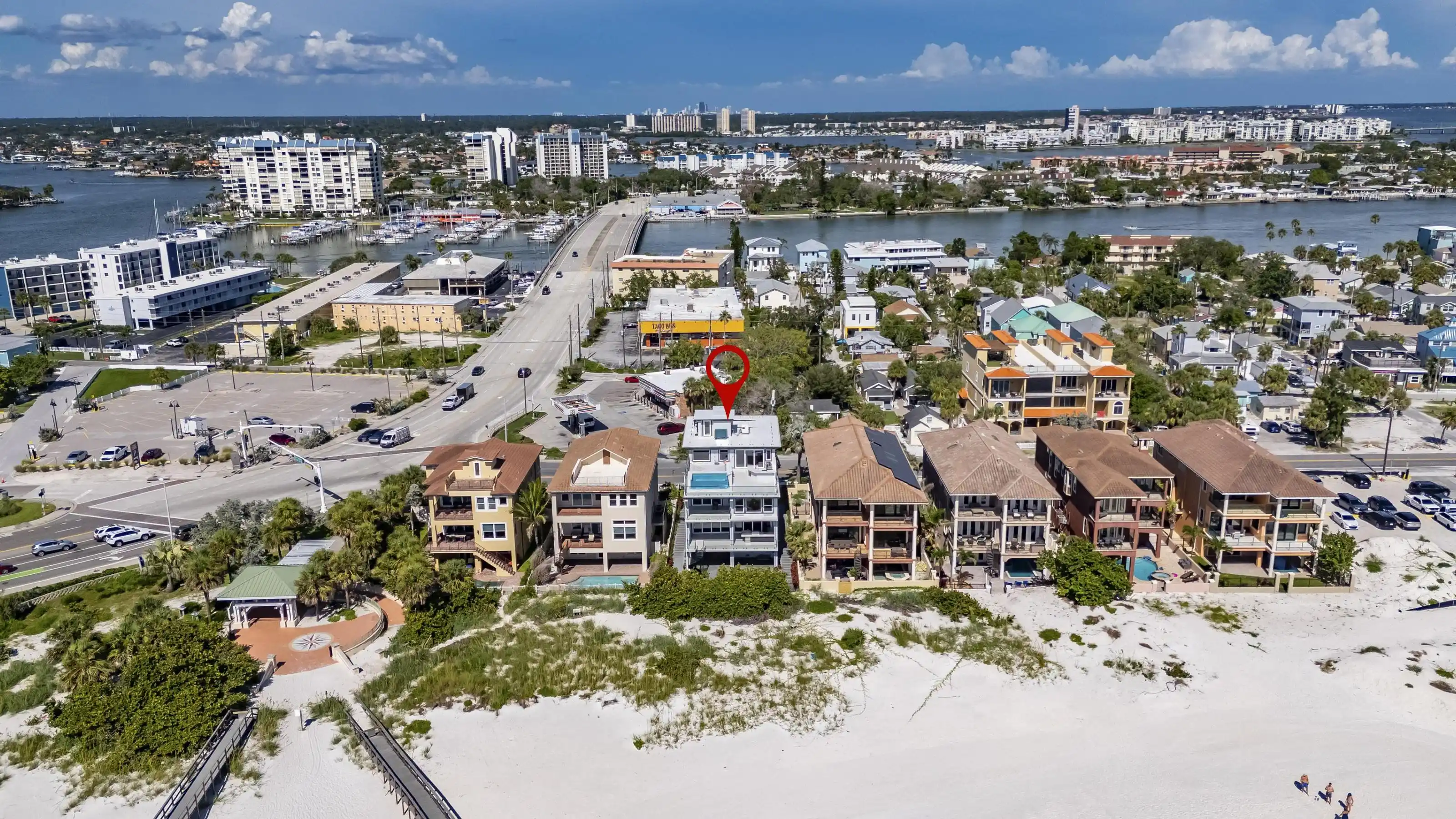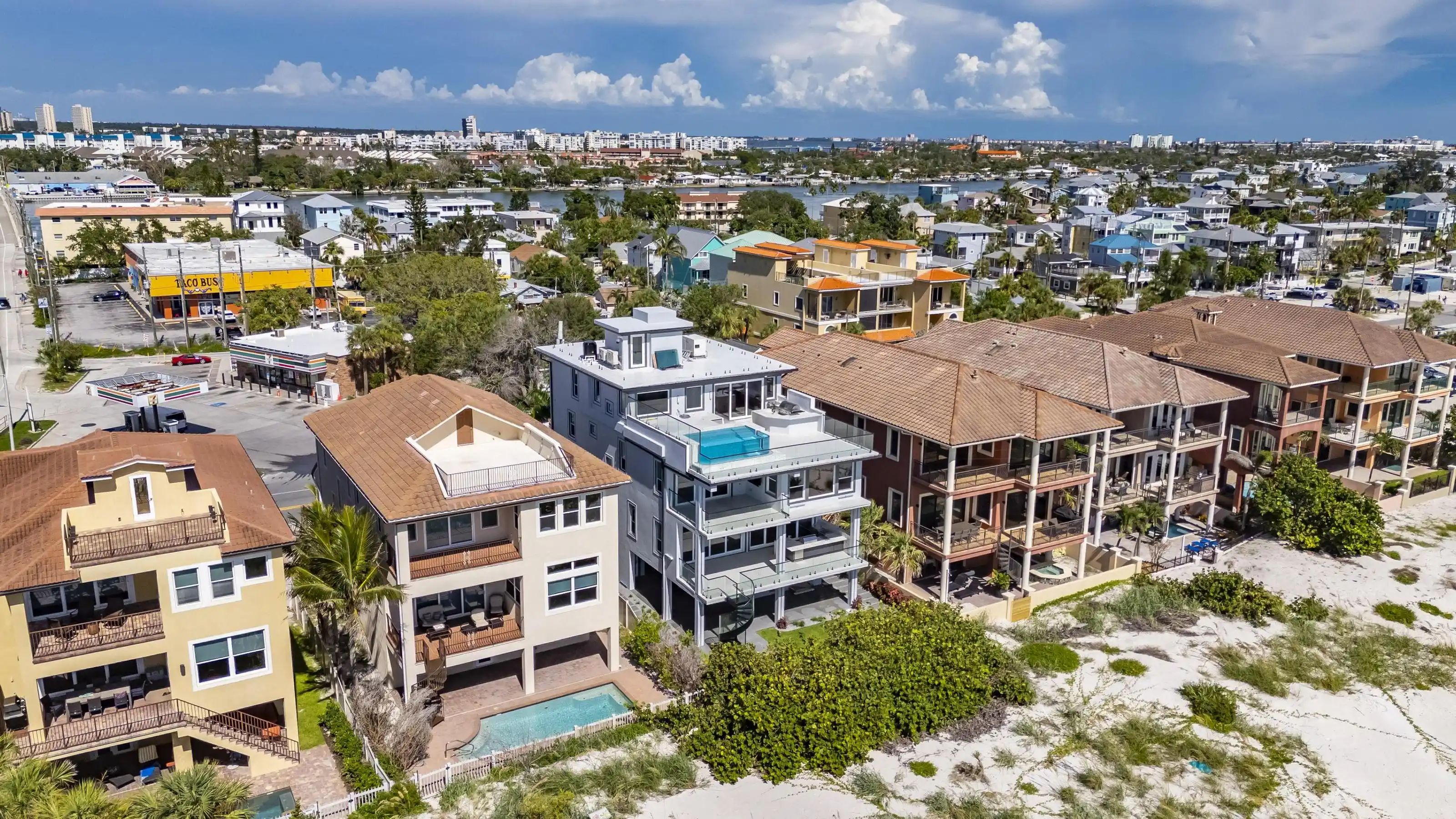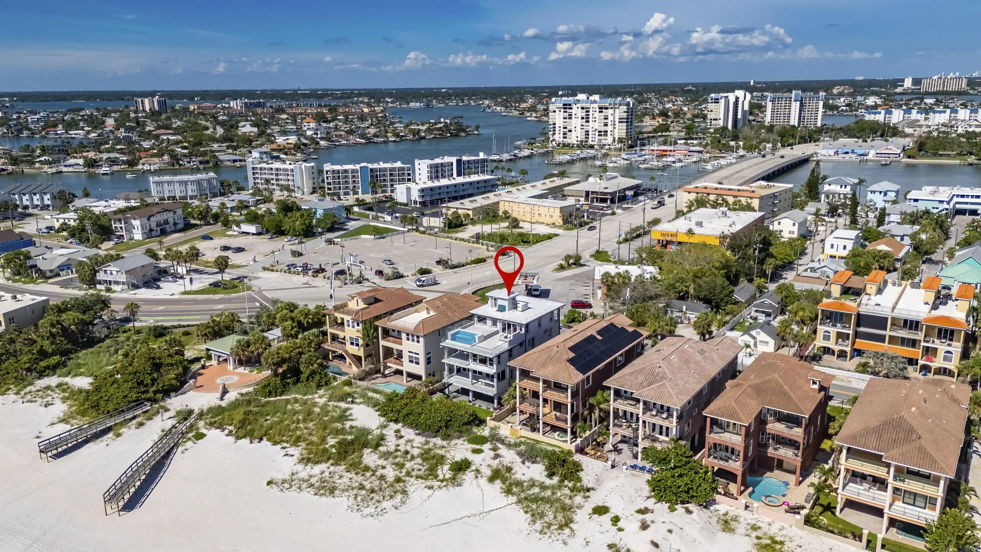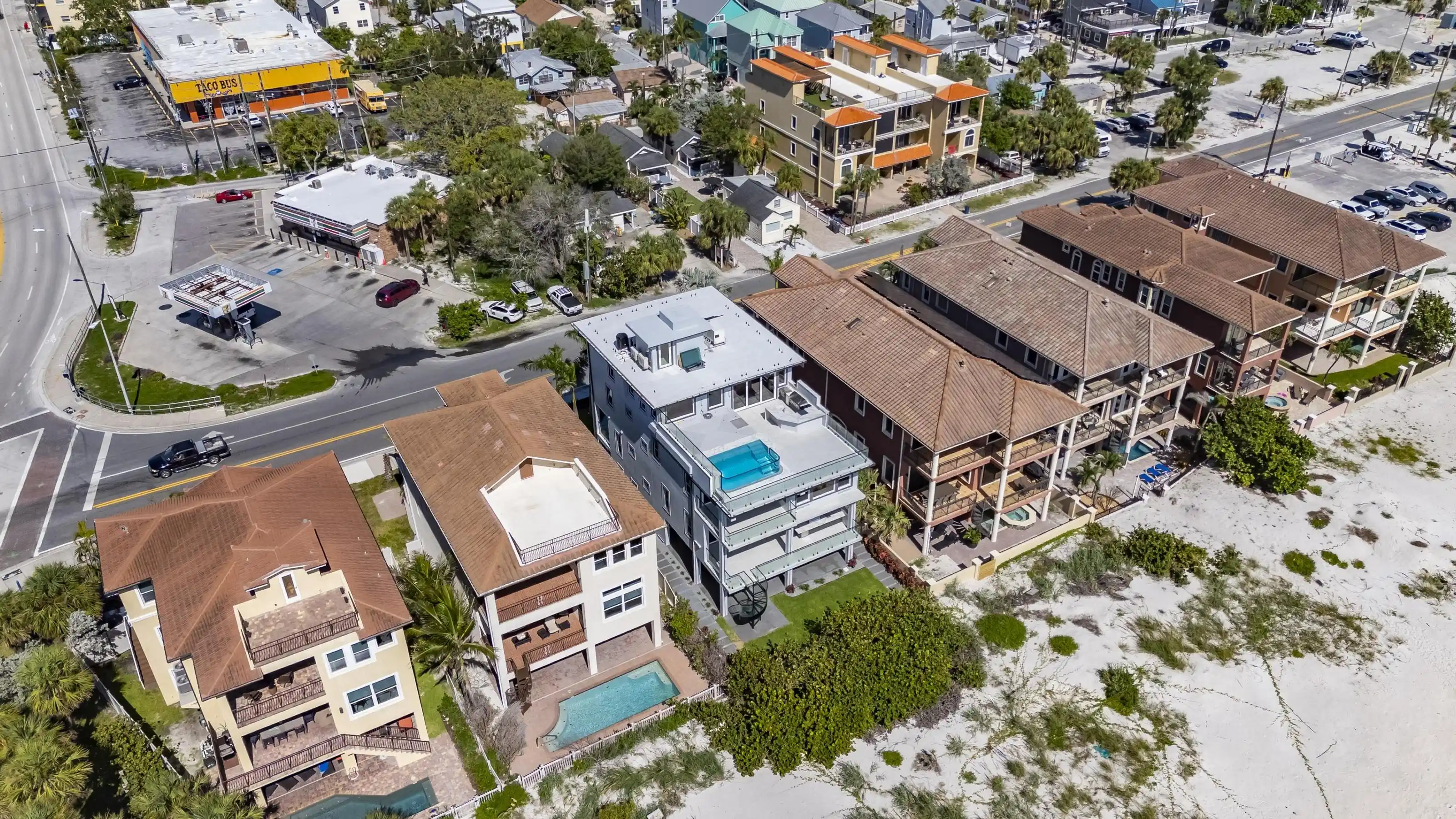 Experience beachfront luxury in this 2025 custom concrete-built home on Treasure Island. Elevated 18 feet above sea level, this 5-bed, 7-bath residence offers 5,198 sq ft of high-end living, complete with a 32kW generator, Tesla chargers, and rooftop infinity pool. The main level features open living, a chef’s kitchen with double ovens, espresso machine, pot filler, and walk-in pantry. Upstairs offers multiple guest suites, a second living area, and a spacious primary with balcony and spa bath. The rooftop includes a pool, summer kitchen, and indoor flex space for entertaining, fitness, or media. Additional highlights: glass elevator, full concrete structure with deep pilings, smart home tech, and no HOA/CDD. Located steps from the sand and minutes to dining and shops.