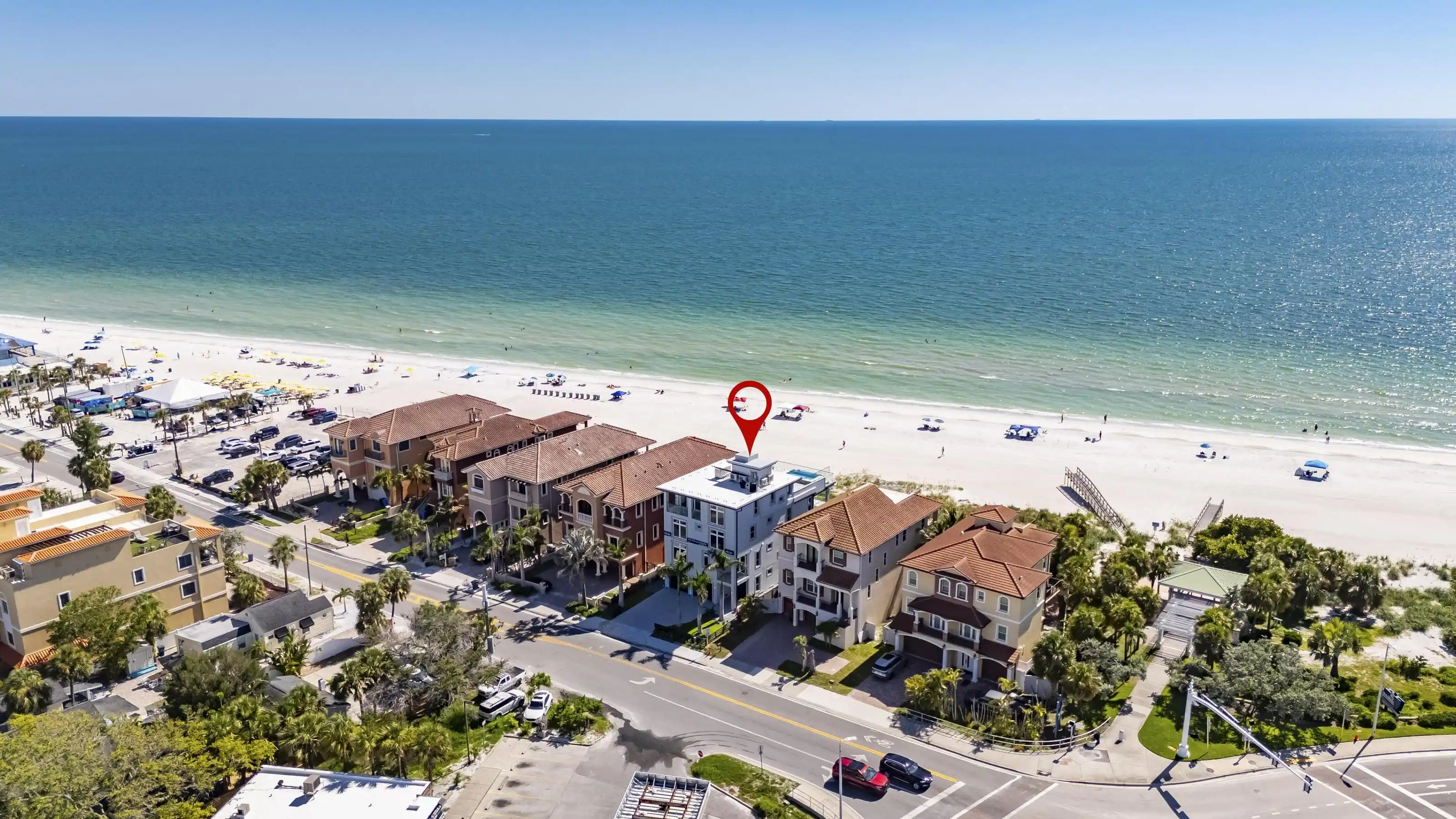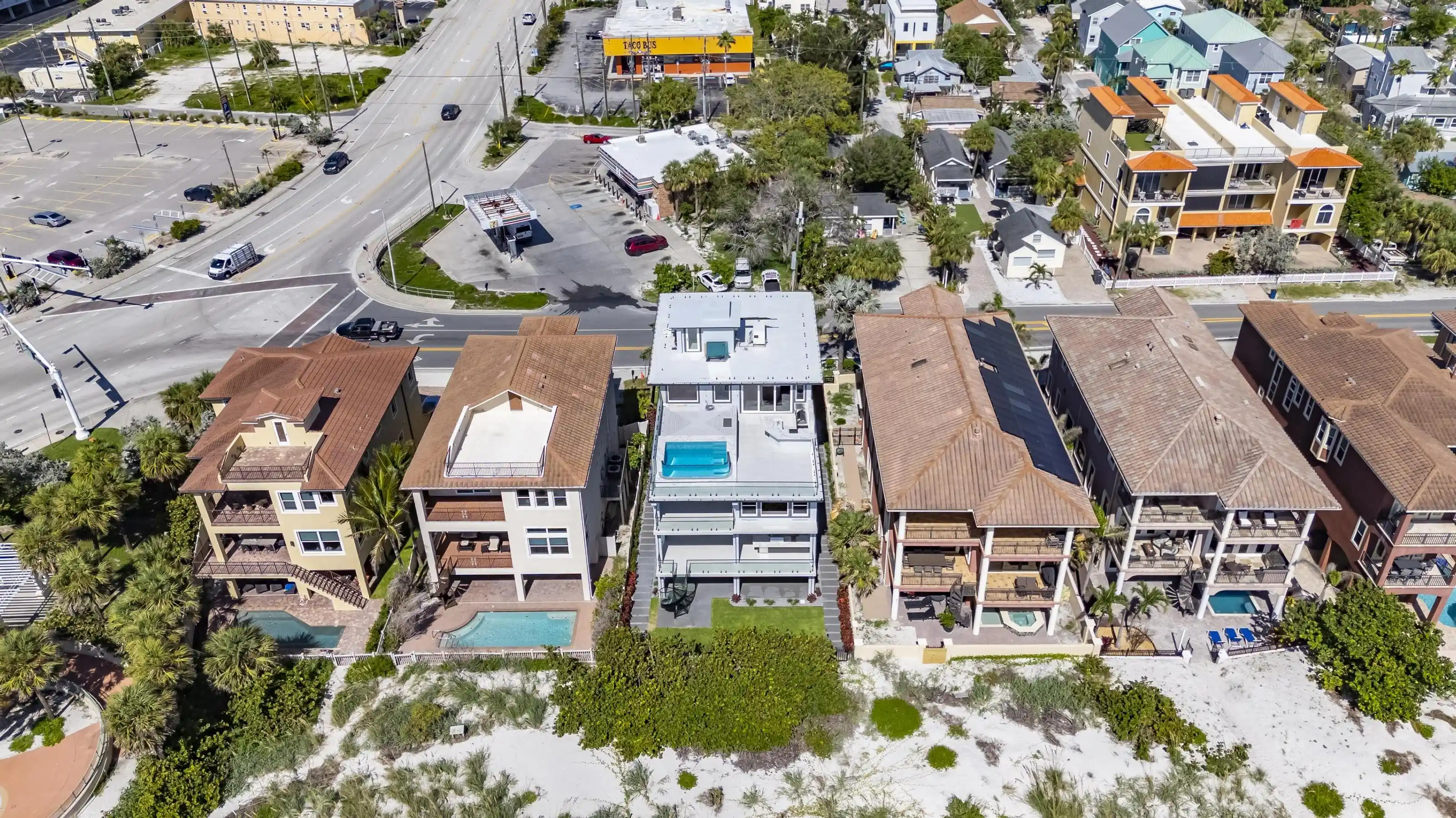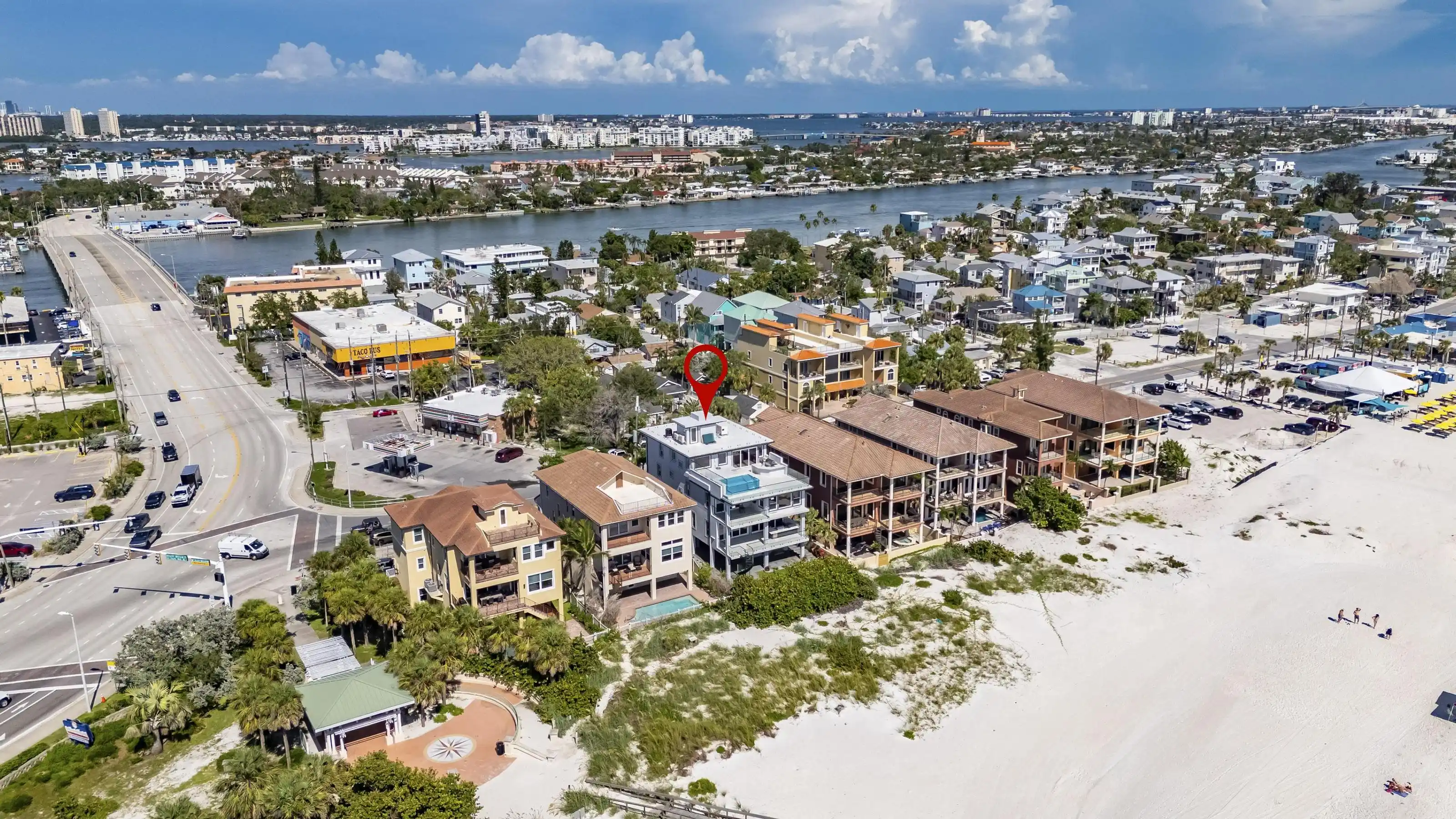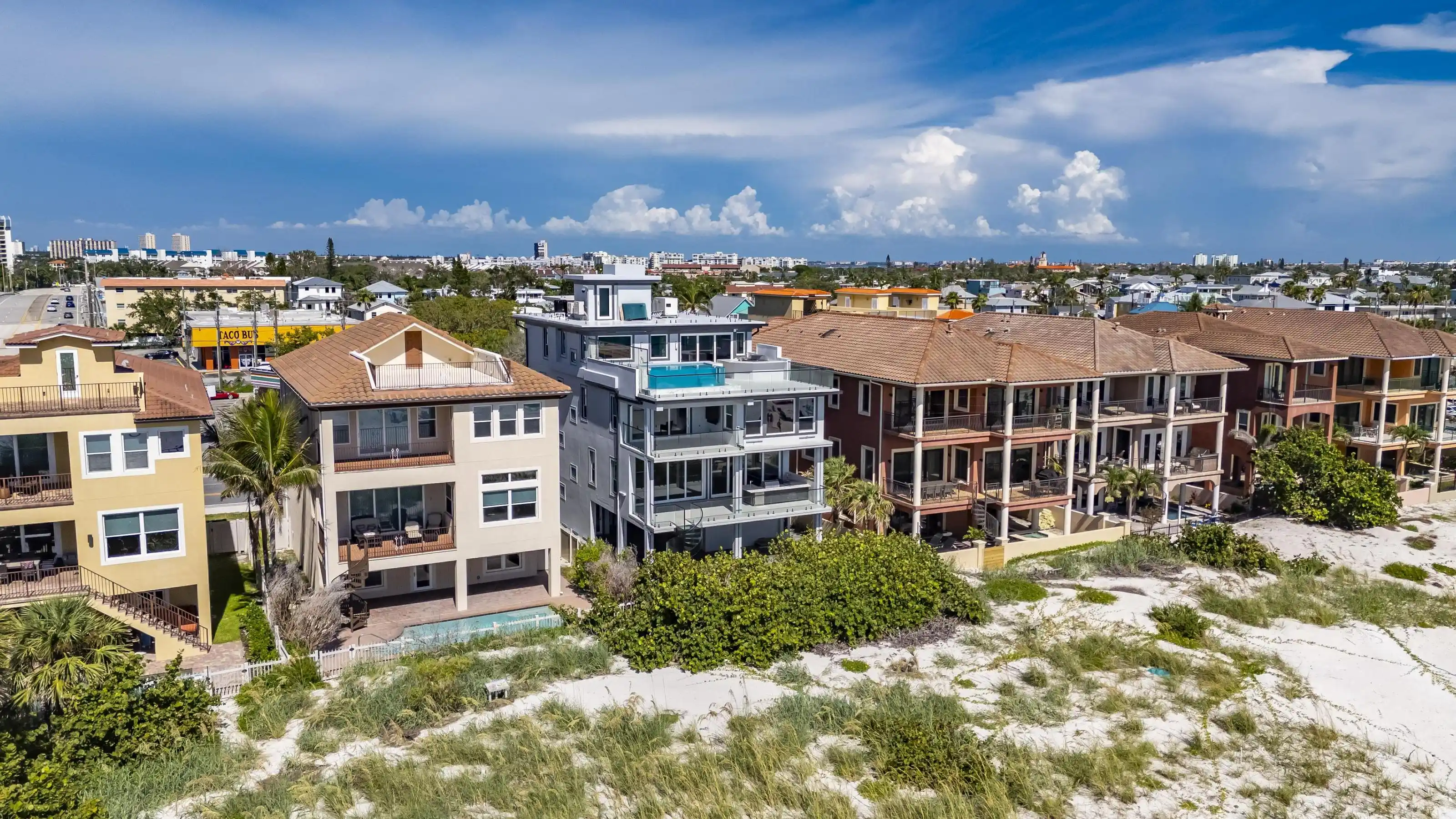Experience beachfront luxury in this 2025 custom concrete-built home on Treasure Island. Elevated 18 feet above sea level, this 5-bed, 7-bath residence offers 5,198 sq ft of high-end living, complete with a 32kW generator, Tesla chargers, and rooftop infinity pool. The main level features open living, a chef’s kitchen with double ovens, espresso machine, pot filler, and walk-in pantry. Upstairs offers multiple guest suites, a second living area, and a spacious primary with balcony and spa bath. The rooftop includes a pool, summer kitchen, and indoor flex space for entertaining, fitness, or media. Additional highlights: glass elevator, full concrete structure with deep pilings, smart home tech, and no HOA/CDD. Located steps from the sand and minutes to dining and shops.