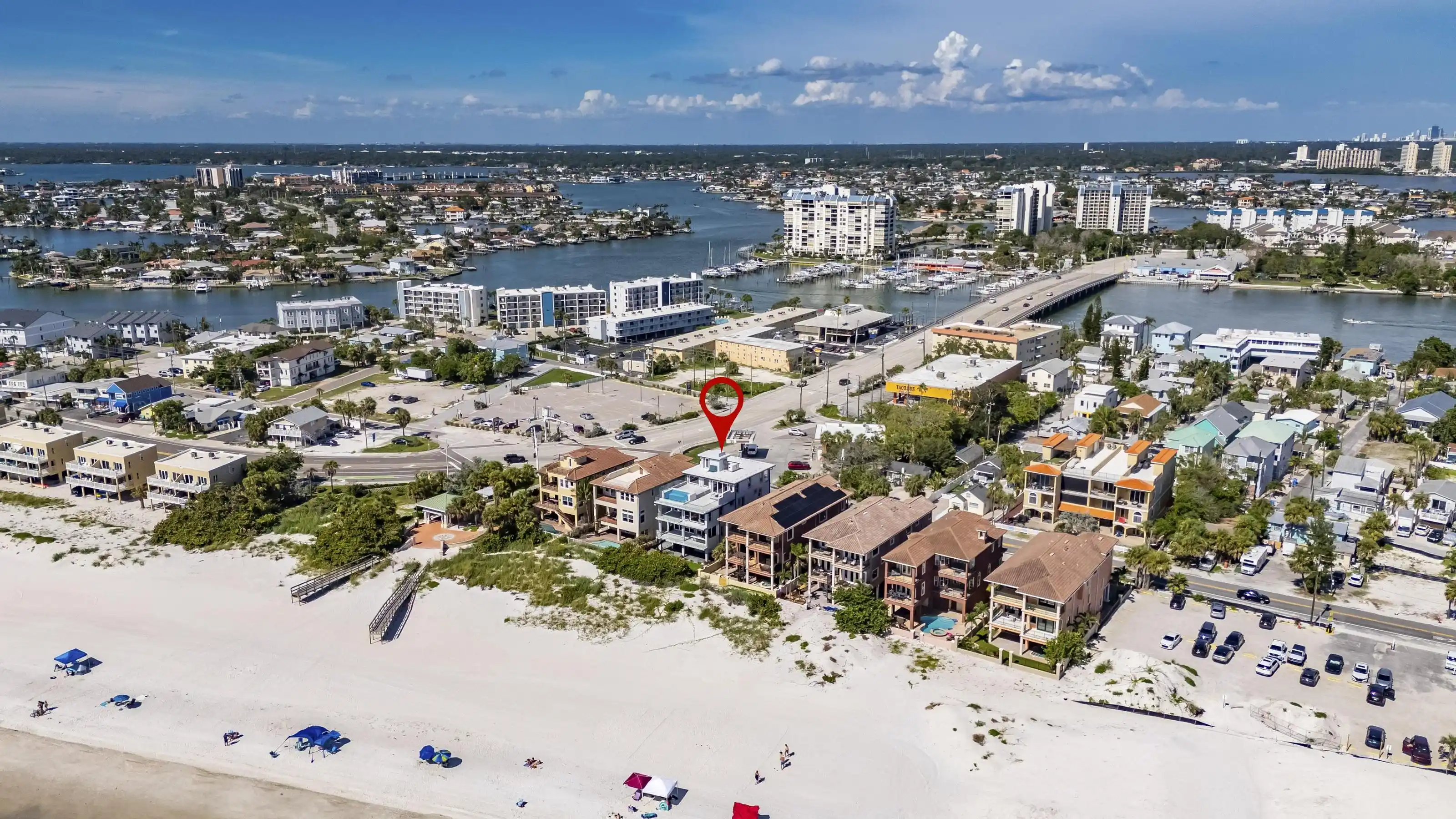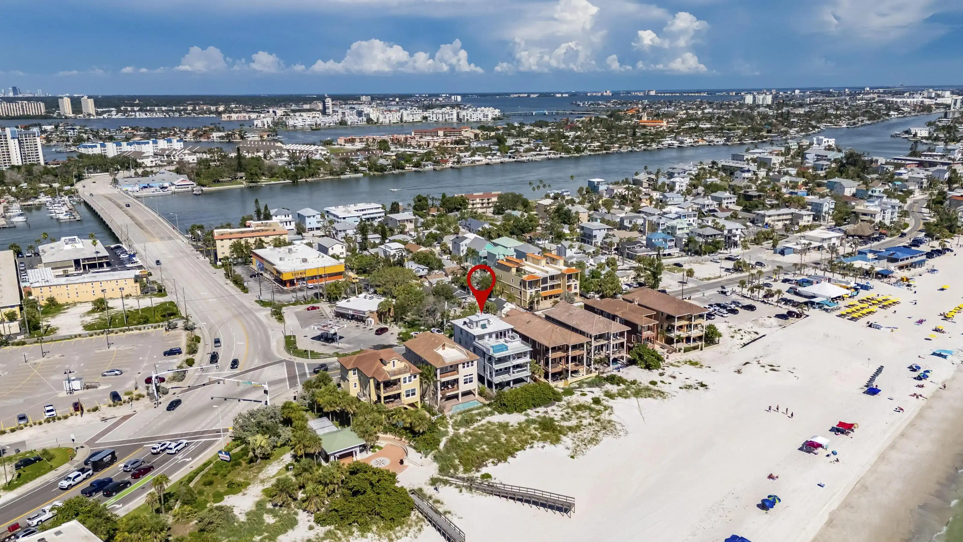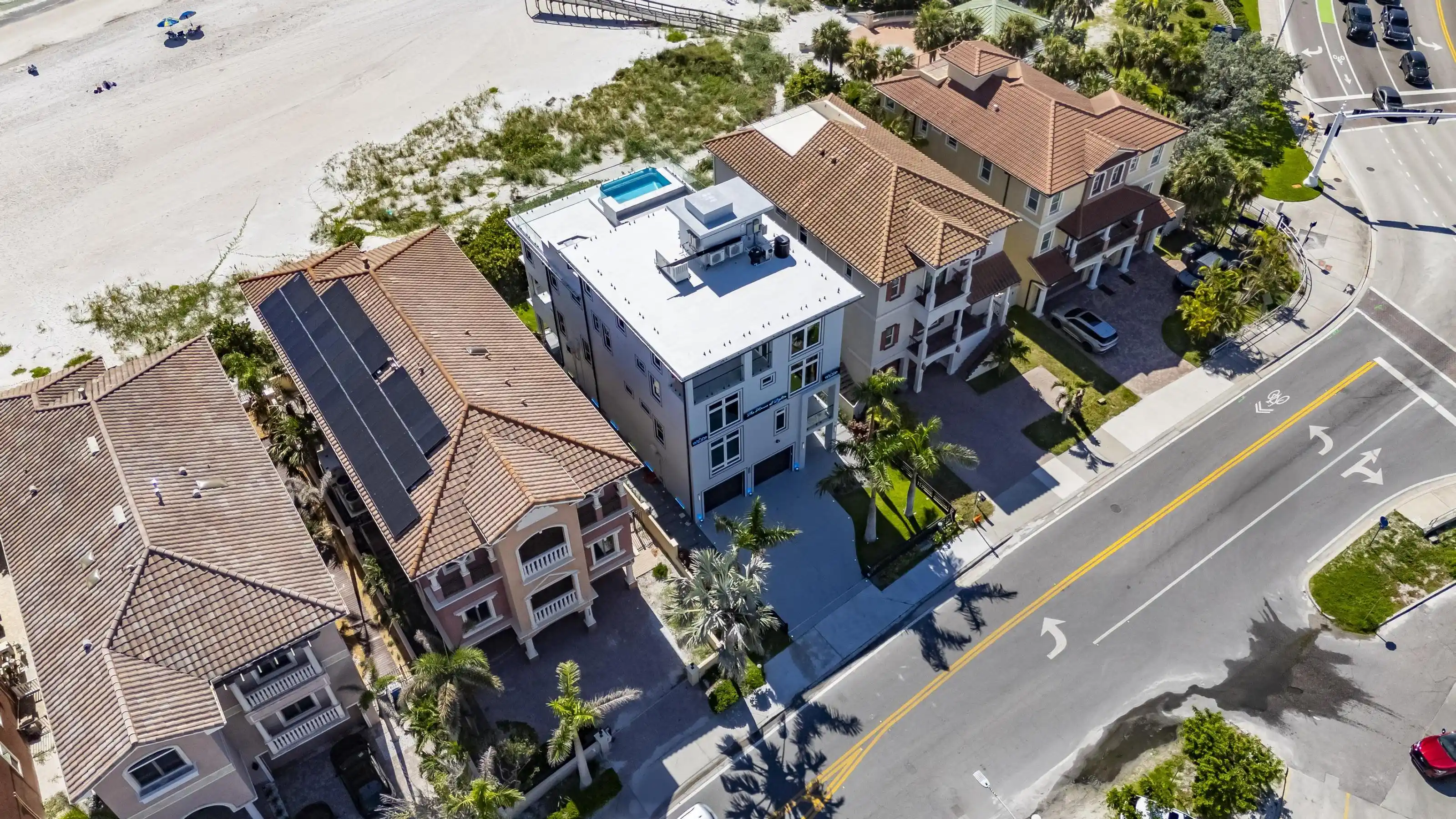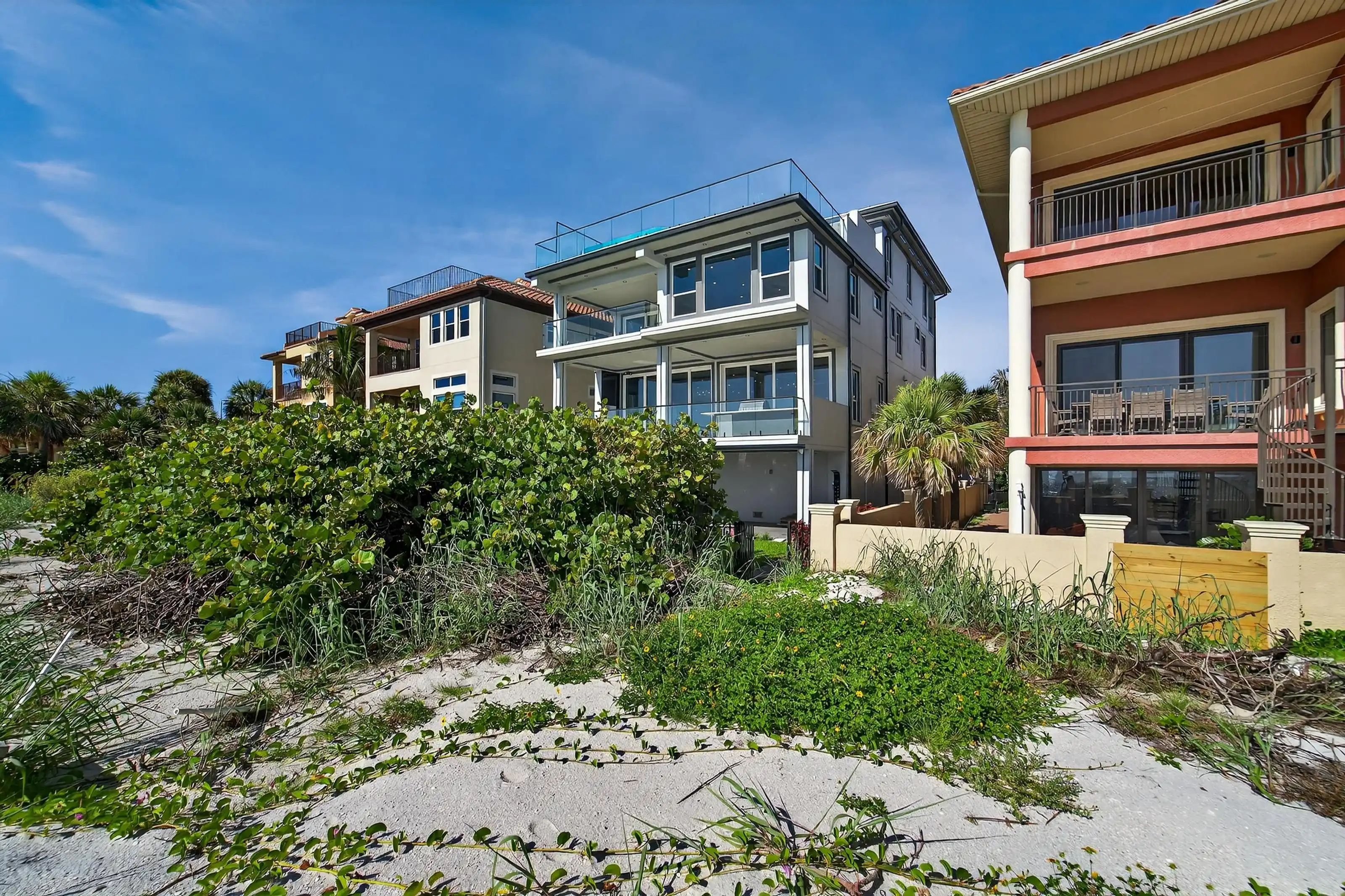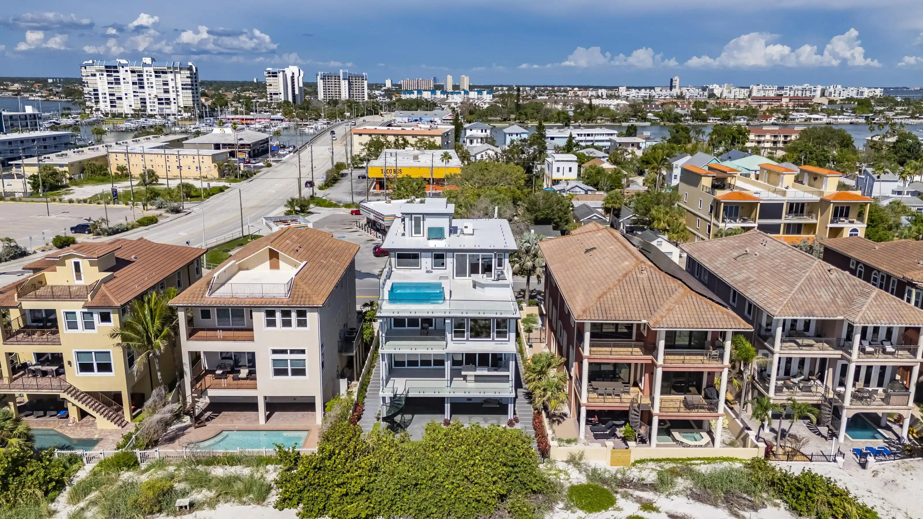 Experience beachfront luxury in this 2025 custom concrete-built home on Treasure Island. Elevated 18 feet above sea level, this 5-bed, 7-bath residence offers 5,198 sq ft of high-end living, complete with a 32kW generator, Tesla chargers, and rooftop infinity pool. The main level features open living, a chef’s kitchen with double ovens, espresso machine, pot filler, and walk-in pantry. Upstairs offers multiple guest suites, a second living area, and a spacious primary with balcony and spa bath. The rooftop includes a pool, summer kitchen, and indoor flex space for entertaining, fitness, or media. Additional highlights: glass elevator, full concrete structure with deep pilings, smart home tech, and no HOA/CDD. Located steps from the sand and minutes to dining and shops.