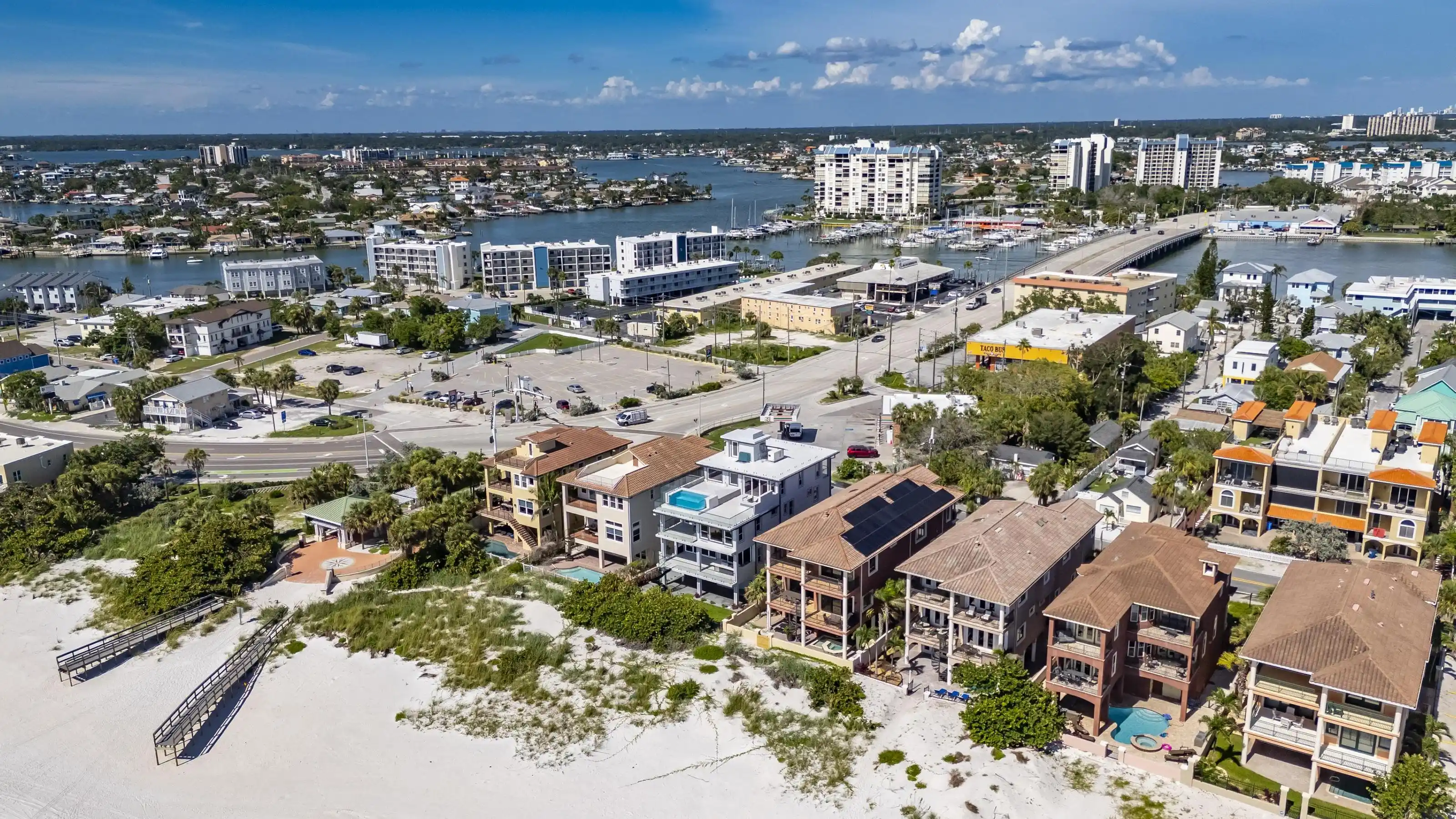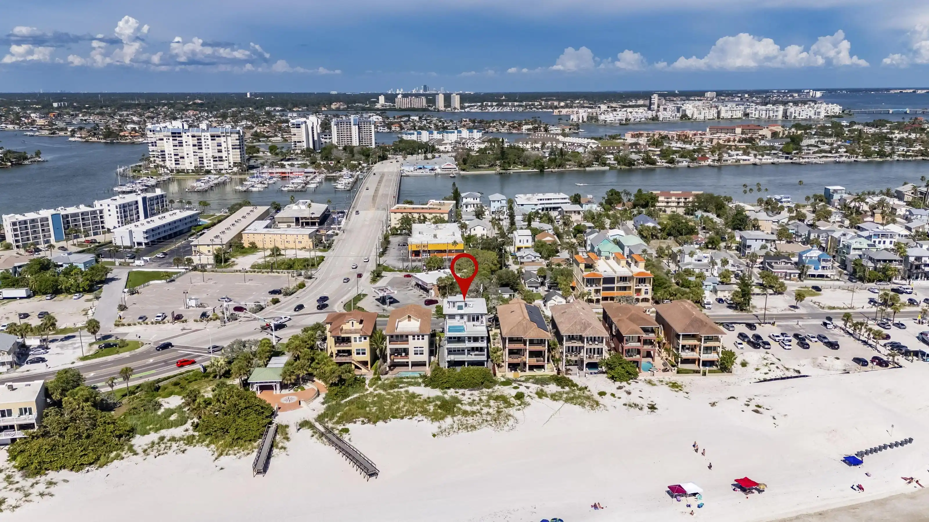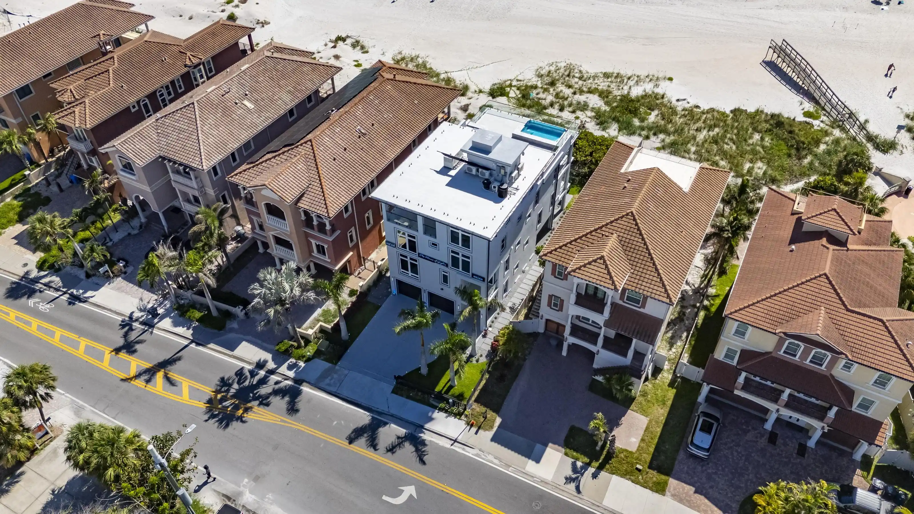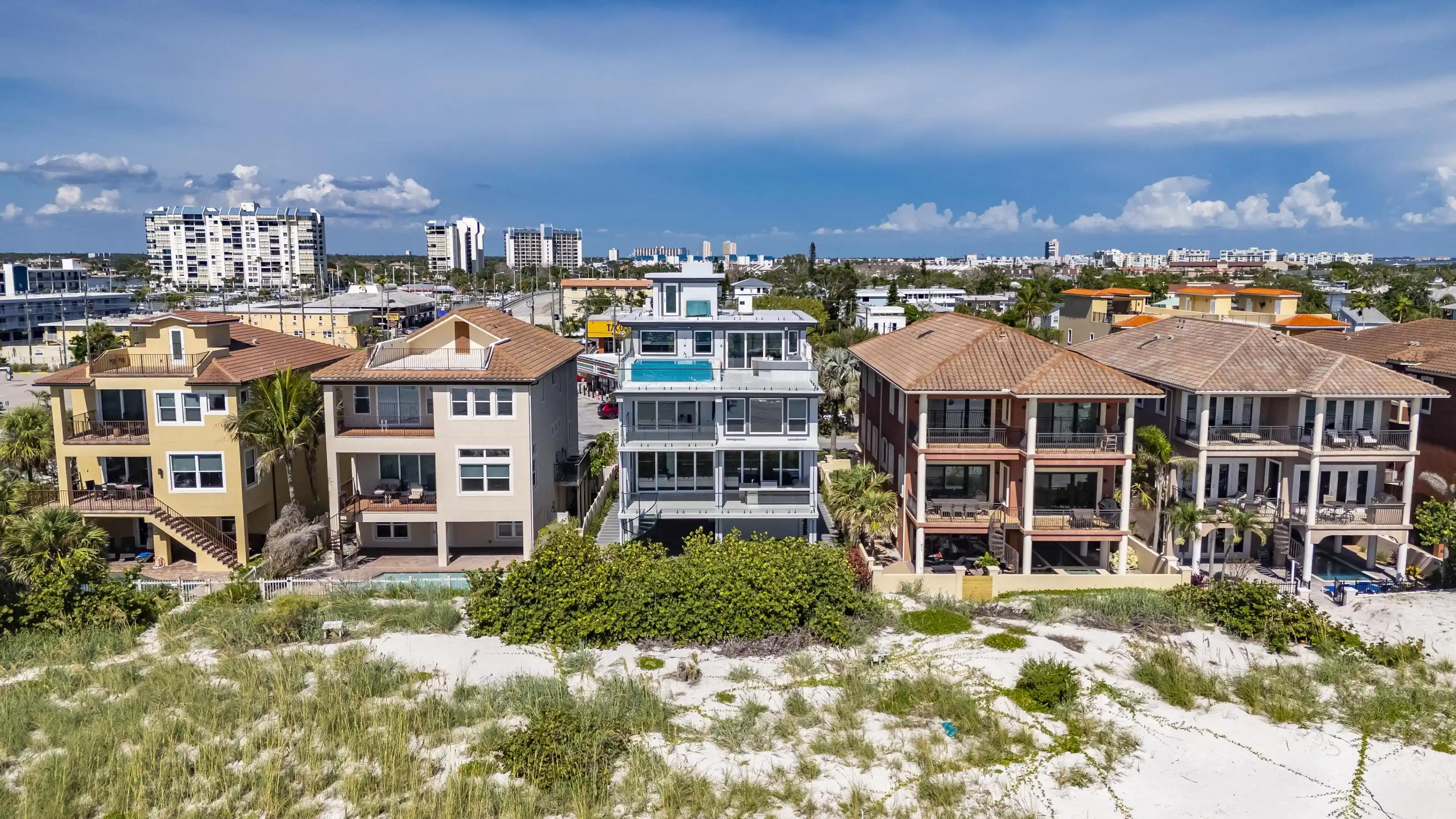 Experience beachfront luxury in this 2025 custom concrete-built home on Treasure Island. Elevated 18 feet above sea level, this 5-bed, 7-bath residence offers 5,198 sq ft of high-end living, complete with a 32kW generator, Tesla chargers, and rooftop infinity pool. The main level features open living, a chef’s kitchen with double ovens, espresso machine, pot filler, and walk-in pantry. Upstairs offers multiple guest suites, a second living area, and a spacious primary with balcony and spa bath. The rooftop includes a pool, summer kitchen, and indoor flex space for entertaining, fitness, or media. Additional highlights: glass elevator, full concrete structure with deep pilings, smart home tech, and no HOA/CDD. Located steps from the sand and minutes to dining and shops.