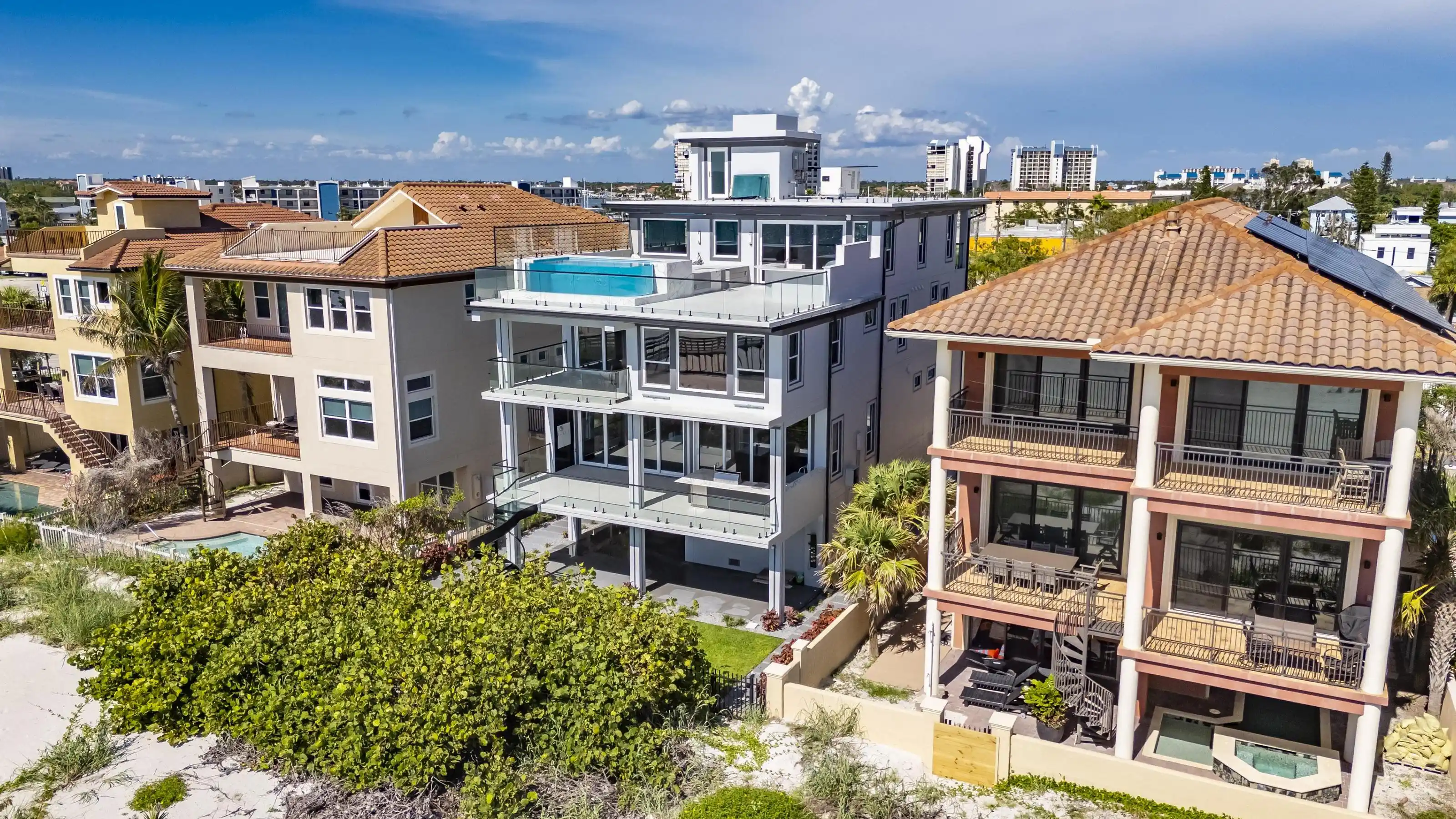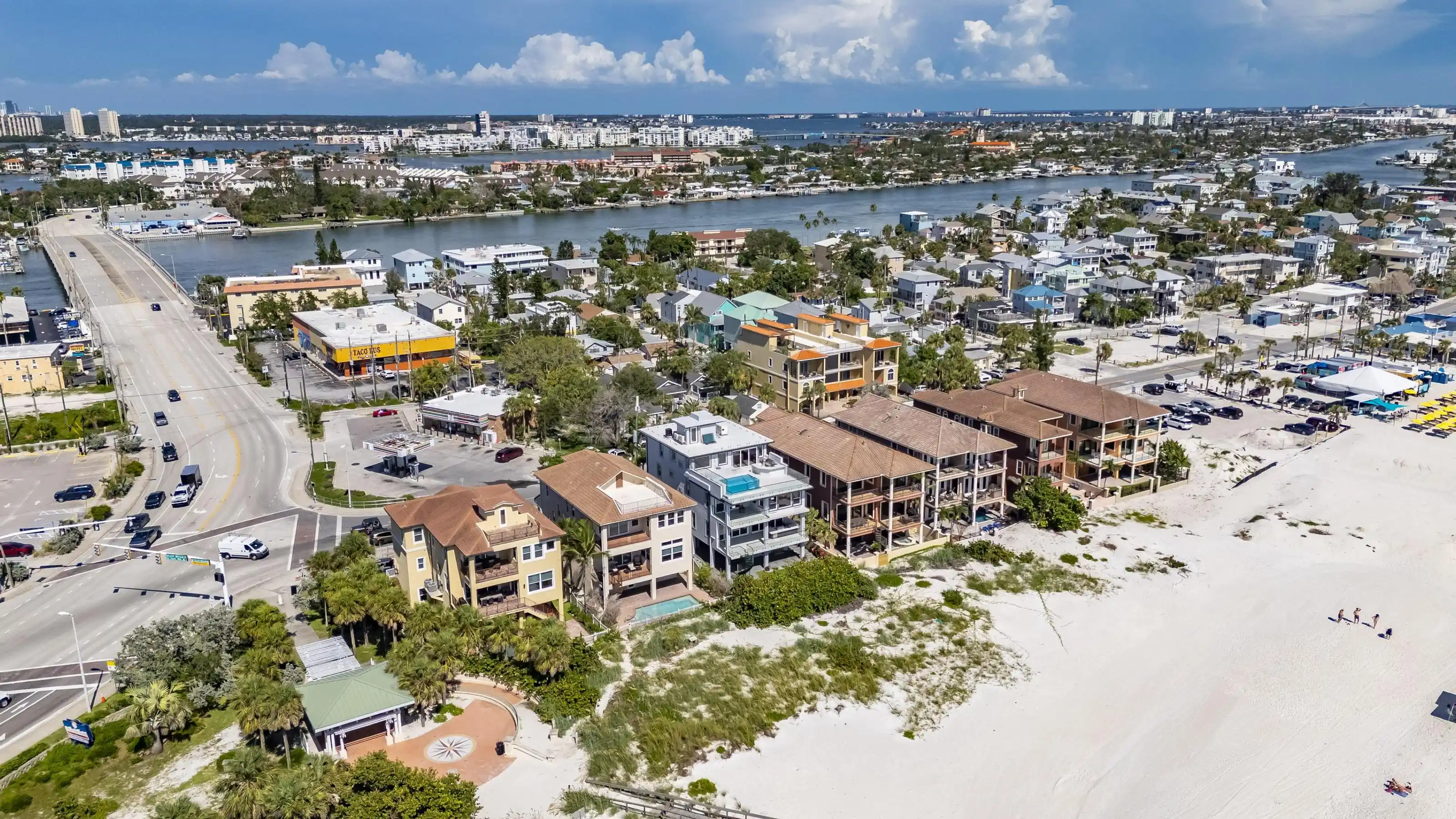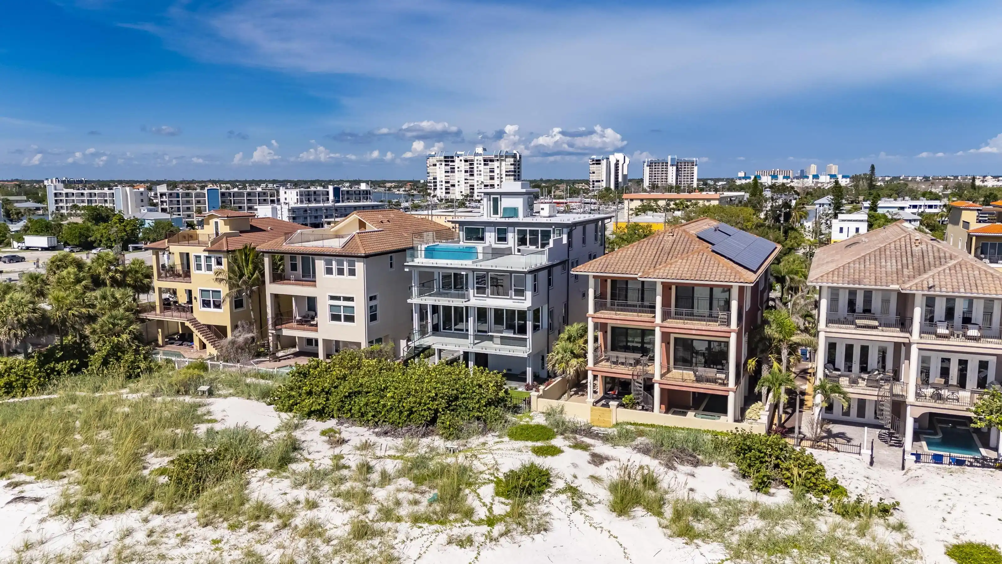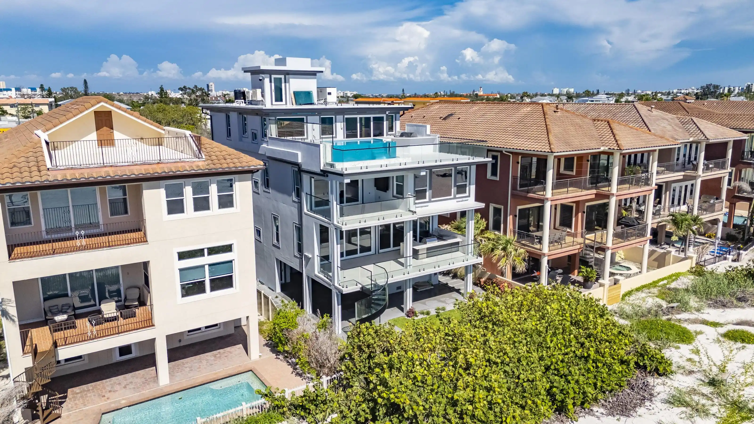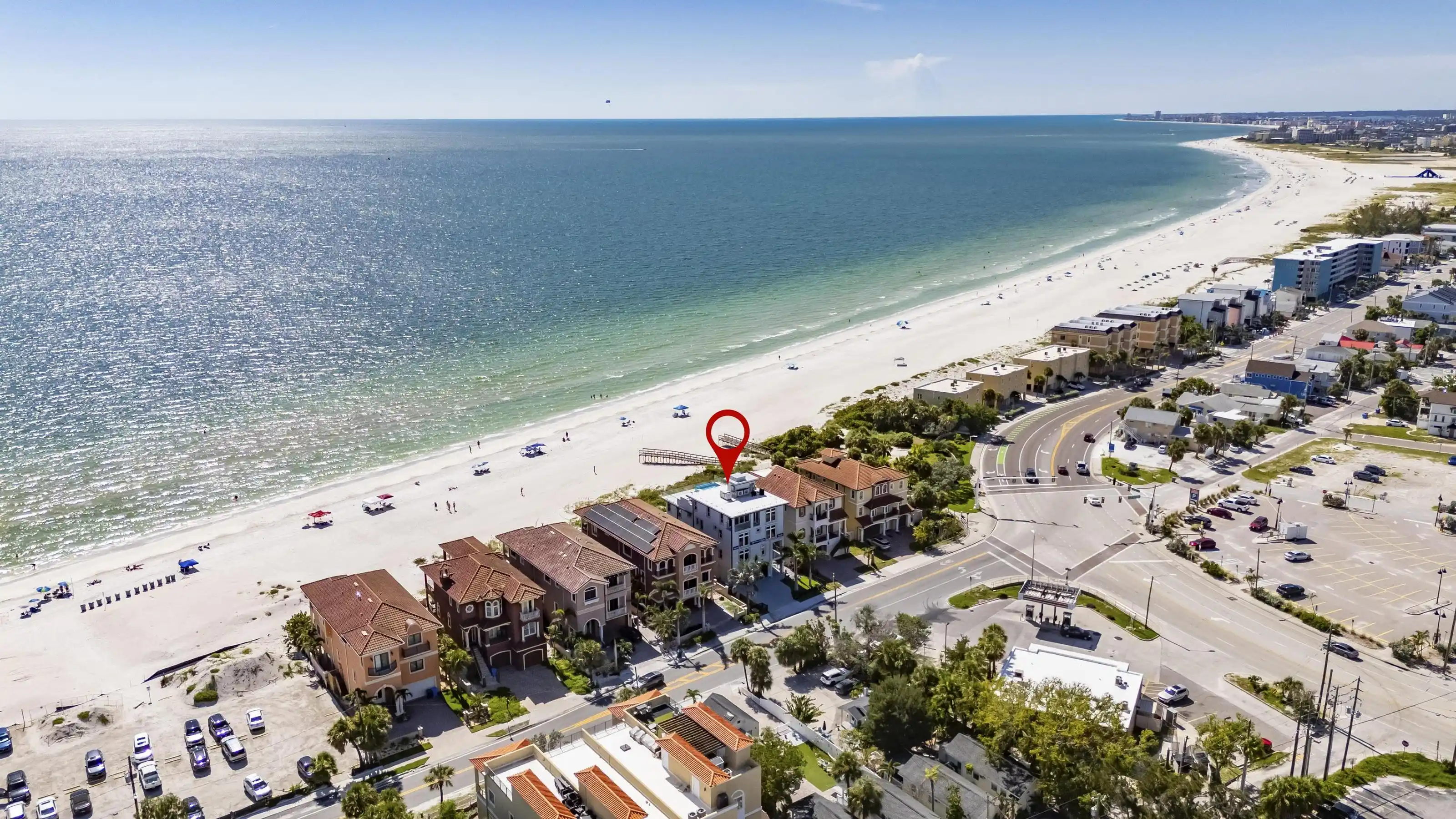Experience beachfront luxury in this 2025 custom concrete-built home on Treasure Island. Elevated 18 feet above sea level, this 5-bed, 7-bath residence offers 5,198 sq ft of high-end living, complete with a 32kW generator, Tesla chargers, and rooftop infinity pool. The main level features open living, a chef’s kitchen with double ovens, espresso machine, pot filler, and walk-in pantry. Upstairs offers multiple guest suites, a second living area, and a spacious primary with balcony and spa bath. The rooftop includes a pool, summer kitchen, and indoor flex space for entertaining, fitness, or media. Additional highlights: glass elevator, full concrete structure with deep pilings, smart home tech, and no HOA/CDD. Located steps from the sand and minutes to dining and shops.