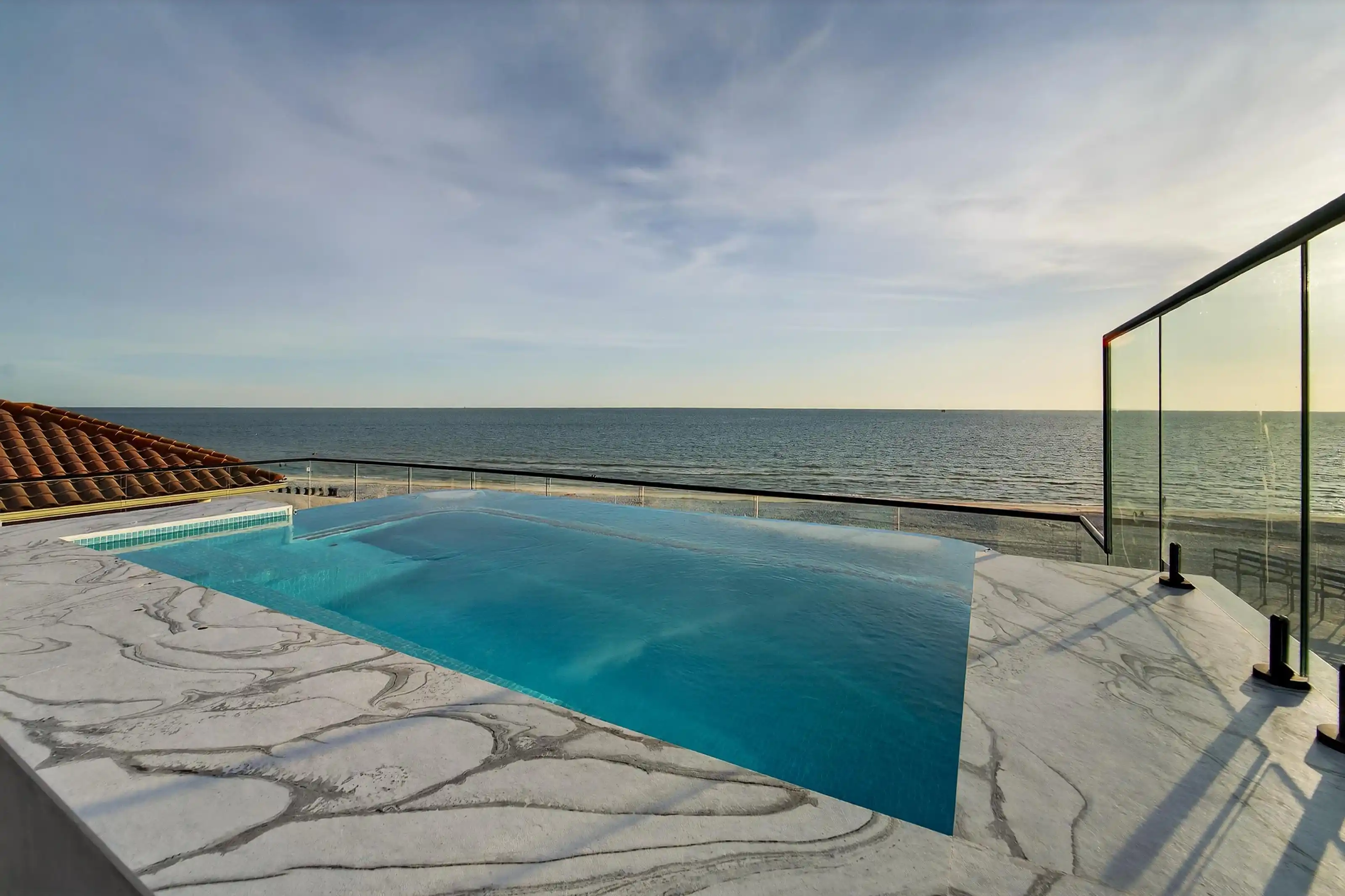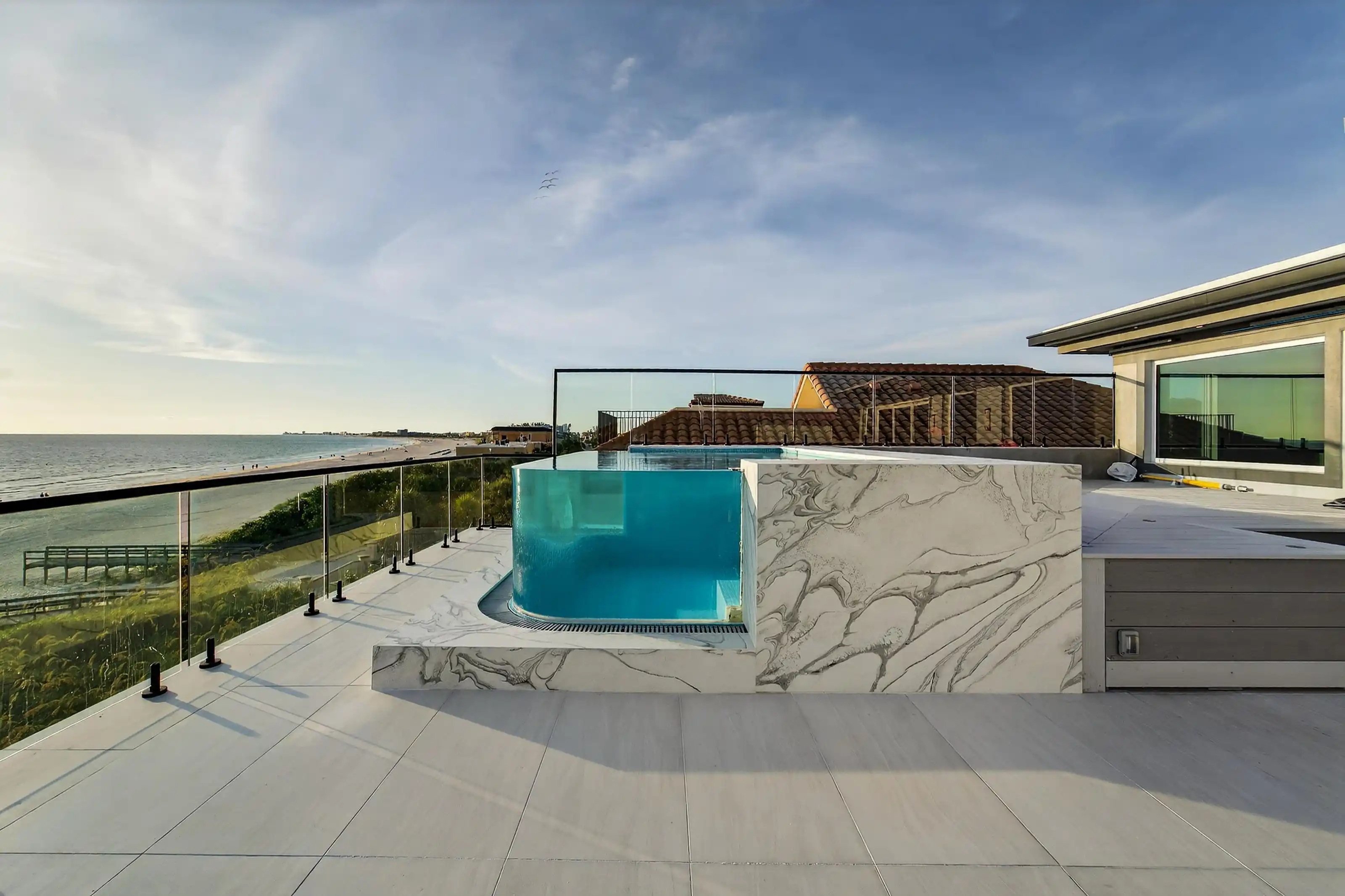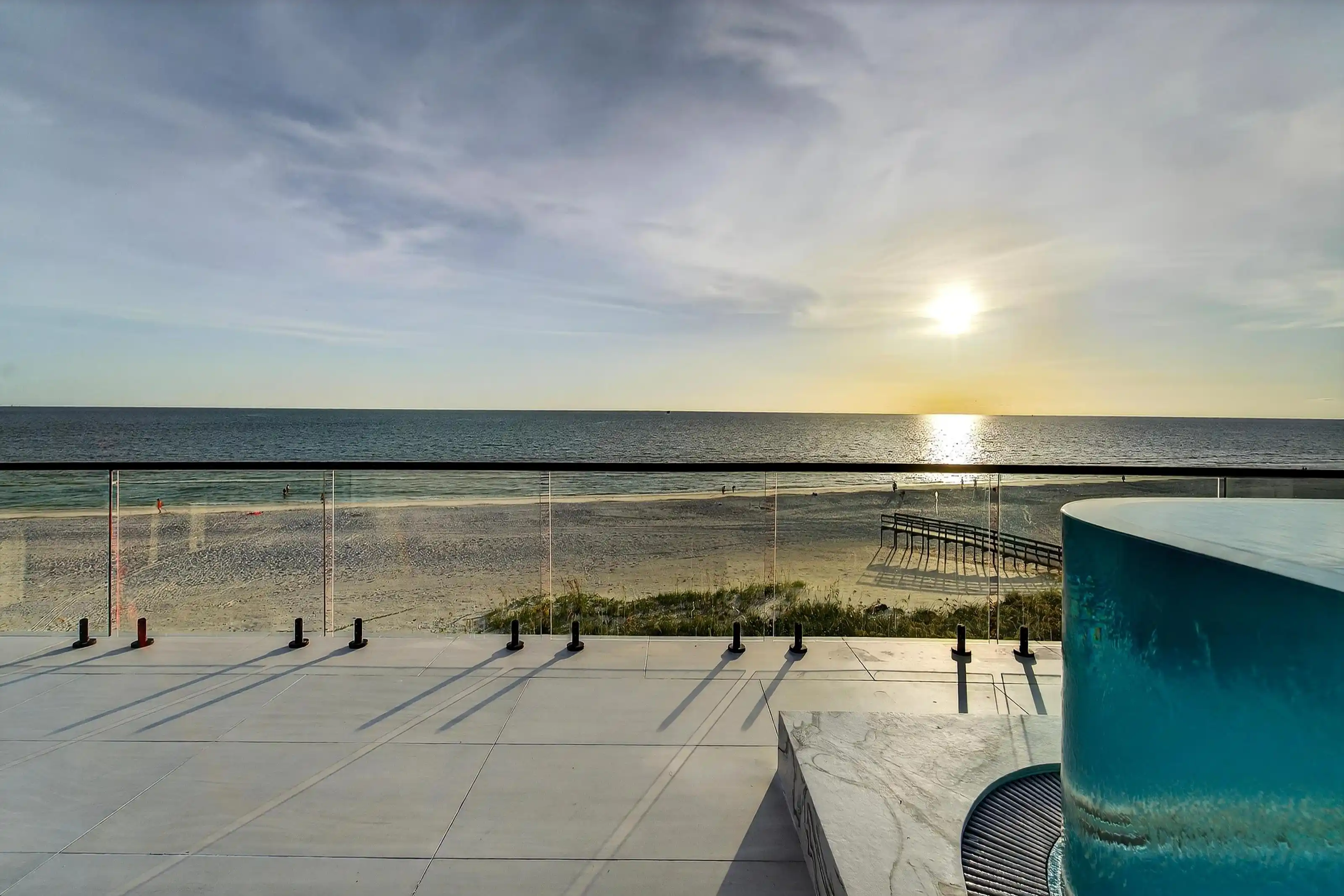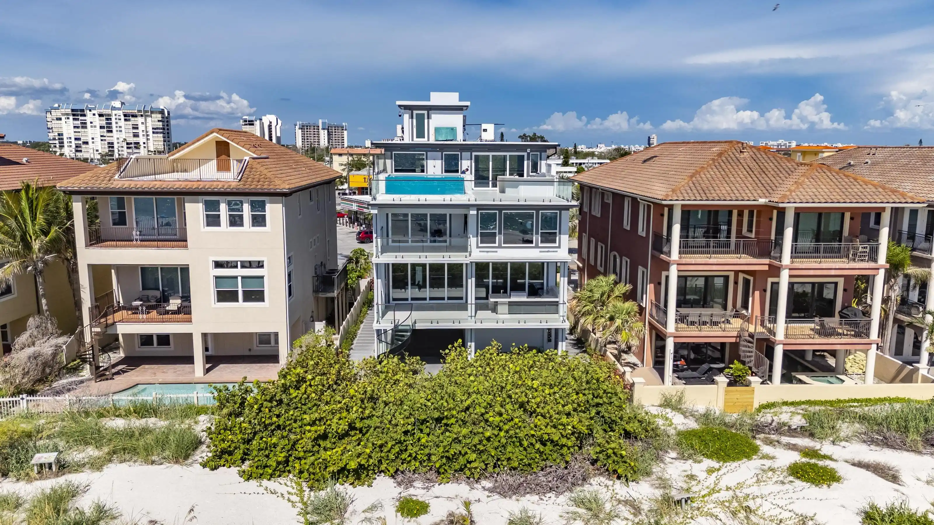 Experience beachfront luxury in this 2025 custom concrete-built home on Treasure Island. Elevated 18 feet above sea level, this 5-bed, 7-bath residence offers 5,198 sq ft of high-end living, complete with a 32kW generator, Tesla chargers, and rooftop infinity pool. The main level features open living, a chef’s kitchen with double ovens, espresso machine, pot filler, and walk-in pantry. Upstairs offers multiple guest suites, a second living area, and a spacious primary with balcony and spa bath. The rooftop includes a pool, summer kitchen, and indoor flex space for entertaining, fitness, or media. Additional highlights: glass elevator, full concrete structure with deep pilings, smart home tech, and no HOA/CDD. Located steps from the sand and minutes to dining and shops.