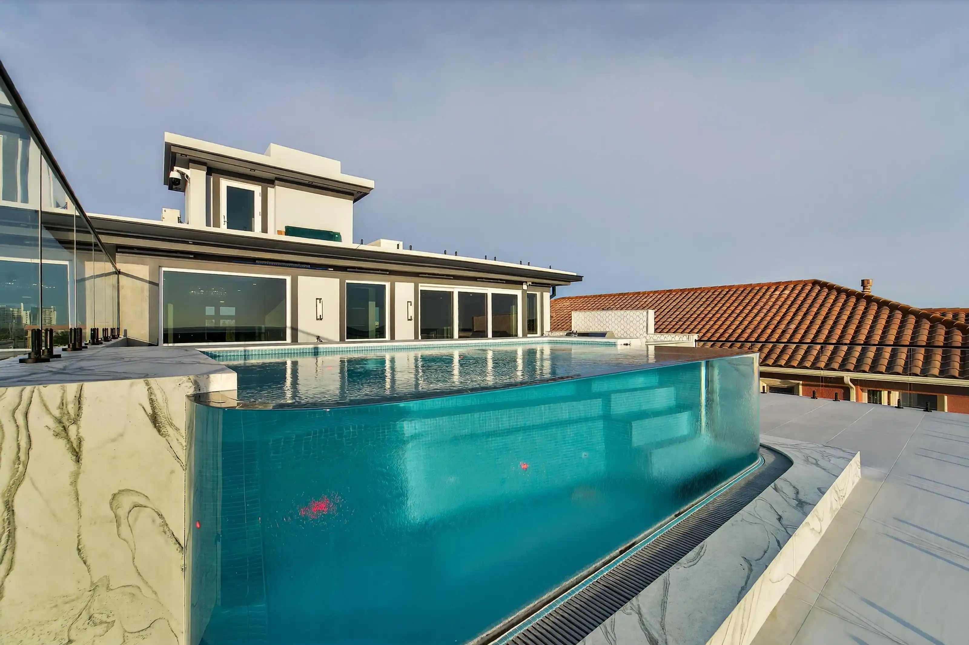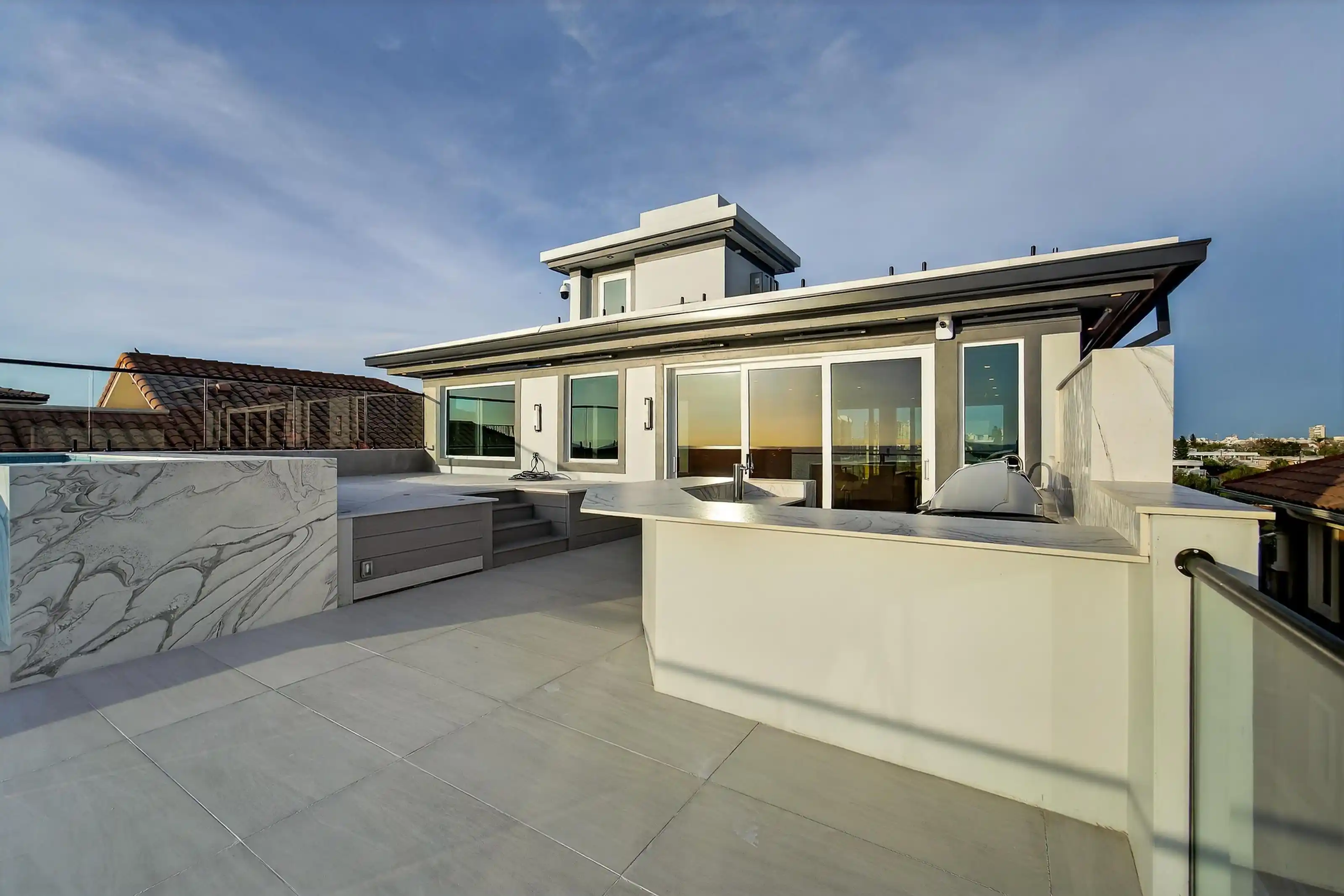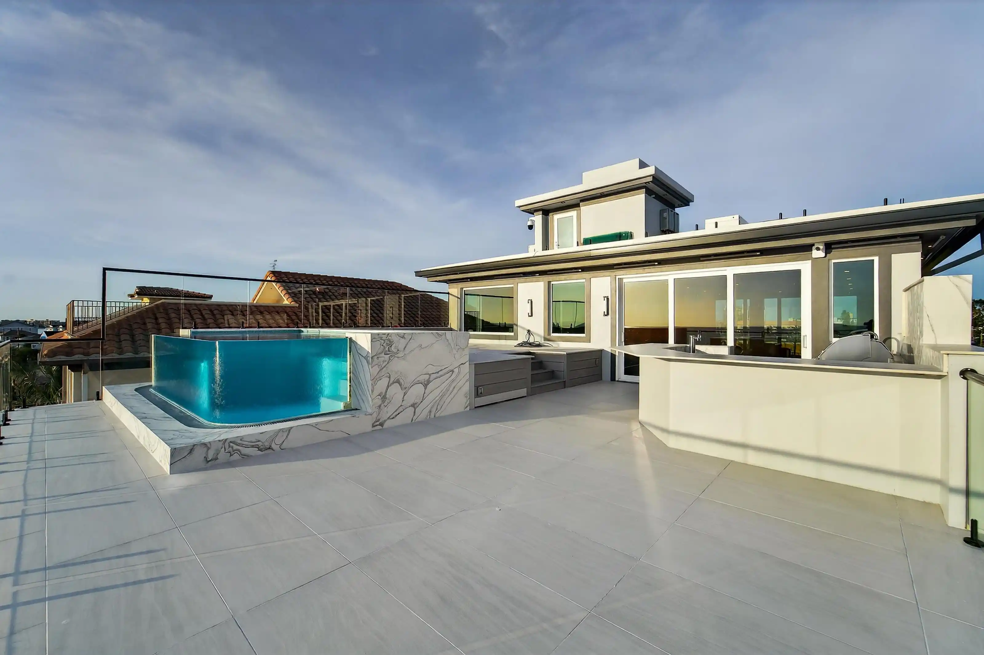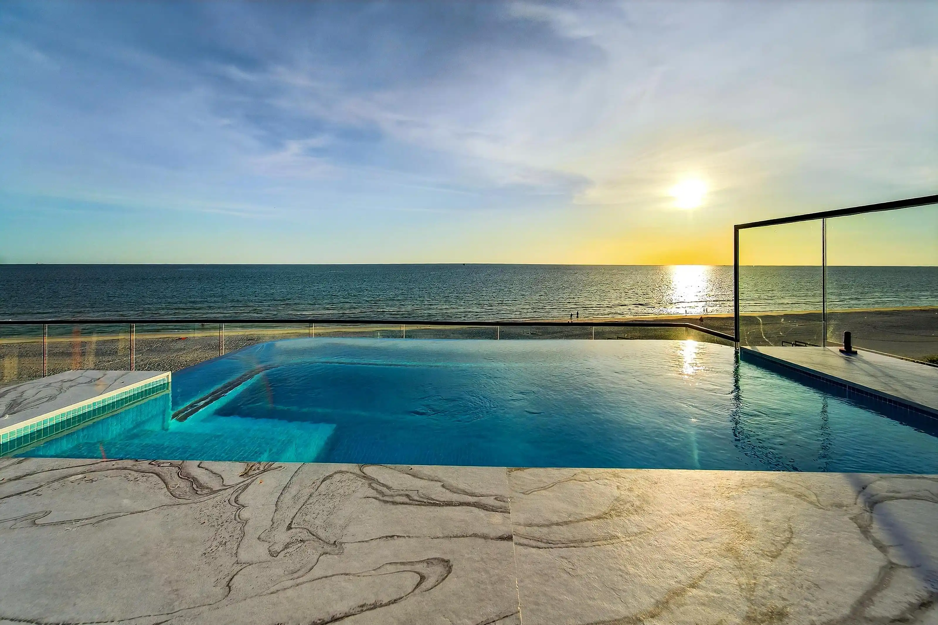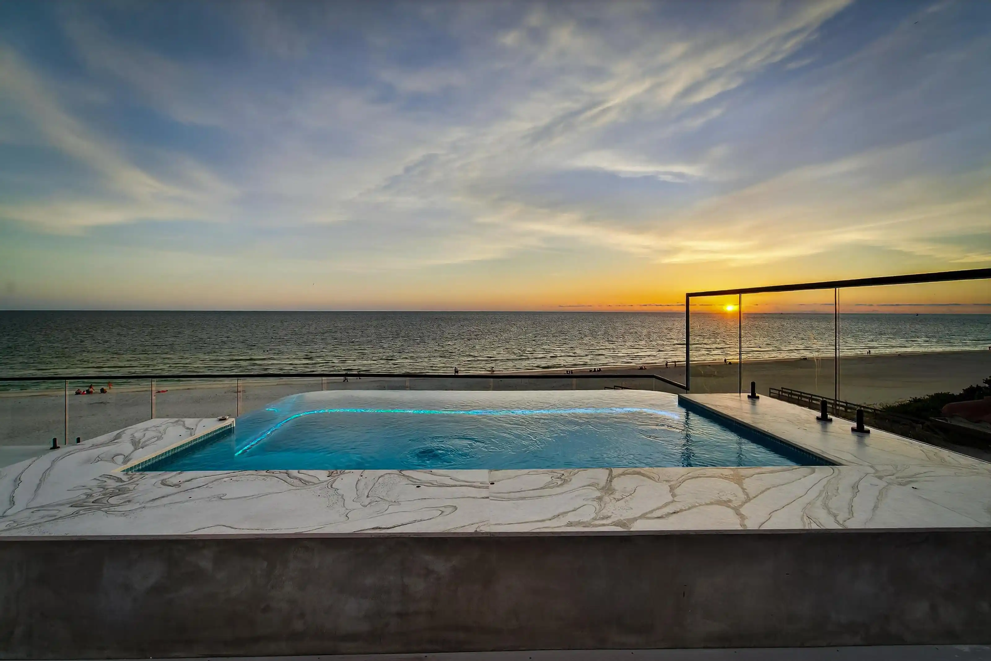 Experience beachfront luxury in this 2025 custom concrete-built home on Treasure Island. Elevated 18 feet above sea level, this 5-bed, 7-bath residence offers 5,198 sq ft of high-end living, complete with a 32kW generator, Tesla chargers, and rooftop infinity pool. The main level features open living, a chef’s kitchen with double ovens, espresso machine, pot filler, and walk-in pantry. Upstairs offers multiple guest suites, a second living area, and a spacious primary with balcony and spa bath. The rooftop includes a pool, summer kitchen, and indoor flex space for entertaining, fitness, or media. Additional highlights: glass elevator, full concrete structure with deep pilings, smart home tech, and no HOA/CDD. Located steps from the sand and minutes to dining and shops.