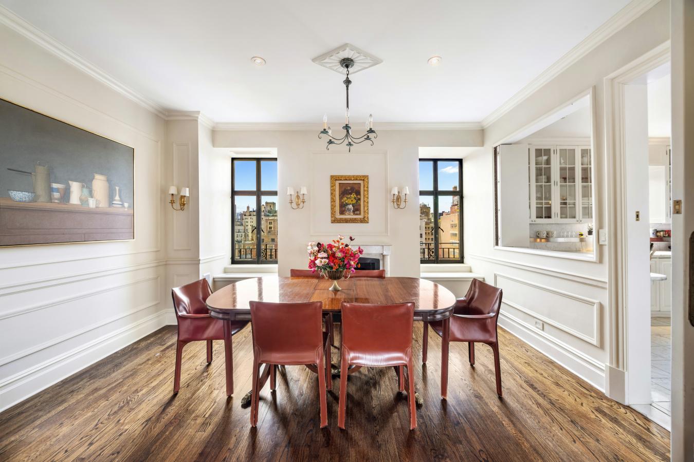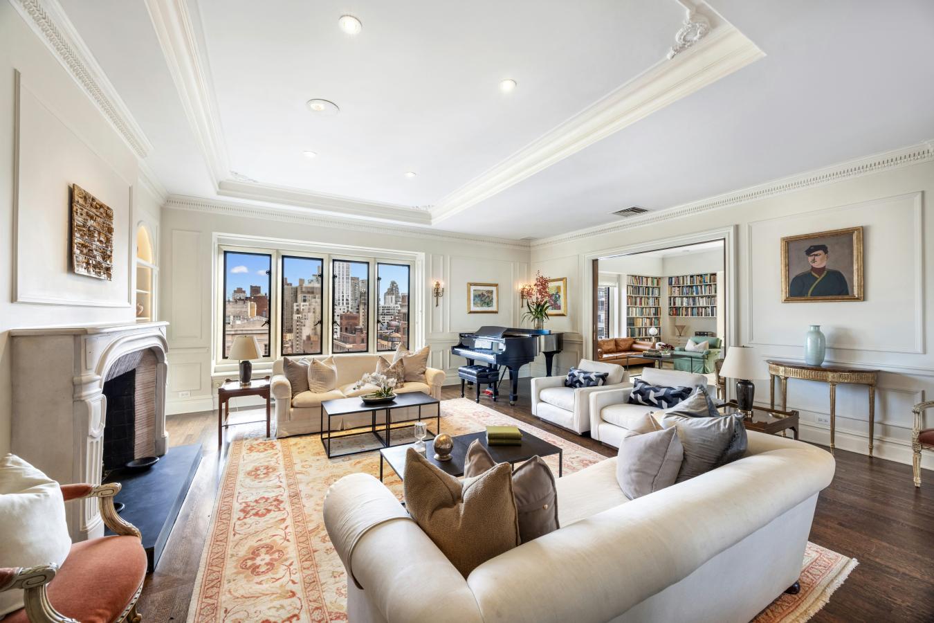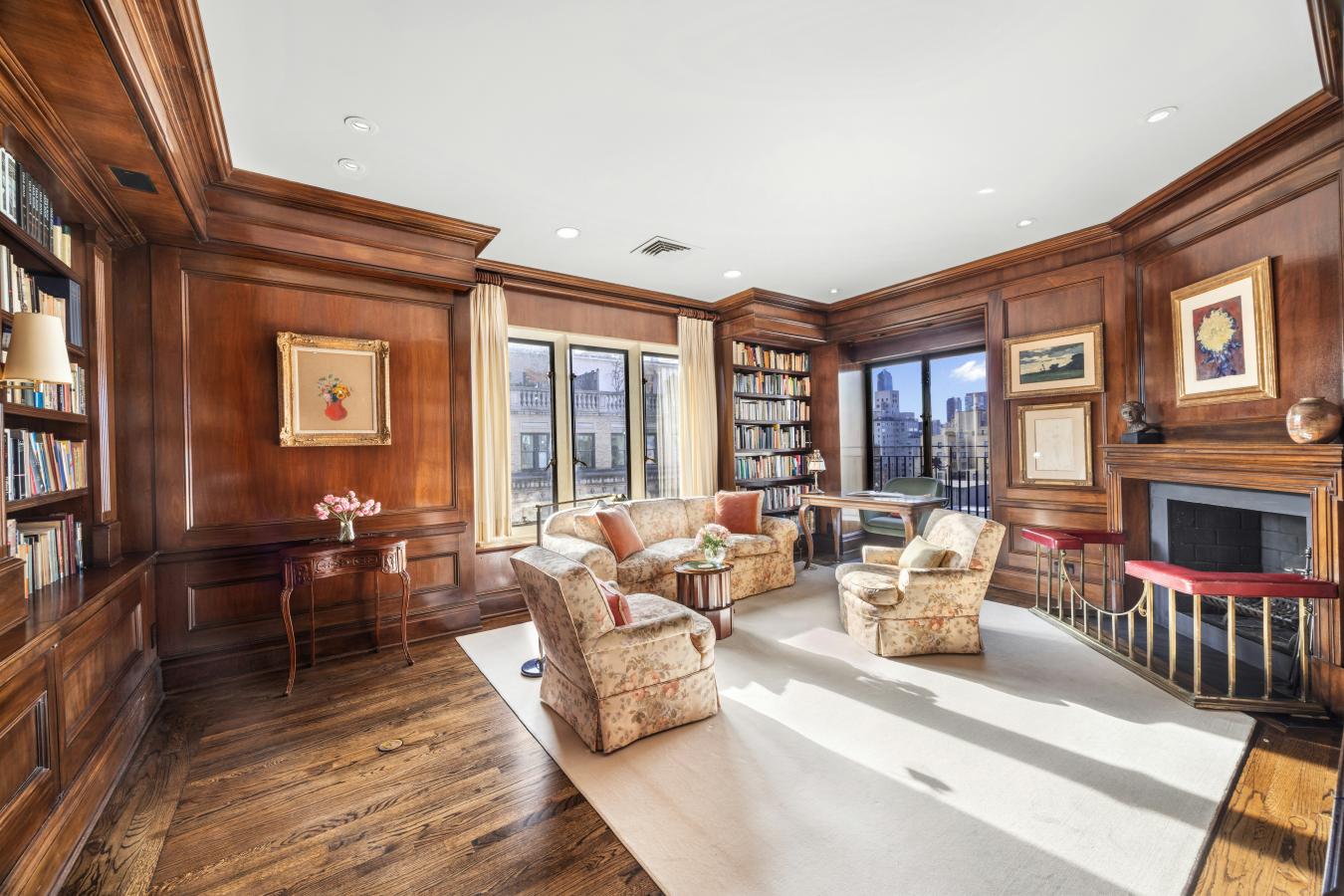 A truly exceptional offering of a grand full floor home boasting over 90 feet of Park Avenue frontage, with majestic exposures framed by large picture windows in every room. Flooded with sunlight throughout, the 15th Floor at 820 Park Avenue is a property offering a flawless classic layout, glorious proportions and wide open views both east and west rarely found on Park Avenue, all set atop a distinguished full-service cooperative on a prime corner of the Upper East Side. Occupying the buildings penultimate floor, this residence is entered through a private vestibule and a custom wrought-iron front door. Ceilings rise over 10 feet as sunlight guides you from the formal gallery into the homes south-facing entertaining wing with a stately living room at its core. The living room features wall-to-wall oversized picture windows facing east, showcasing gorgeous open views over Park Avenue and the city beyond. The first of three wood burning fireplaces anchors the room which is also enveloped in intricate picture molding and crown molding overhead. A pair of large pocket doors open from the living room into a handsome corner library bathed in sunlight pouring in through 7 picture windows exposed southeast over Park Avenue and East 75th Street. Also off the living room and adjacent to the library is a beautifully wood-paneled sitting room with a wood burning fireplace that commands the southwestern corner of the buildings facade, featuring glorious open city views up 75th Street all the way to Central Park and the glorious buildings along Central Park West. Perfectly situated between the sitting room and a large windowed eat-in kitchen is a formal dining room, accessed from the living room through sculpted wooden pocket doors and also offering open western views. The kitchen is dressed in white marble and currently offers a pass-through dining counter open to the dining room, all stainless steel appliances including a 6-burner gas range/oven with a griddle and a vented hood, twin wall-mounted ovens by Thermador, a full-sized stainless steel Bosch dishwasher and a Subzero French-door style refrigerator/freezer with an ice maker. The entertaining areas are all served by a windowed powder room discreetly located off of the gallery. The bedrooms are situated in their own dedicated wing, as is ideal. The expansive primary bedroom suite has massive proportions throughout and its own wood burning fireplace. There is a custom dressing room that can accommodate even the most extensive of wardrobes with an array of closets, shelving and draws and contains an additional huge walk-in closet over 11 feet deep. The en-suite primary bathroom is also enormous, currently housing a deep soaking spa bathtub and an oversized glass-enclosed stall shower and easily accommodating a double vanity as well. There are two additional corner bedrooms at the north end of the residence off of their own hall for enhanced privacy. One has a windowed en-suite bathroom with a tub, and the other is serviced by a windowed bathroom with a stall shower just off of the hall. Each could easily be configured as bedrooms each with their own en-suite full bathrooms and walk-in closets. Rounding out the bedroom wing is a separate service space containing a full-sized washer/dryer. 820 Park Avenue was built in 1926 and designed by the esteemed Prix de Rome-winning architect Henry Allan Jacobs. Residents enjoy white-glove privacy and a dedicated staff inclusive of a live-in resident manager and full-time doormen. The buildings prime location places it moments from the finest boutiques, restaurants, art galleries and cultural institutions in Manhattan. Pets are welcome, and there is a 3% flip tax payable by the purchaser. Financing is considered case by case.