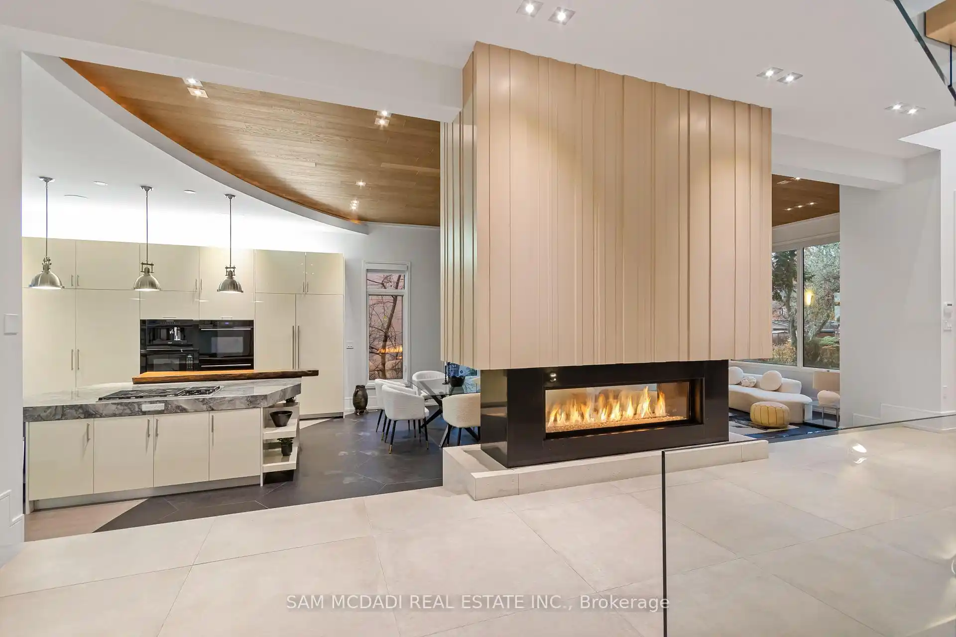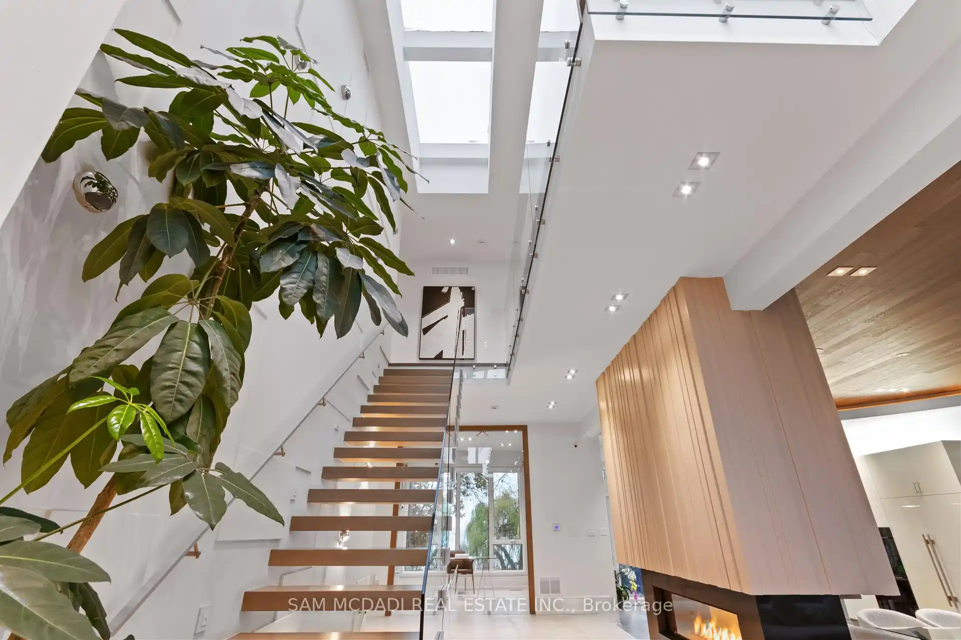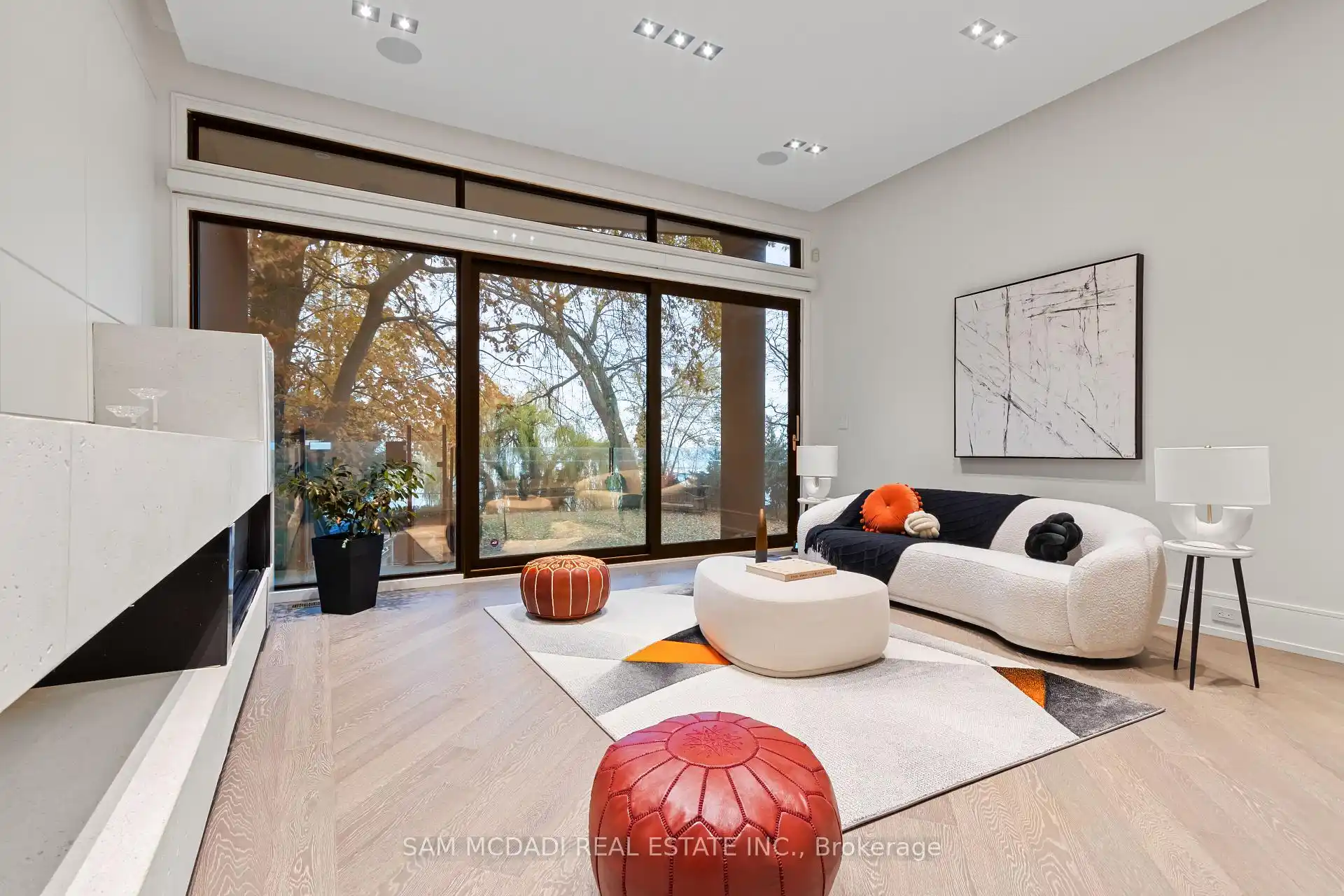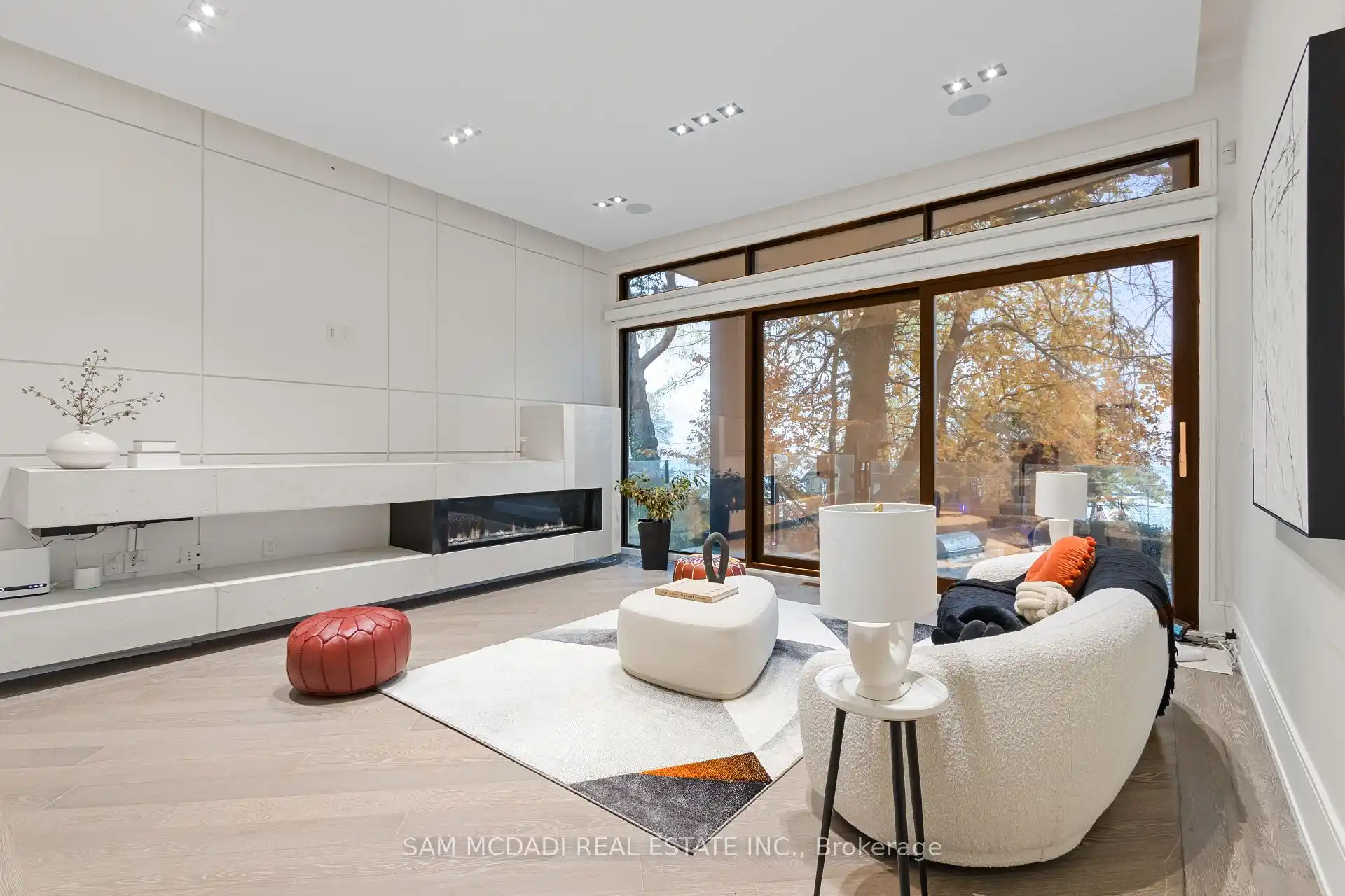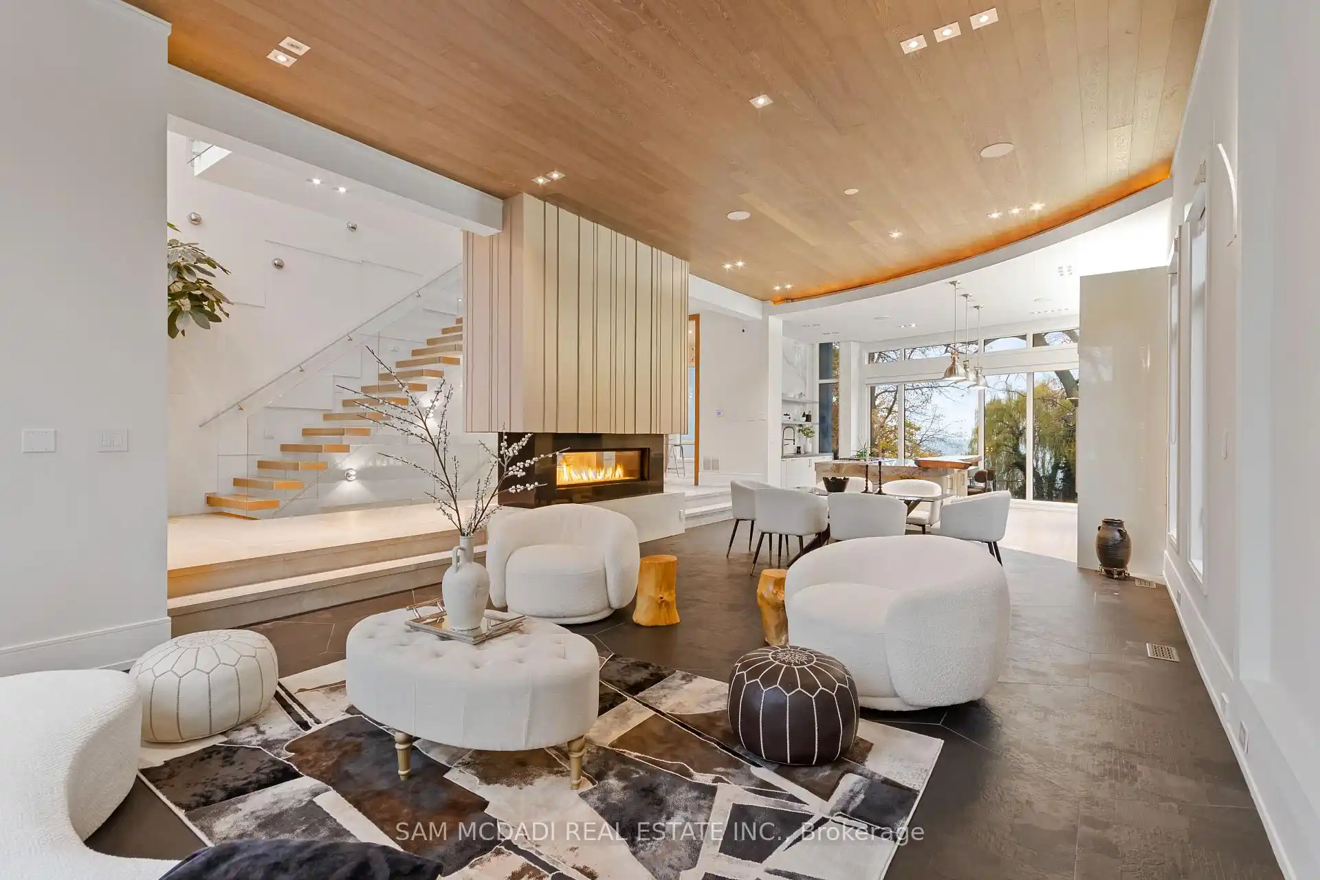 Set along South Etobicoke's prestigious lakefront corridor, this modern estate offers over 6,200 SF of refined interiors paired with resort-style amenities seldomly available. Bold in presence and uncompromising in design, it sits behind mature trees with an architectural profile that frames uninterrupted Lake Ontario views. A dramatic open-to-above foyer introduces the home, featuring a floating glass staircase, overhead skylights, and a direct views of the water. The main level unfolds as a sequence of sophisticated living spaces defined by warm wood ceilings, gallery-like walls, and a sculptural double-sided linear fireplace. Near floor-to-ceiling windows wrap the home, inviting natural light and capturing the shoreline from every angle. The chef's kitchen delivers a magazine-worthy experience with Wolf and Sub-Zero appliances, bespoke cabinetry, a custom backsplash, and a striking central island. Adjacent living and dining zones create a fluid setting for elevated entertaining or intimate evenings. Above, 4 serene bedroom suites each offer a walk-in closet and ensuite. The lakefront primary retreat features a boutique dressing room, spa-calibre ensuite with heated floors and a freestanding tub overlooking the water, plus a private balcony for quiet reflections.The lower level extends the home's resort-like character with a recreation lounge, bar, gym, sauna, steam room, wine cellar, and an additional guest suite, opening seamlessly to the tiered backyard. Outdoors, multiple terraces, mature landscaping, a heated pool, hot tub, and sweeping lake vistas create a breathtaking environment for year-round enjoyment. Additional comforts include a heated driveway, architectural millwork, integrated lighting, and a layout designed for both luxury living and effortless hosting. Moments from waterfront trails, marinas, golf, and downtown Toronto, this estate offers a rare opportunity to own an impeccably crafted lakefront home.