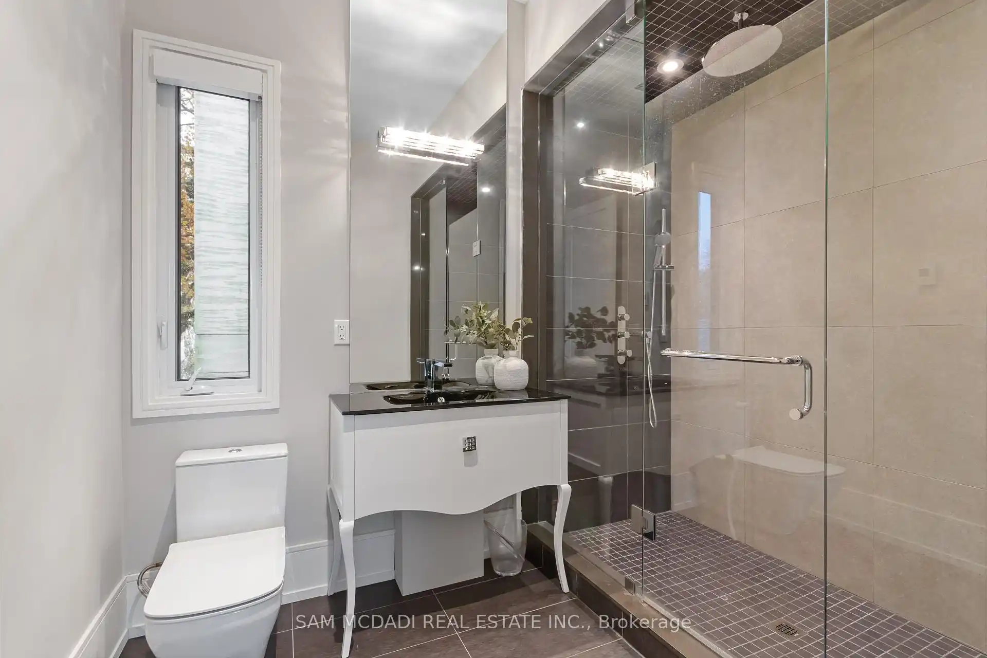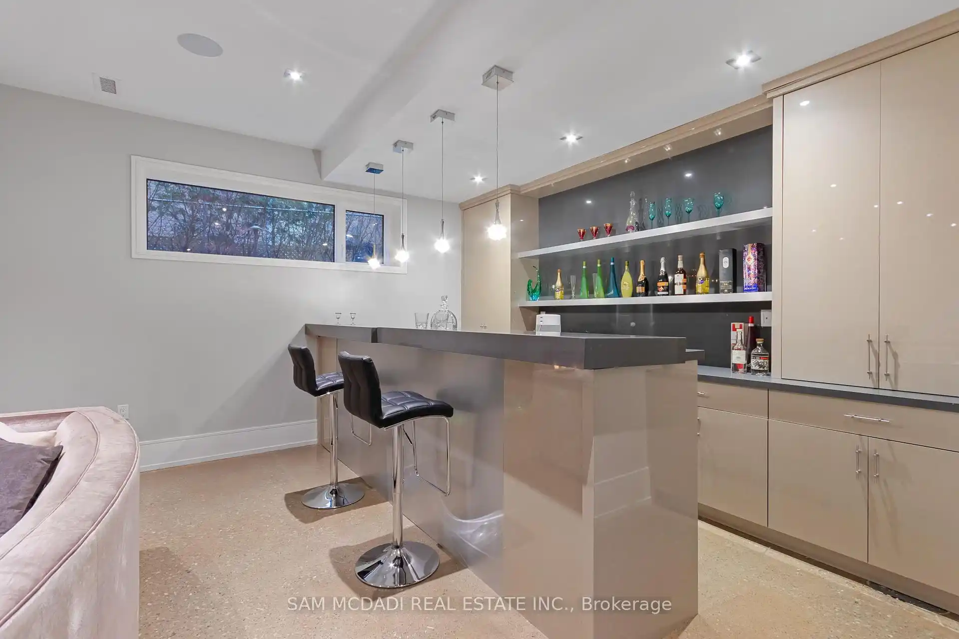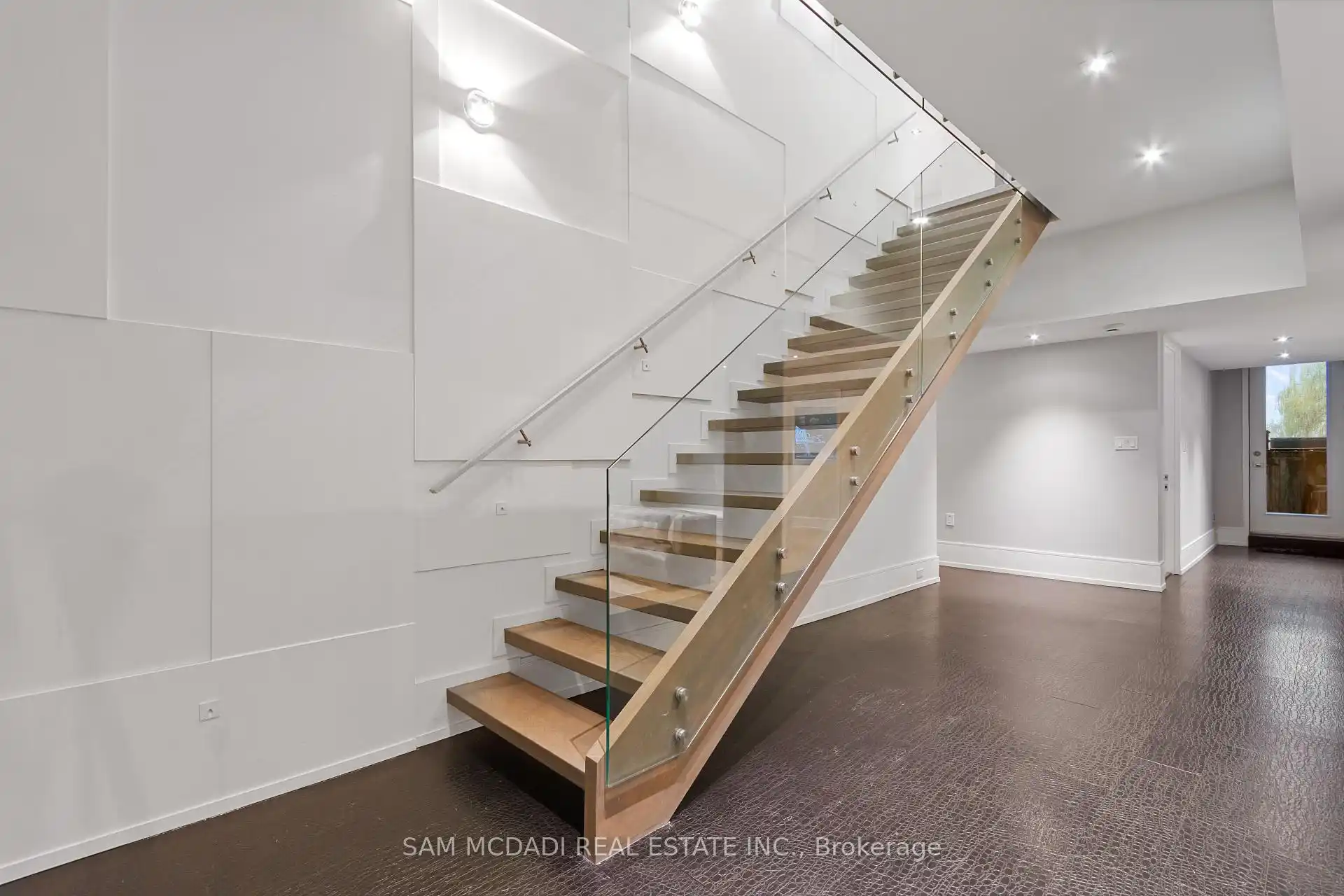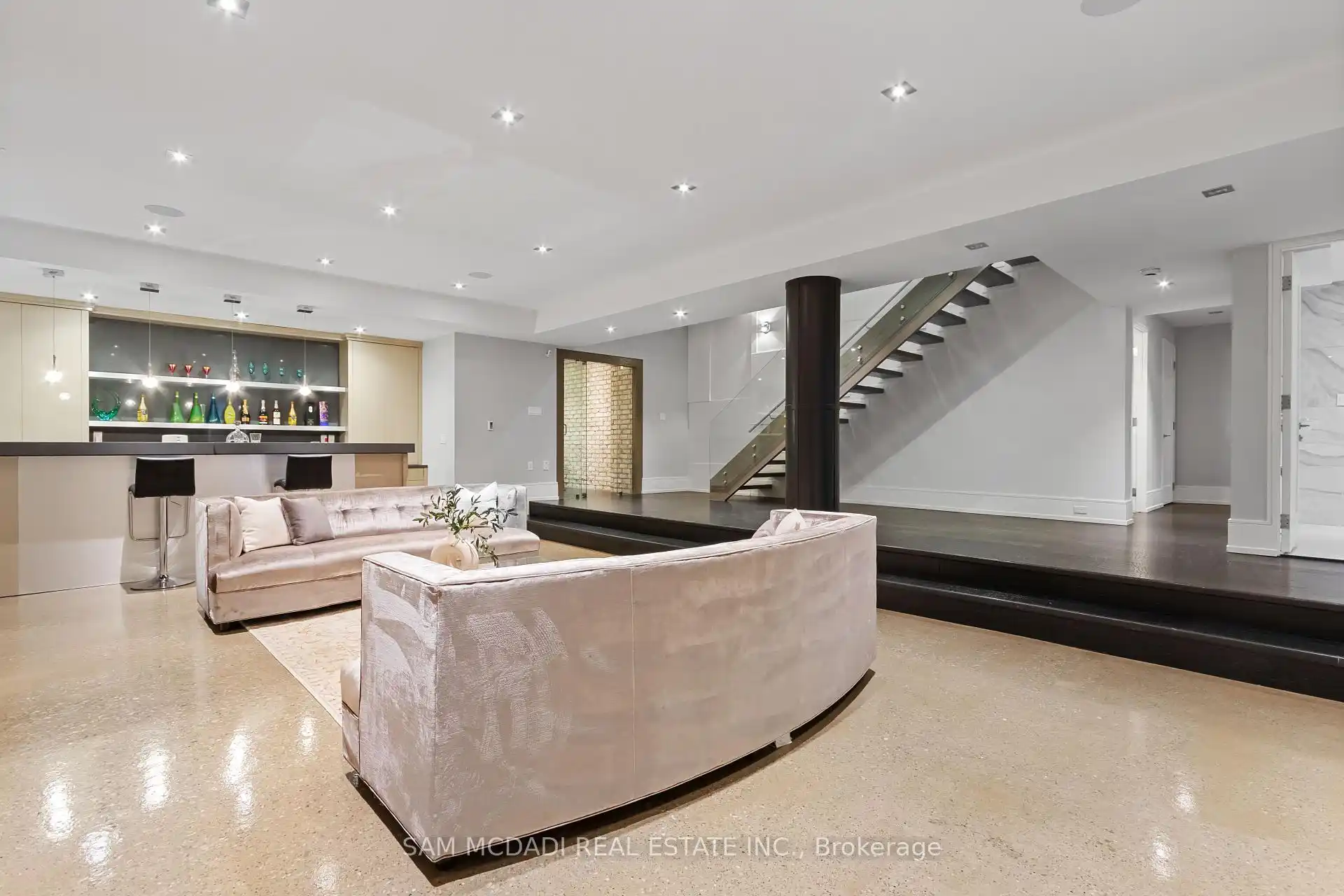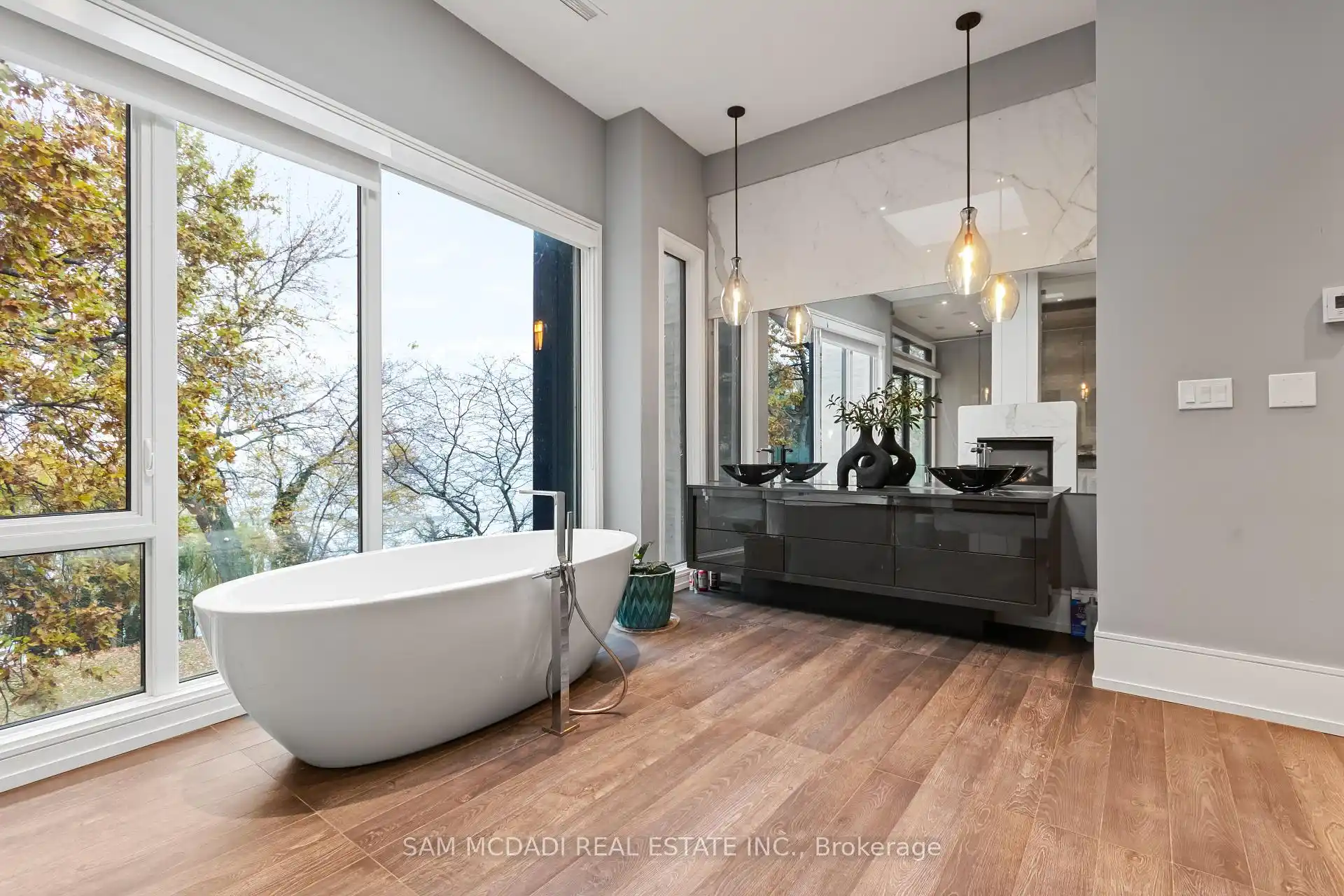 Set along South Etobicoke's prestigious lakefront corridor, this modern estate offers over 6,200 SF of refined interiors paired with resort-style amenities seldomly available. Bold in presence and uncompromising in design, it sits behind mature trees with an architectural profile that frames uninterrupted Lake Ontario views. A dramatic open-to-above foyer introduces the home, featuring a floating glass staircase, overhead skylights, and a direct views of the water. The main level unfolds as a sequence of sophisticated living spaces defined by warm wood ceilings, gallery-like walls, and a sculptural double-sided linear fireplace. Near floor-to-ceiling windows wrap the home, inviting natural light and capturing the shoreline from every angle. The chef's kitchen delivers a magazine-worthy experience with Wolf and Sub-Zero appliances, bespoke cabinetry, a custom backsplash, and a striking central island. Adjacent living and dining zones create a fluid setting for elevated entertaining or intimate evenings. Above, 4 serene bedroom suites each offer a walk-in closet and ensuite. The lakefront primary retreat features a boutique dressing room, spa-calibre ensuite with heated floors and a freestanding tub overlooking the water, plus a private balcony for quiet reflections.The lower level extends the home's resort-like character with a recreation lounge, bar, gym, sauna, steam room, wine cellar, and an additional guest suite, opening seamlessly to the tiered backyard. Outdoors, multiple terraces, mature landscaping, a heated pool, hot tub, and sweeping lake vistas create a breathtaking environment for year-round enjoyment. Additional comforts include a heated driveway, architectural millwork, integrated lighting, and a layout designed for both luxury living and effortless hosting. Moments from waterfront trails, marinas, golf, and downtown Toronto, this estate offers a rare opportunity to own an impeccably crafted lakefront home.