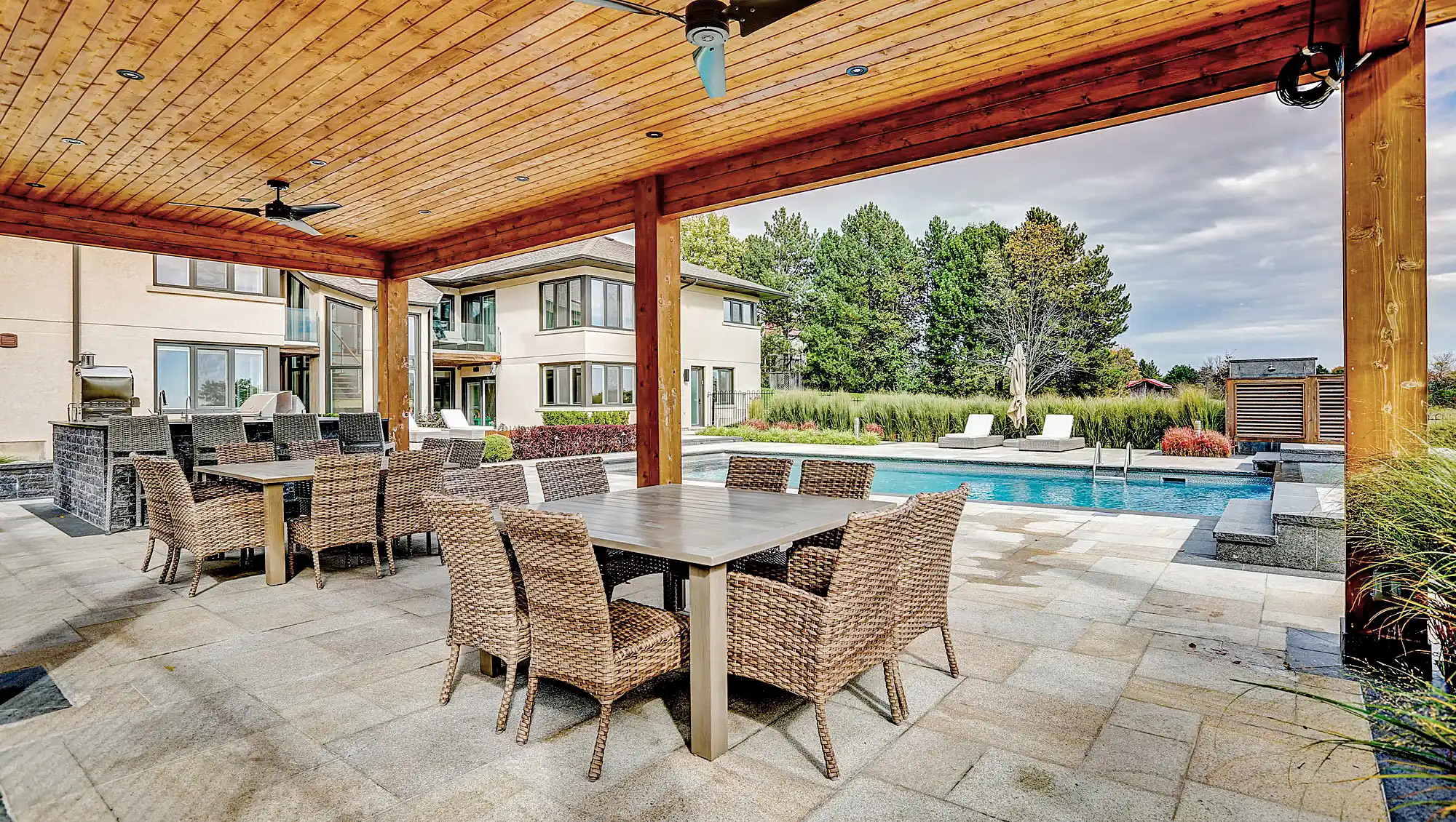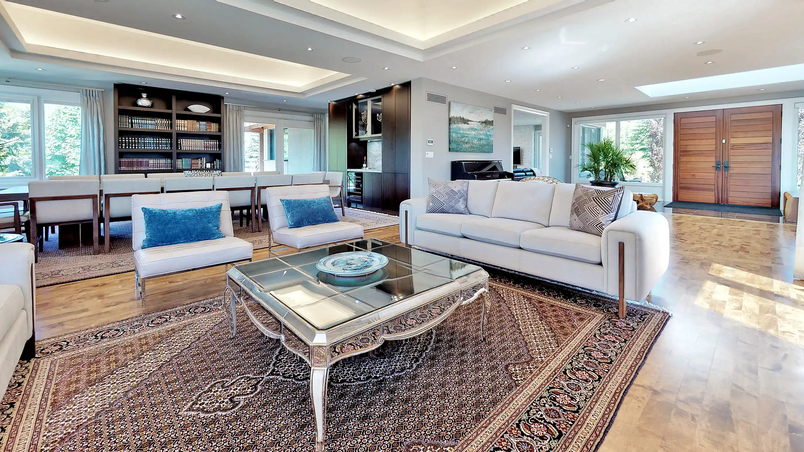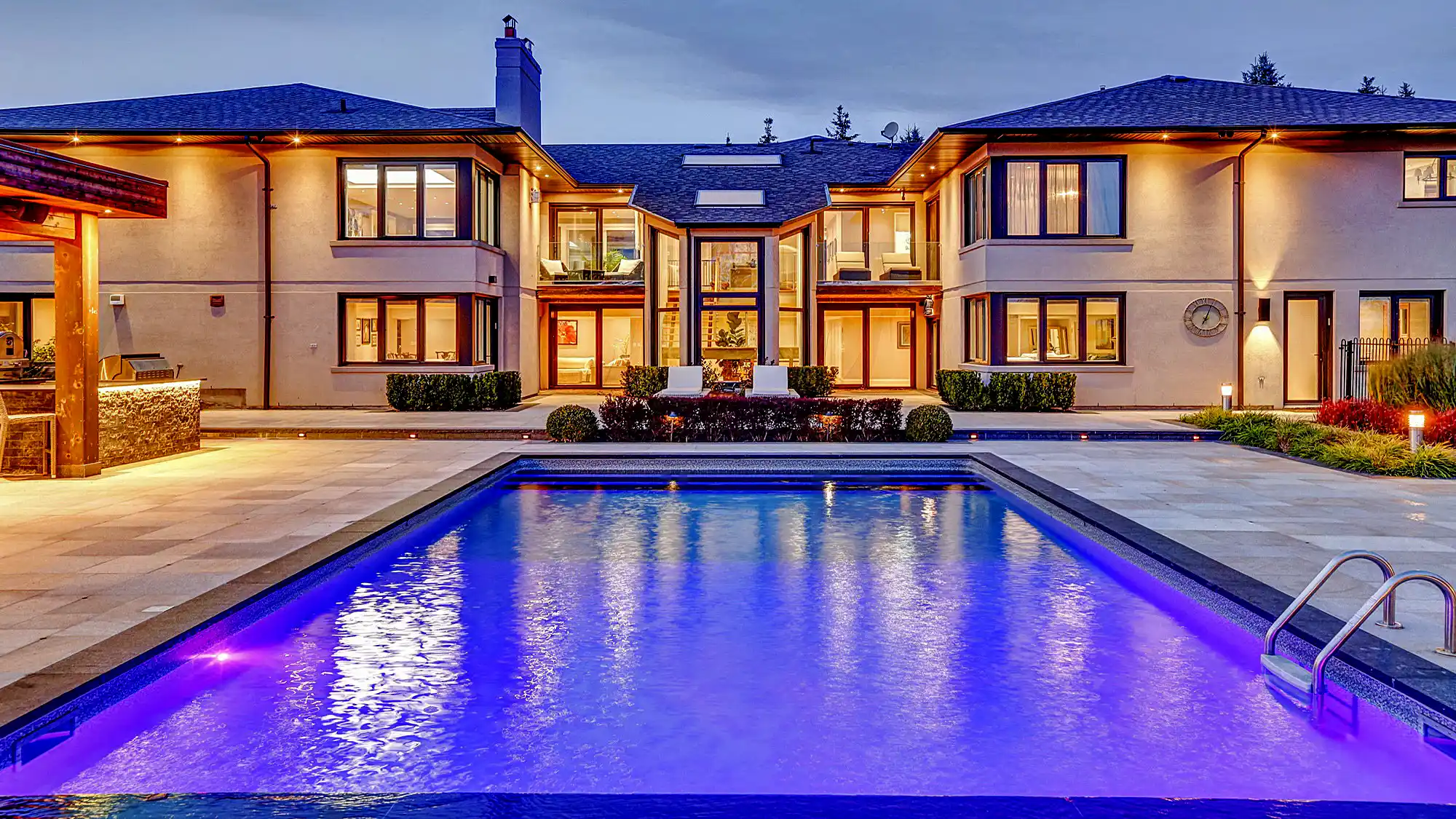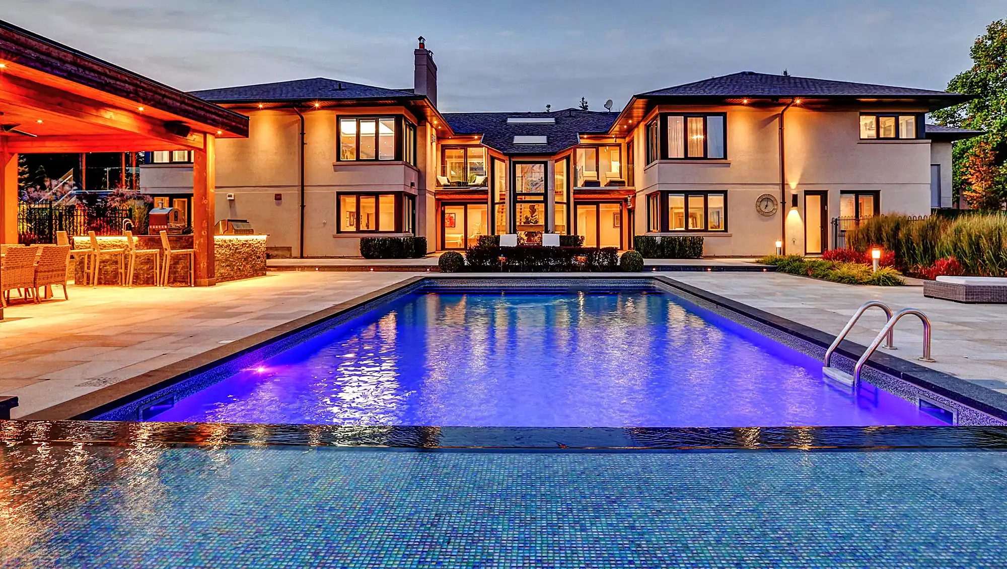 Absolutely no expense spared in this sprawling custom estate set behind the guard gates of The Country, a high security community offering the utmost privacy for the most discerning Buyer. With six bedrooms including dual primary suites, seven bathrooms, and boasting a strikingly authentic traditional Japanese dining room, custom wood paneled study, billiards/game room, and at just over 10,000 square feet, this home is the ideal family compound or entertainer's retreat. Truly the epitome of indoor/outdoor living, with walls of glass opening to a magnificent rear yard with features including a putting green, outdoor stage, charming koi pond, infinity edge pool and spa with sunken loungers, and a detached pool house with a dry and wet sauna. Set in one of the premier gated communities of Southern California, this estate melds expert modern craftsmanship with Mediterranean flare.