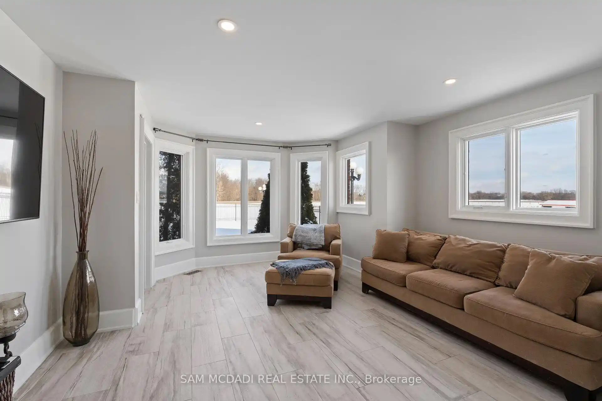 PERCHED ATOP the Stoney Creek Escarpment on a 16-acre peninsula, this stunning Georgian-style estate offers over 7,000 sq ft of above-grade living space. Enter through private gates with a scenic driveway and formal gardens before arriving at the impressive Porte Cochre. Dual staircases and soaring 28-ft ceilings create an immediate sense of grandeur. The open, flowing floor plan seamlessly connects all formal rooms to the foyer. Modern kitchen equipped with high-end appliances, family area features expansive windows that offer breathtaking views year-round. Luxurious primary suite includes a spa-like ensuite and a large balcony. 3 additional spacious bedrooms, each with its own ensuite. The lower level has a gym and sauna, plus a vast unfinished area.