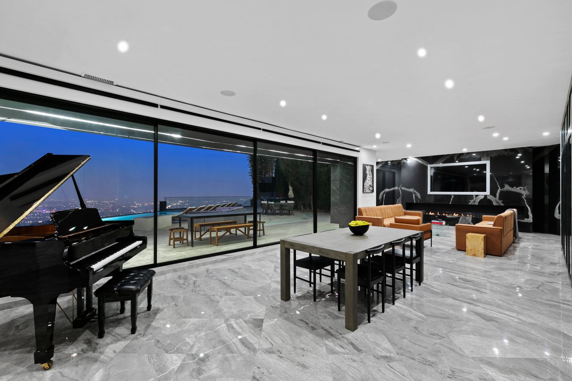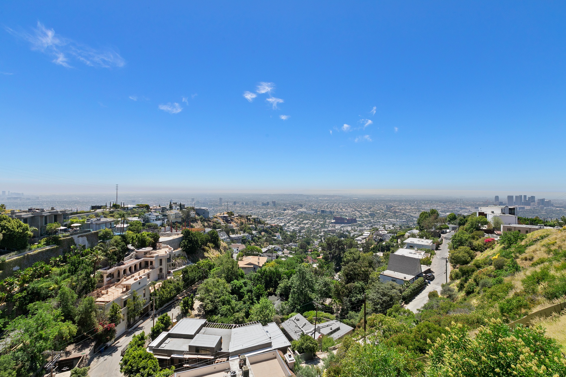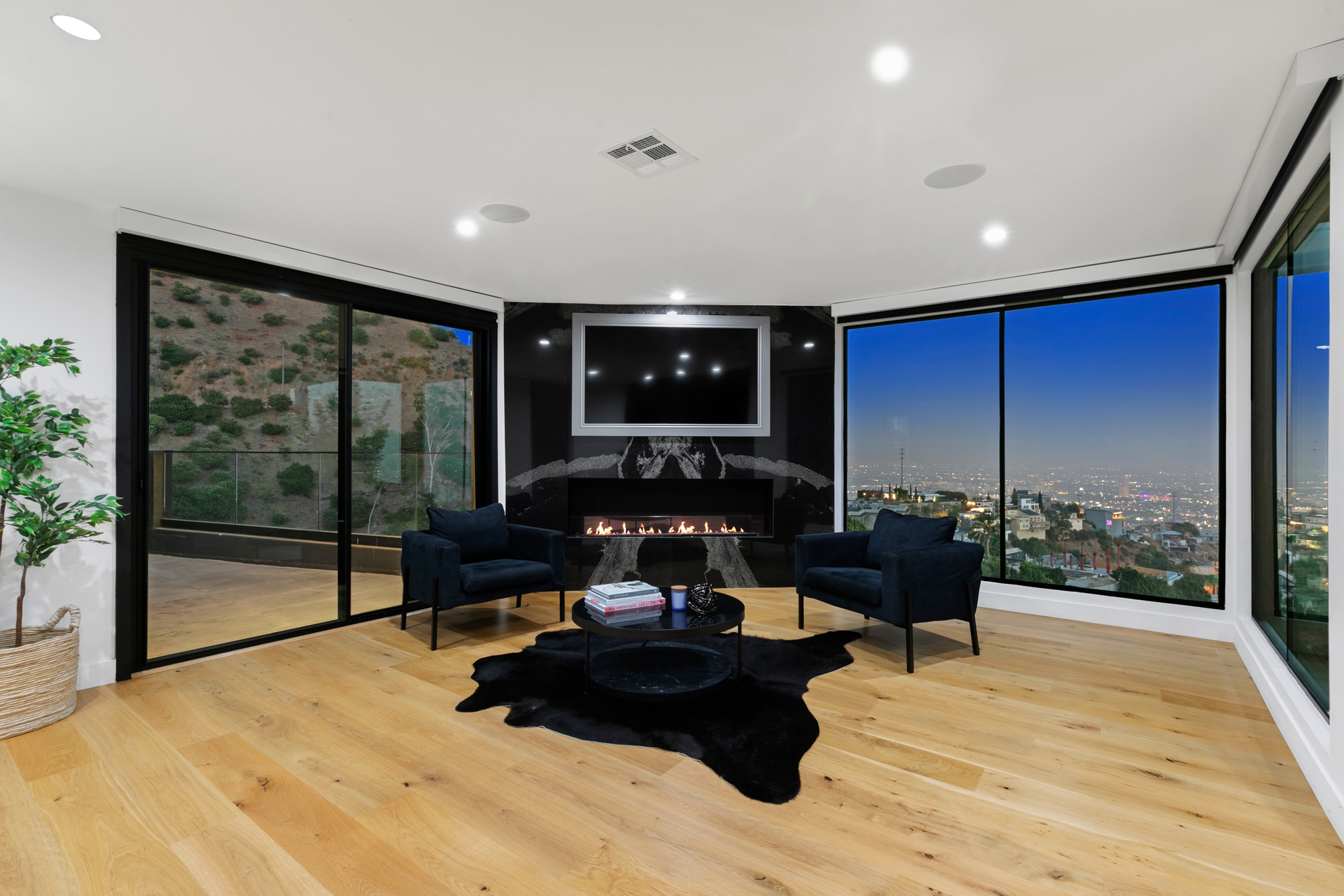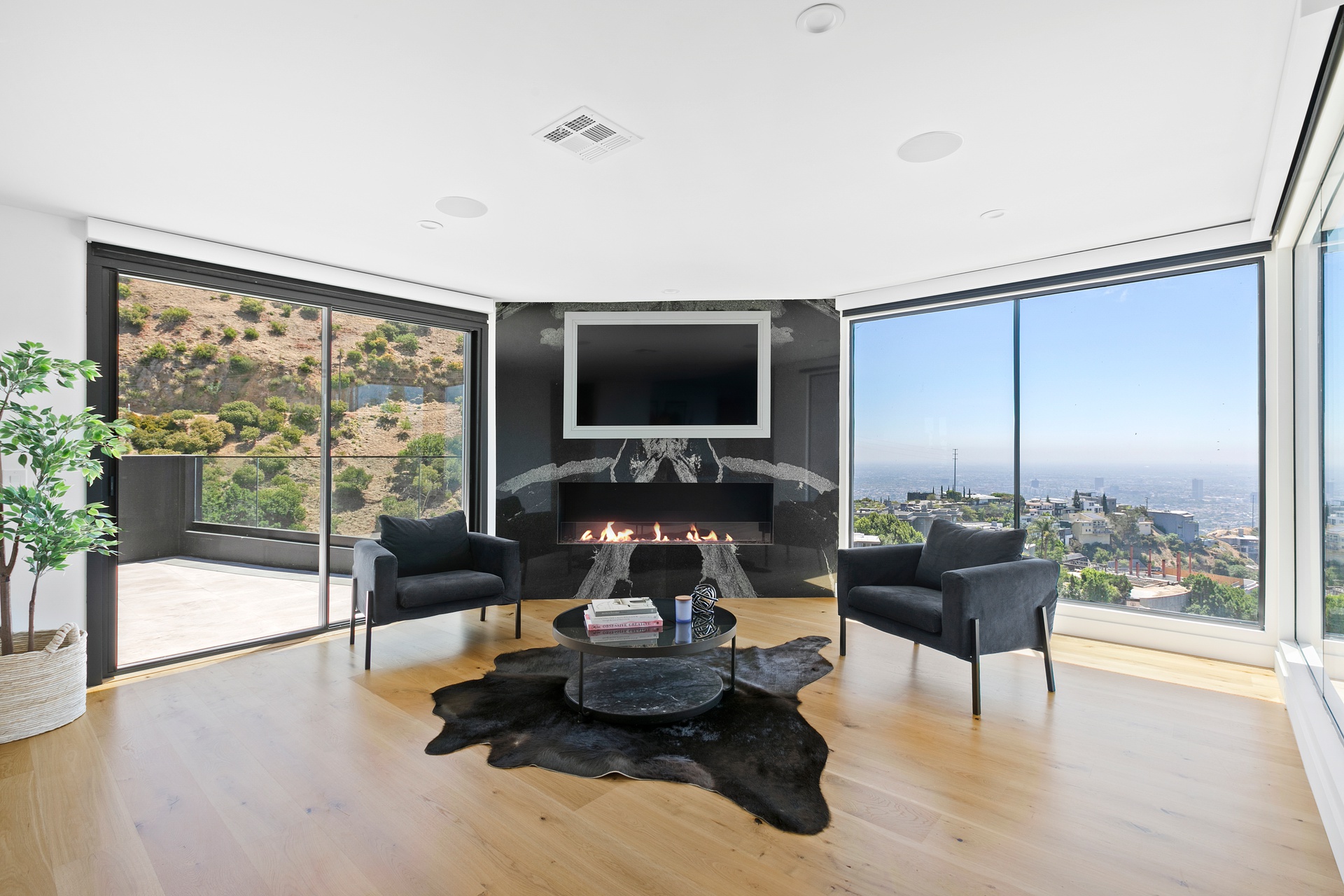 Impeccable Sunset Strip modern with unobstructed views minutes from storied LA nightlife and tucked away on a four home private drive directly off of Sunset Plaza. Enter to a grand main level with sliding walls of glass and a family room with wall length fireplace and a glass wine cabinet.