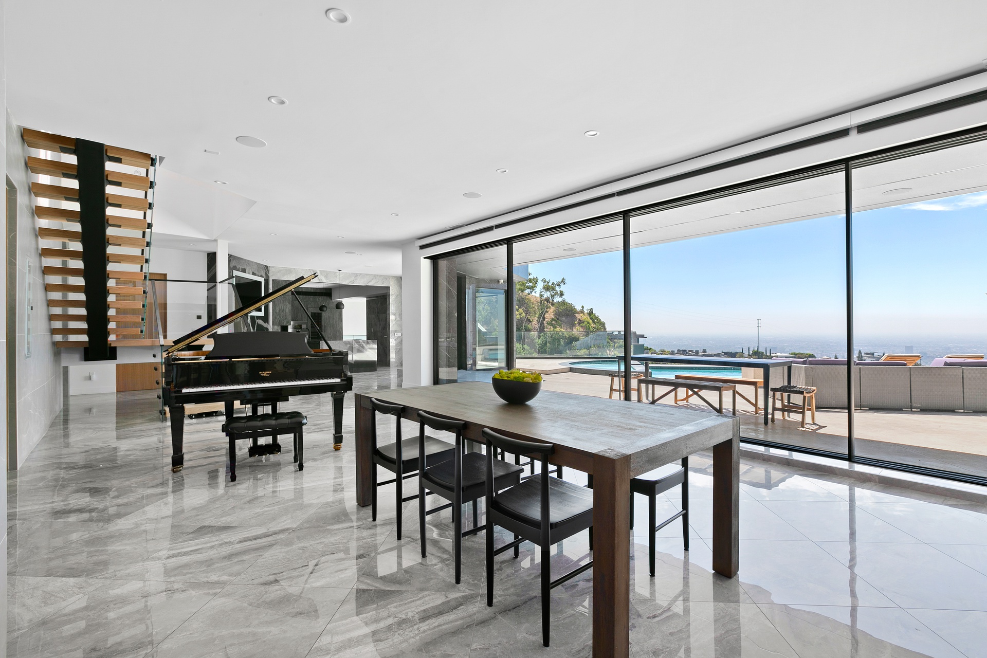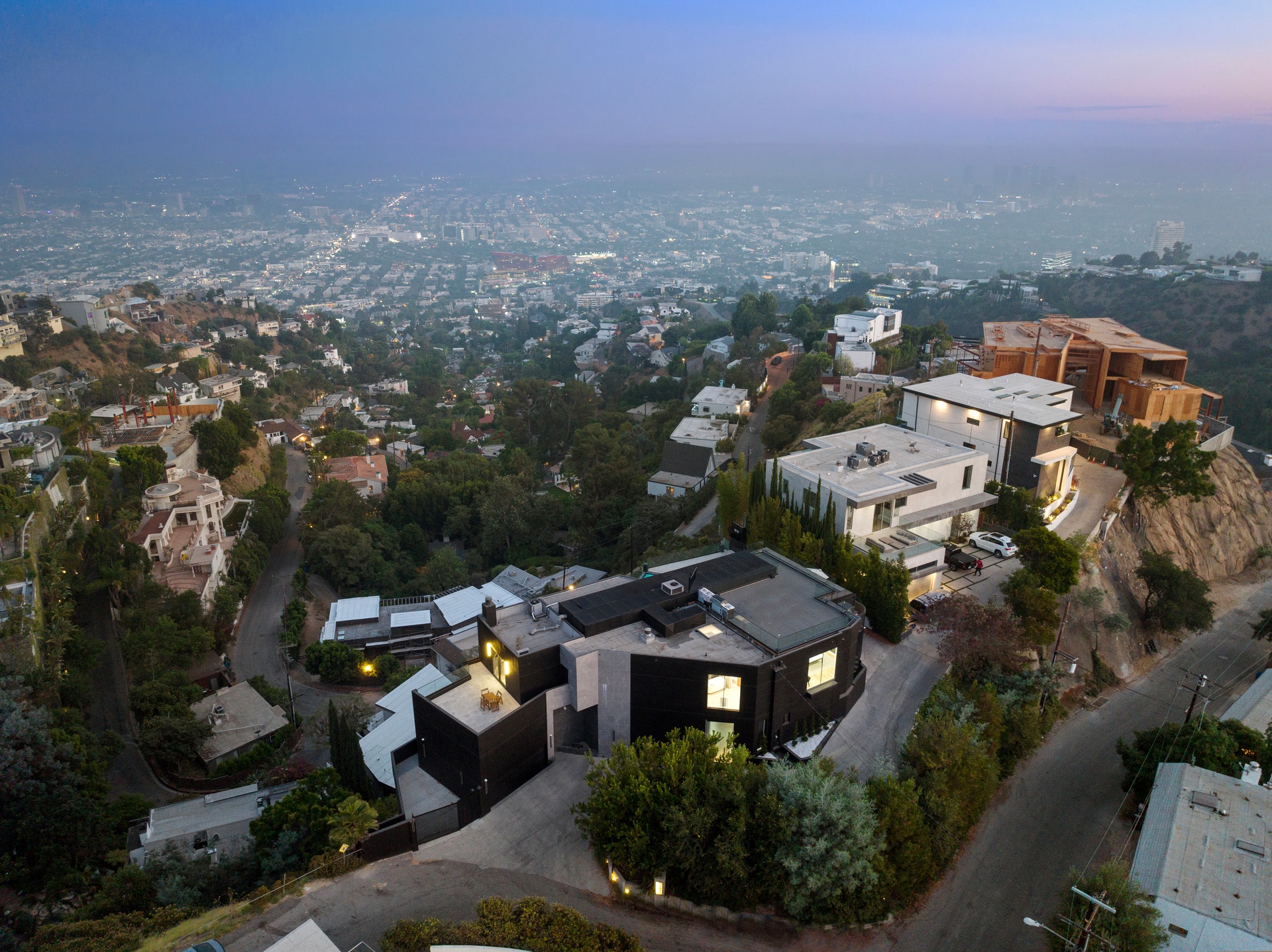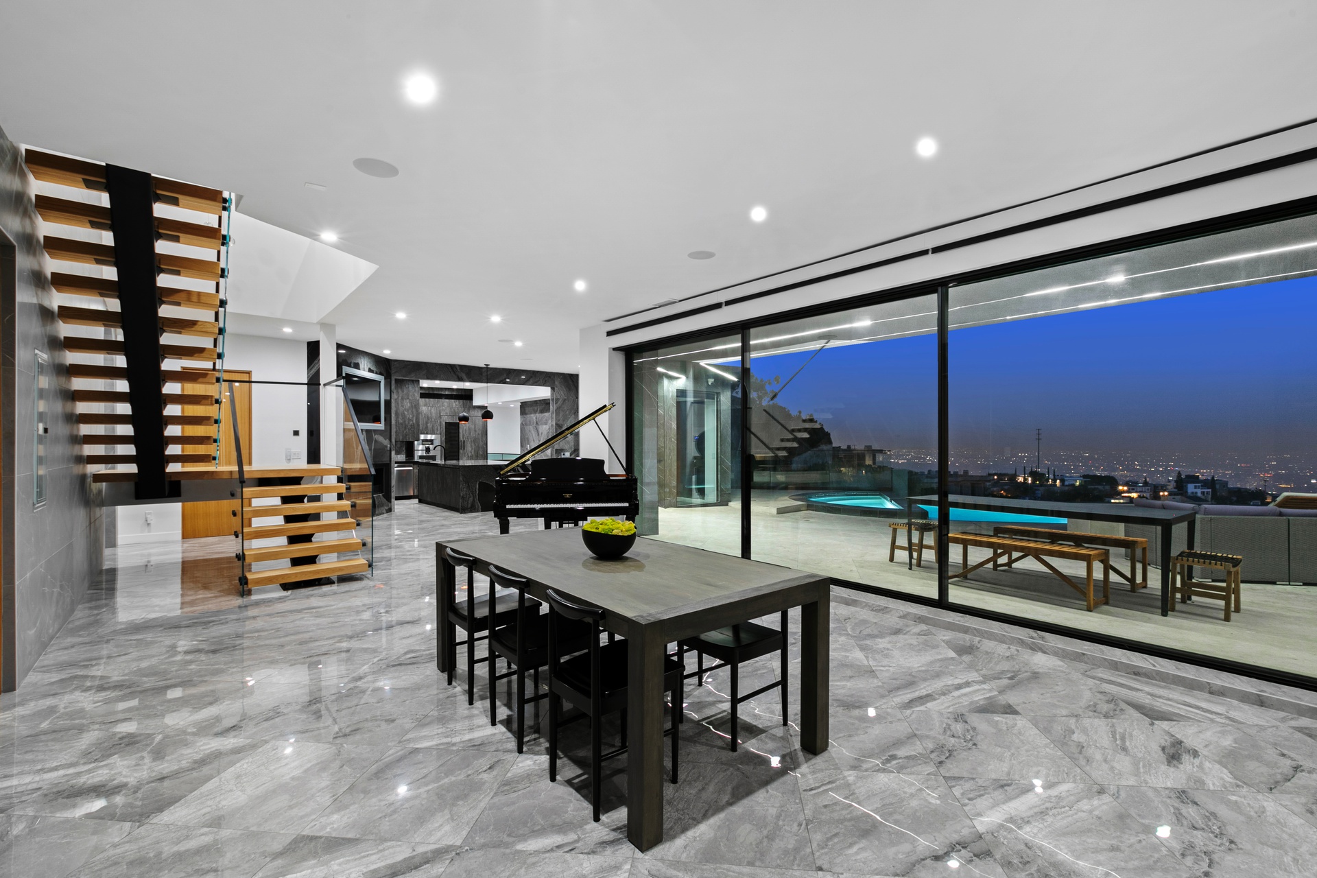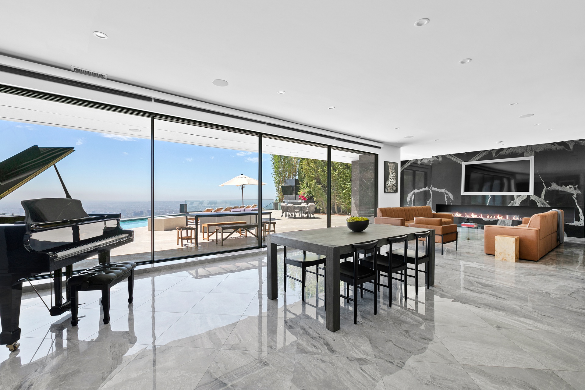 Impeccable Sunset Strip modern with unobstructed views minutes from storied LA nightlife and tucked away on a four home private drive directly off of Sunset Plaza. Enter to a grand main level with sliding walls of glass and a family room with wall length fireplace and a glass wine cabinet.