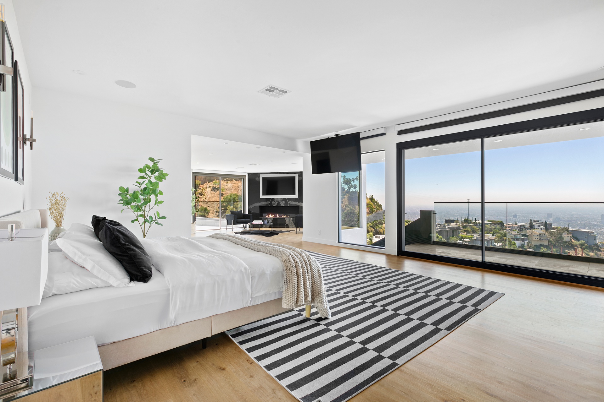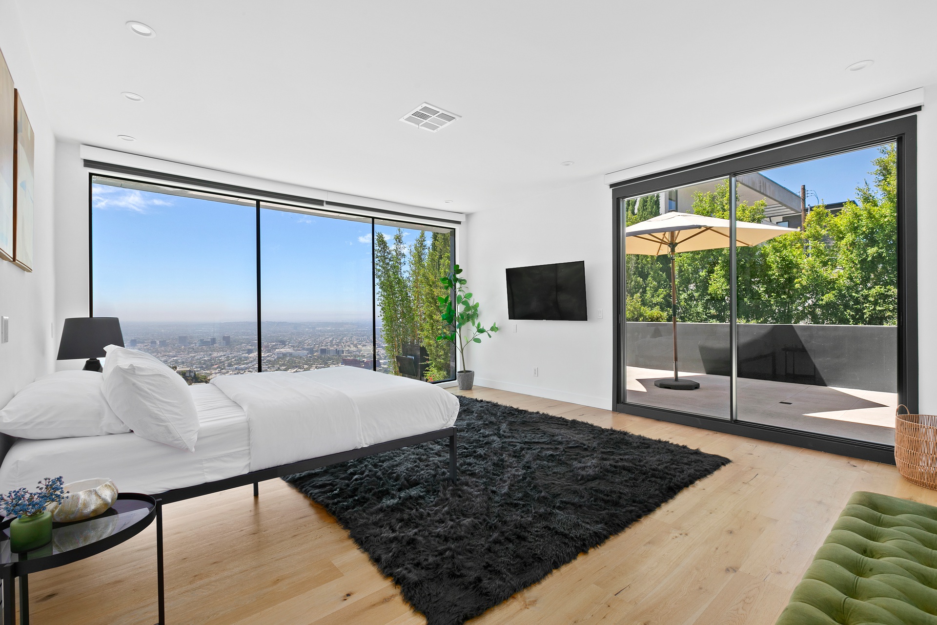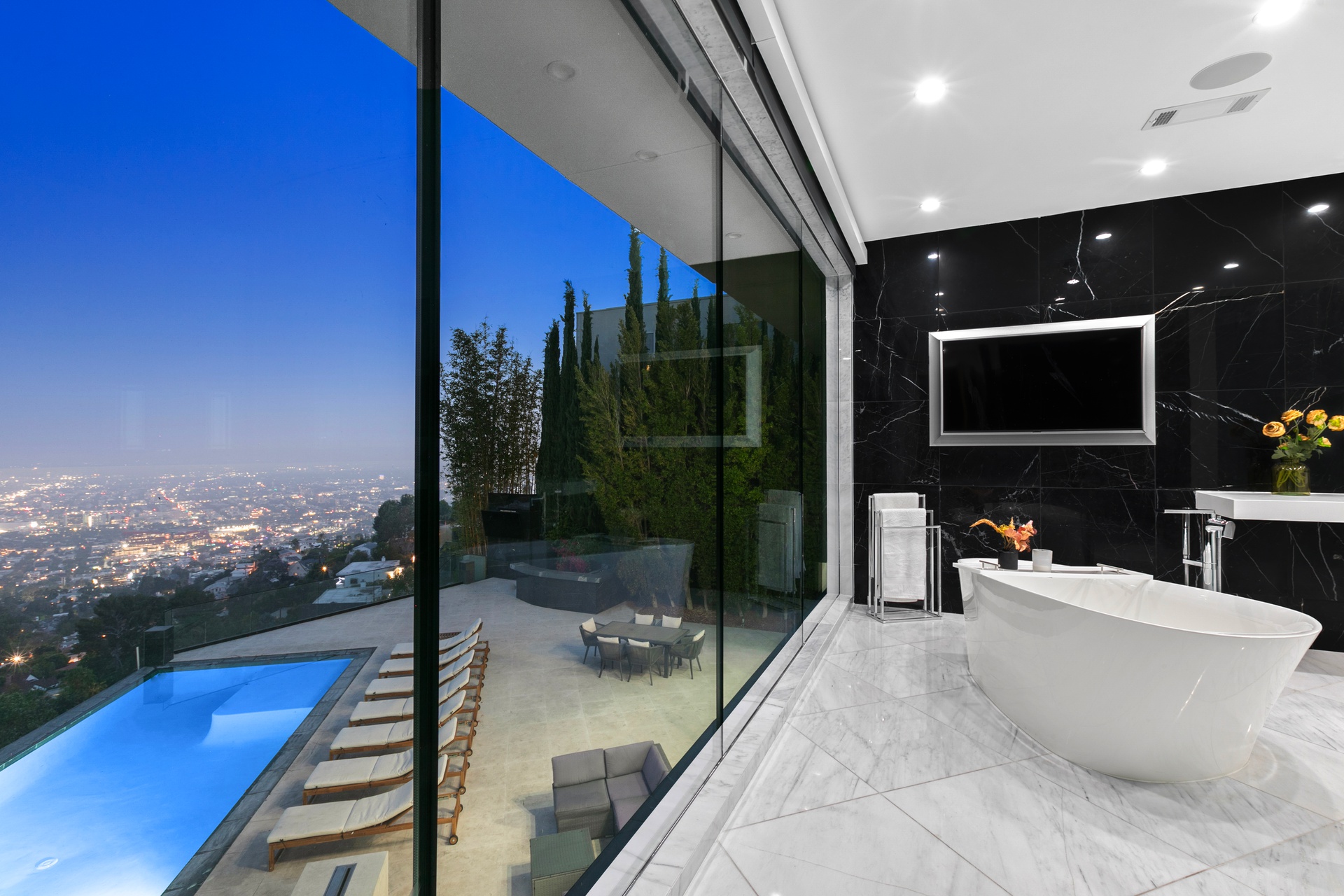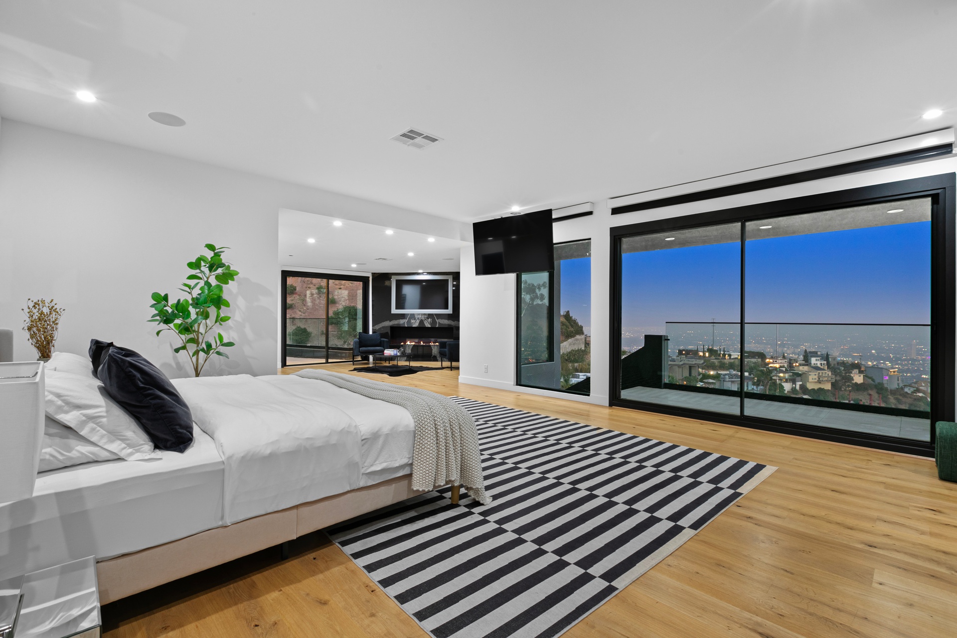 Impeccable Sunset Strip modern with unobstructed views minutes from storied LA nightlife and tucked away on a four home private drive directly off of Sunset Plaza. Enter to a grand main level with sliding walls of glass and a family room with wall length fireplace and a glass wine cabinet.