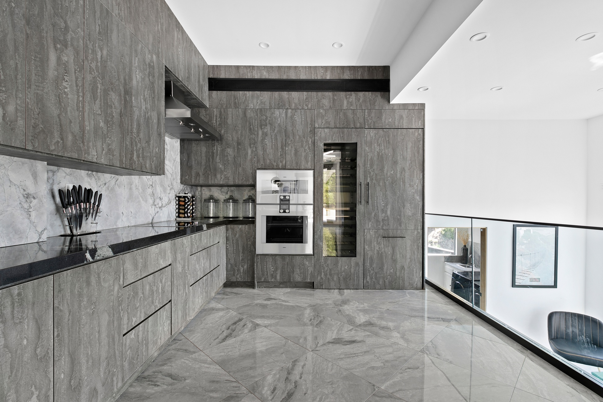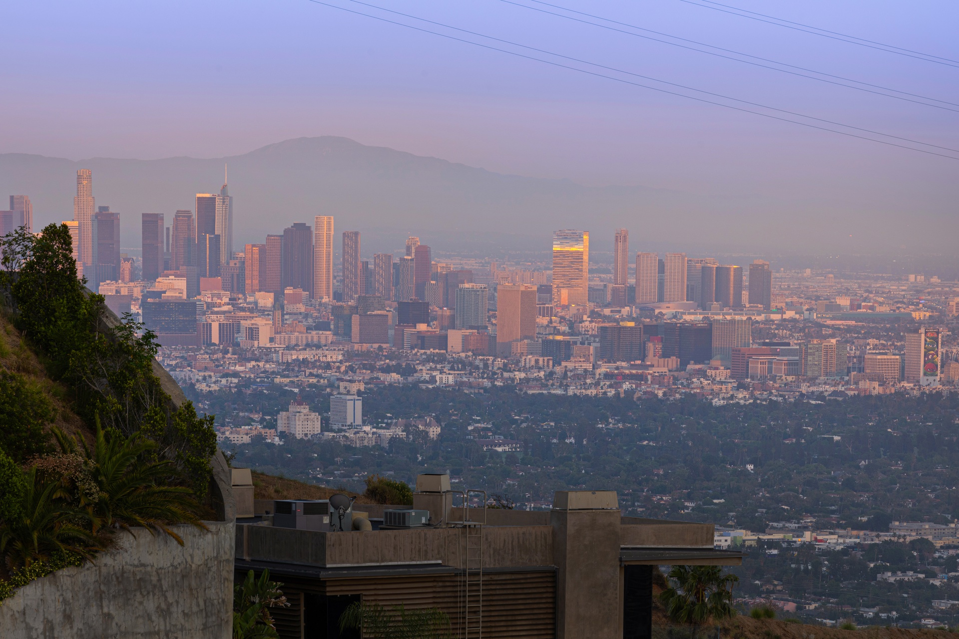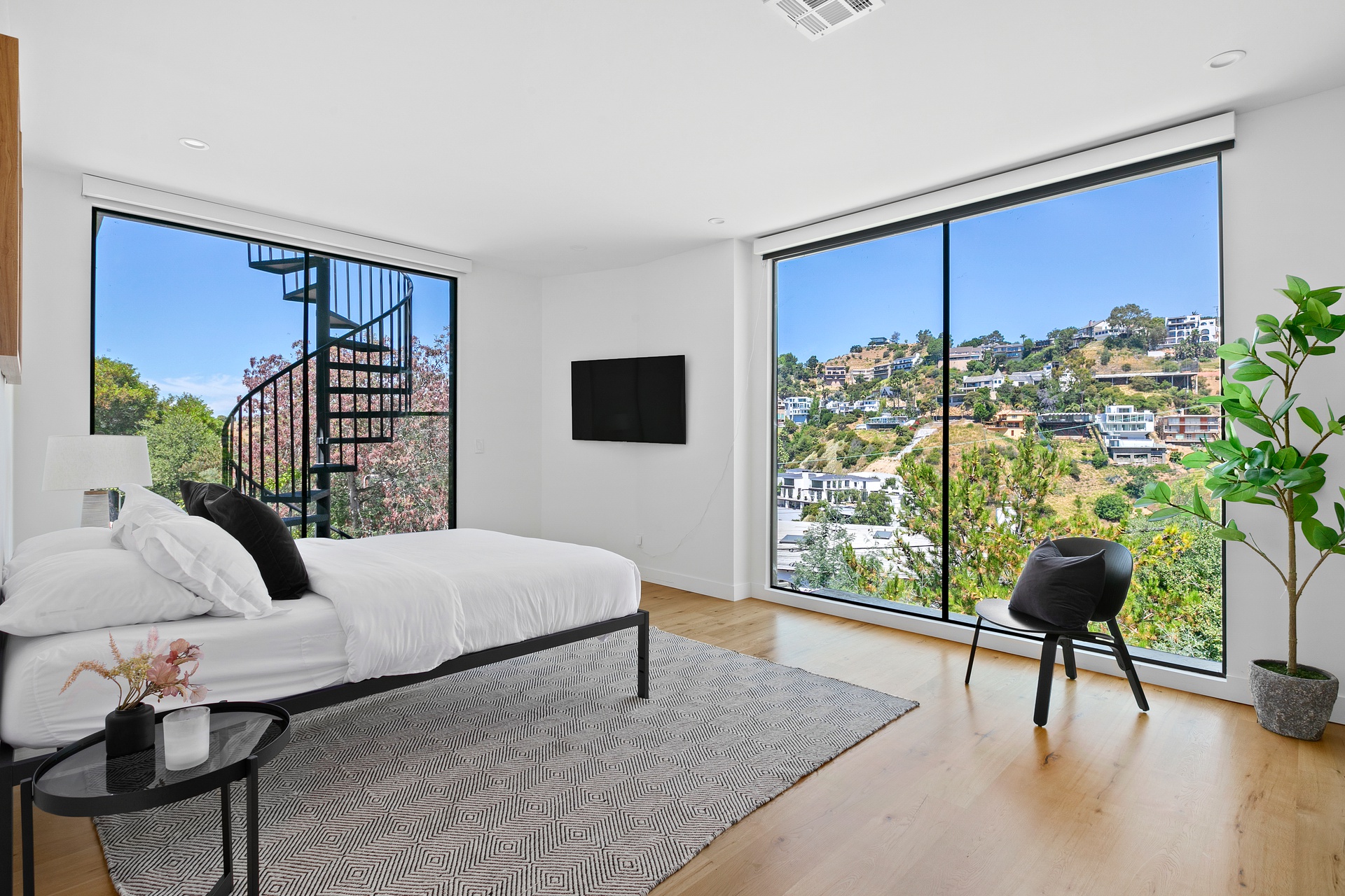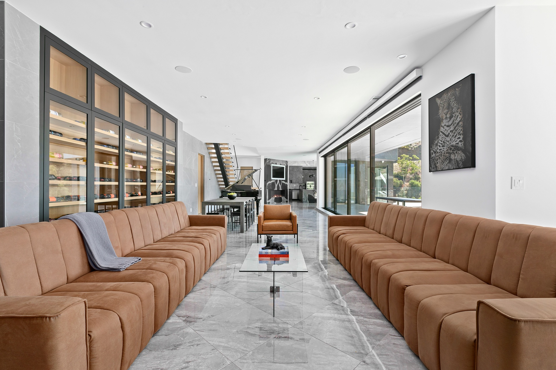Impeccable Sunset Strip modern with unobstructed views minutes from storied LA nightlife and tucked away on a four home private drive directly off of Sunset Plaza. Enter to a grand main level with sliding walls of glass and a family room with wall length fireplace and a glass wine cabinet.