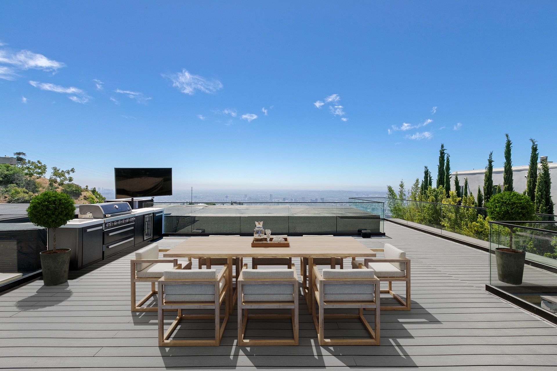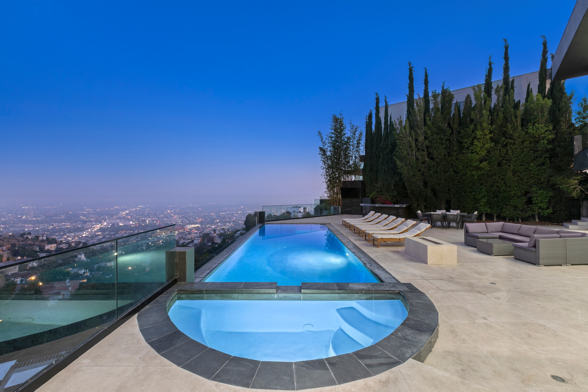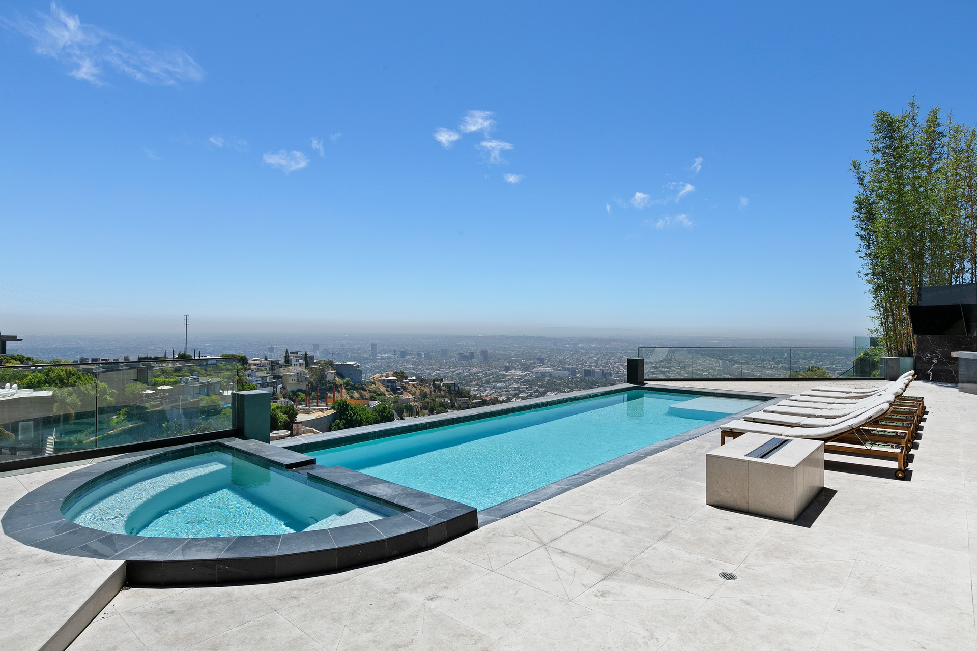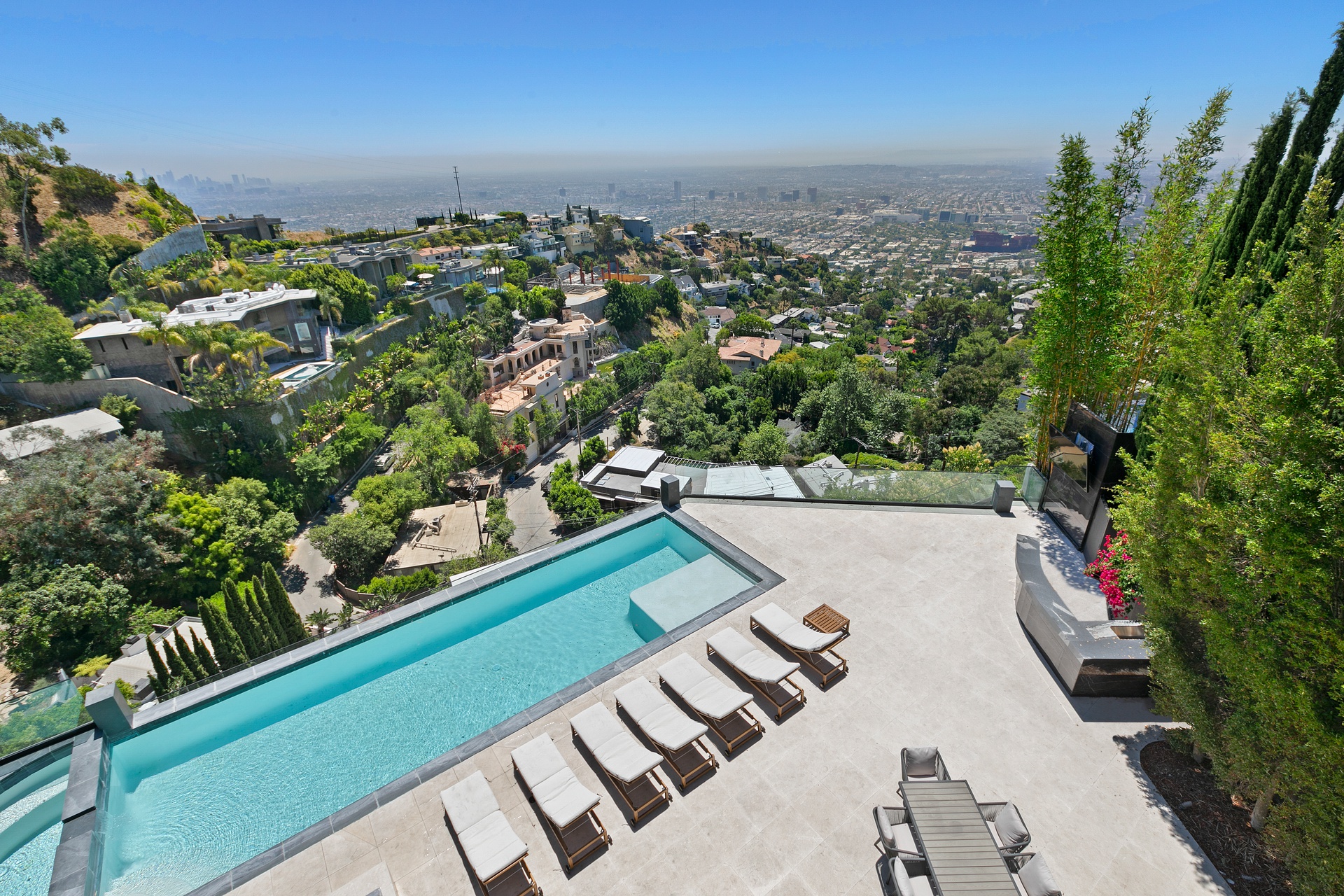 Impeccable Sunset Strip modern with unobstructed views minutes from storied LA nightlife and tucked away on a four home private drive directly off of Sunset Plaza. Enter to a grand main level with sliding walls of glass and a family room with wall length fireplace and a glass wine cabinet. Fully remodeled from the ground up with imported stone, custom appliances and fixtures, this is an entertainer's paradise. Four en suite bedrooms with high ceilings, five bathrooms, a chef's kitchen, a home theater and so much more. Ascend the spiral staircase to the 1000 squarefoot rooftop deck with a luxurious outdoor kitchen and take in the lights of LA. A sprawling outdoor area anchors this residence complete with an oversized infinity pool and spa as well as a wet bar and outdoor TV all backdropped by jetliner views stretching from downtown LA to Catalina Island.