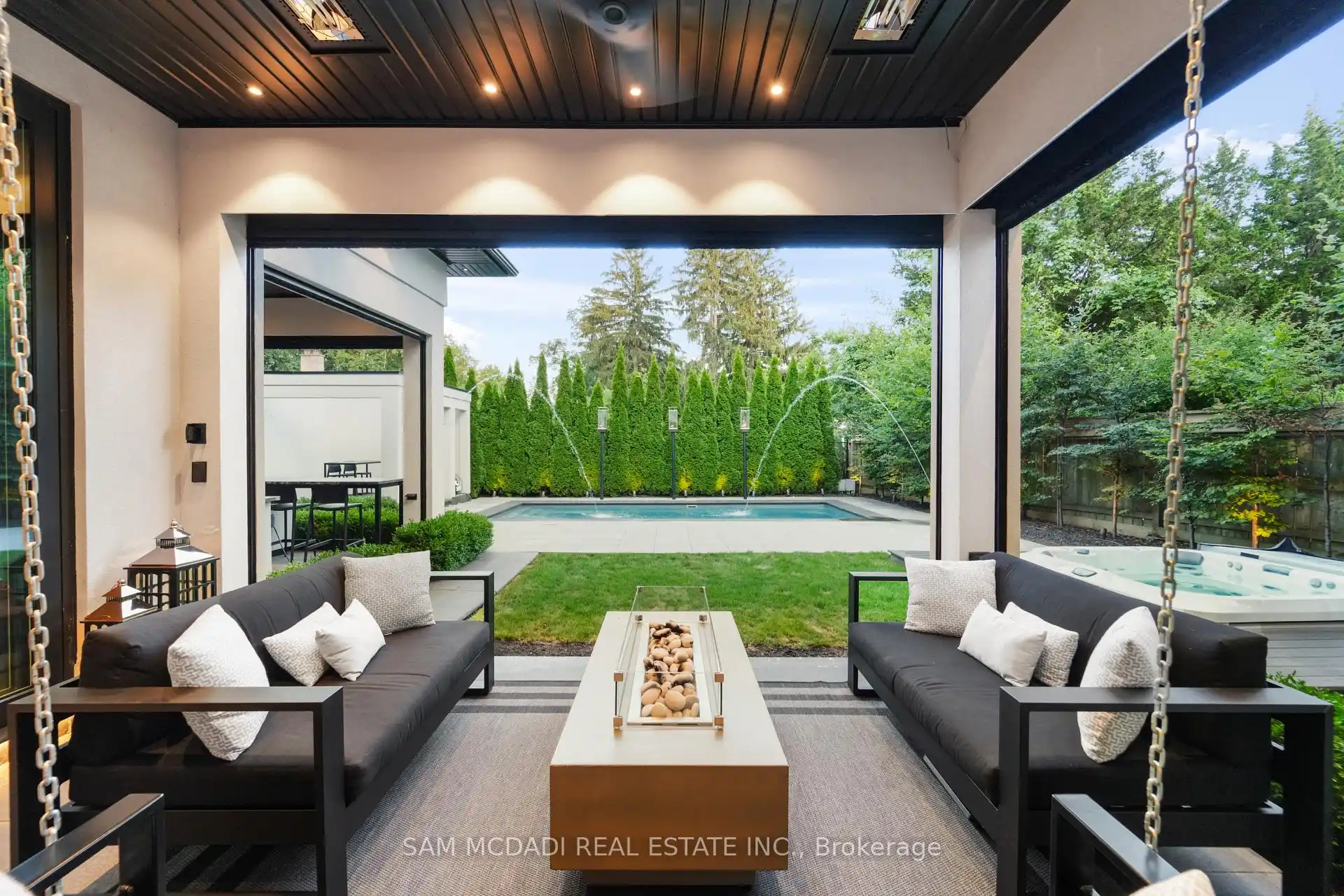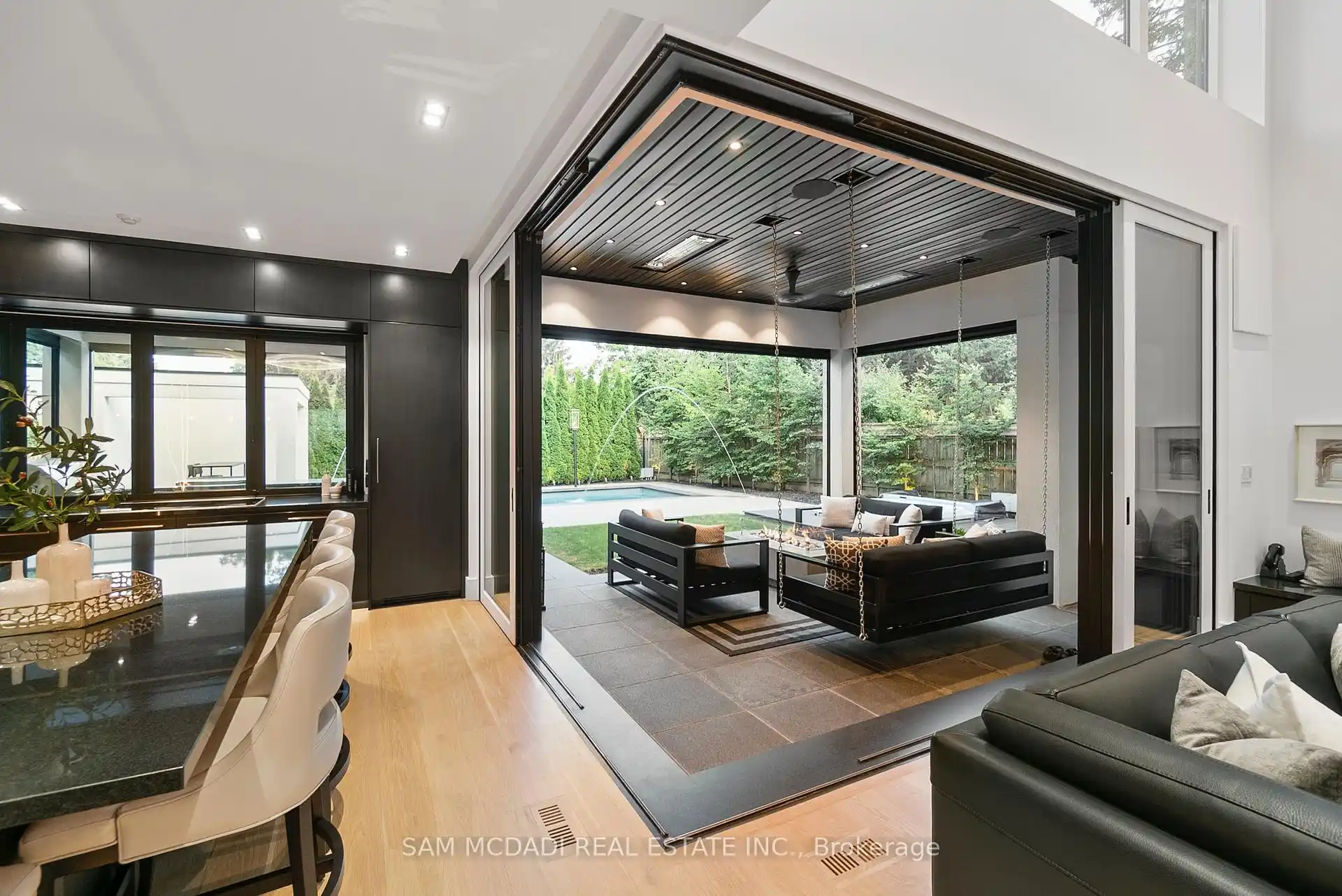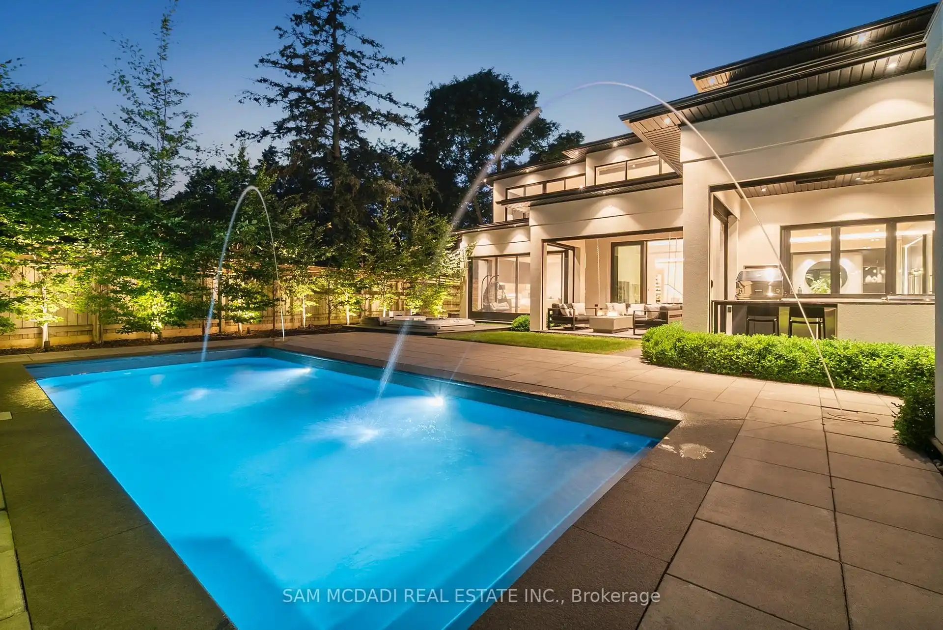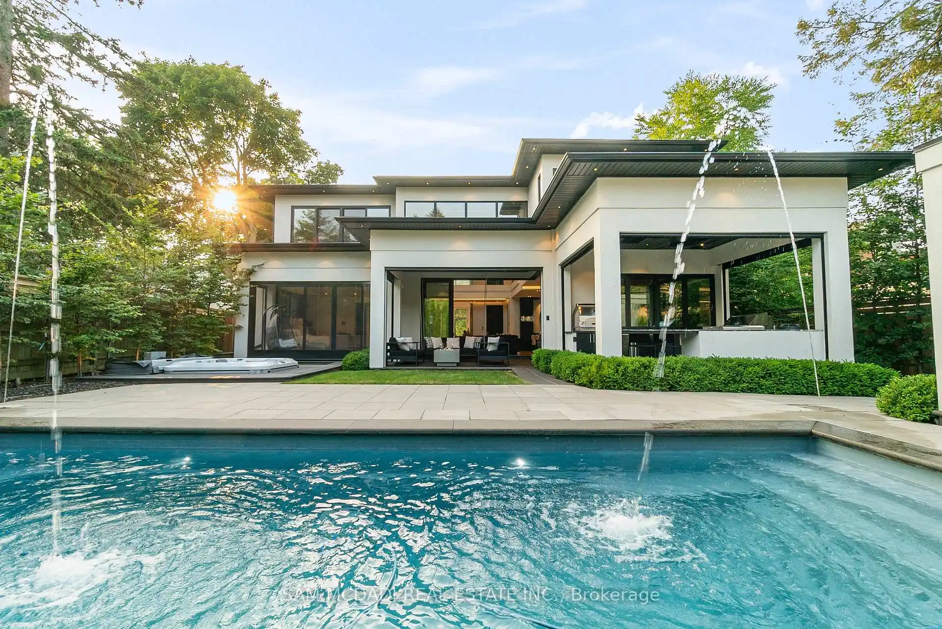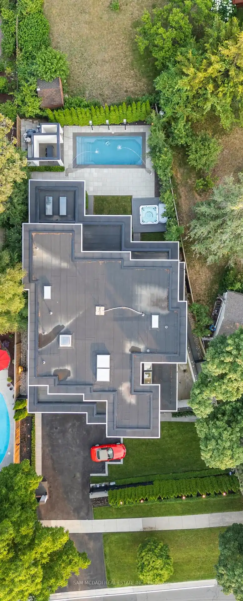 A rare offering, this fully gated, custom-built home blends timeless design with sophisticated modern living, offering over 7,000 square feet of luxurious, well-thought-out space. Designed by Hicks Design, the home showcases exceptional craftsmanship, sleek architectural lines, high-end finishes & natural light throughout, with thoughtfully placed skylights and expansive windows. The grand foyer makes a memorable first impression with soaring ceilings and a dramatic two-storey mirror-finish stainless steel waterfall. At the heart of the home is a well-designed, open-concept floor plan that seamlessly connects the kitchen, living, & dining areas. The custom Cameo chefs kitchen strikes the perfect balance of form and function, showcasing a marble waterfall island, Thermador appliances, custom cabinetry & effortless access to the private backyard retreat through automated Lift and Slide doors. The NanaWall opens to seamlessly connect the indoor and outdoor. The main floor primary suite is a sanctuary, complete with a spacious dressing room, laundry, double vanities, steam shower, and smart circadian rhythm lighting, as well as direct access to the hot tub and backyard. The second floor offers a second primary suite, and two additional bedrooms, each with their own ensuite and a conveniently located secondary laundry area. It doesn't stop there! The basement is every entertainer's dream with a home theatre, gym, spa with steam and sauna, large recreation space, sleek wet bar, and nanny suite. Enjoy resort-style living outdoors with a saltwater pool, hot tub, outdoor kitchen, and a three season covered porch with infrared heaters and retractable screens for year-round enjoyment. Additional highlights include an elevator, wide doorways, radiant heated floors, intelligent glass with UV/security film, Control4 technology, and integrated sound system. A rare blend of comfort, design, and luxury, expertly curated for modern living & refined entertaining. Truly one-of-a-kind!