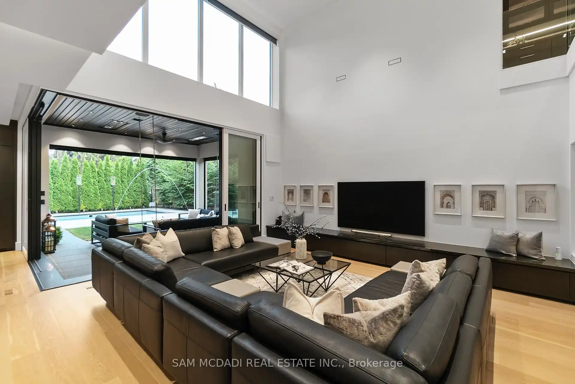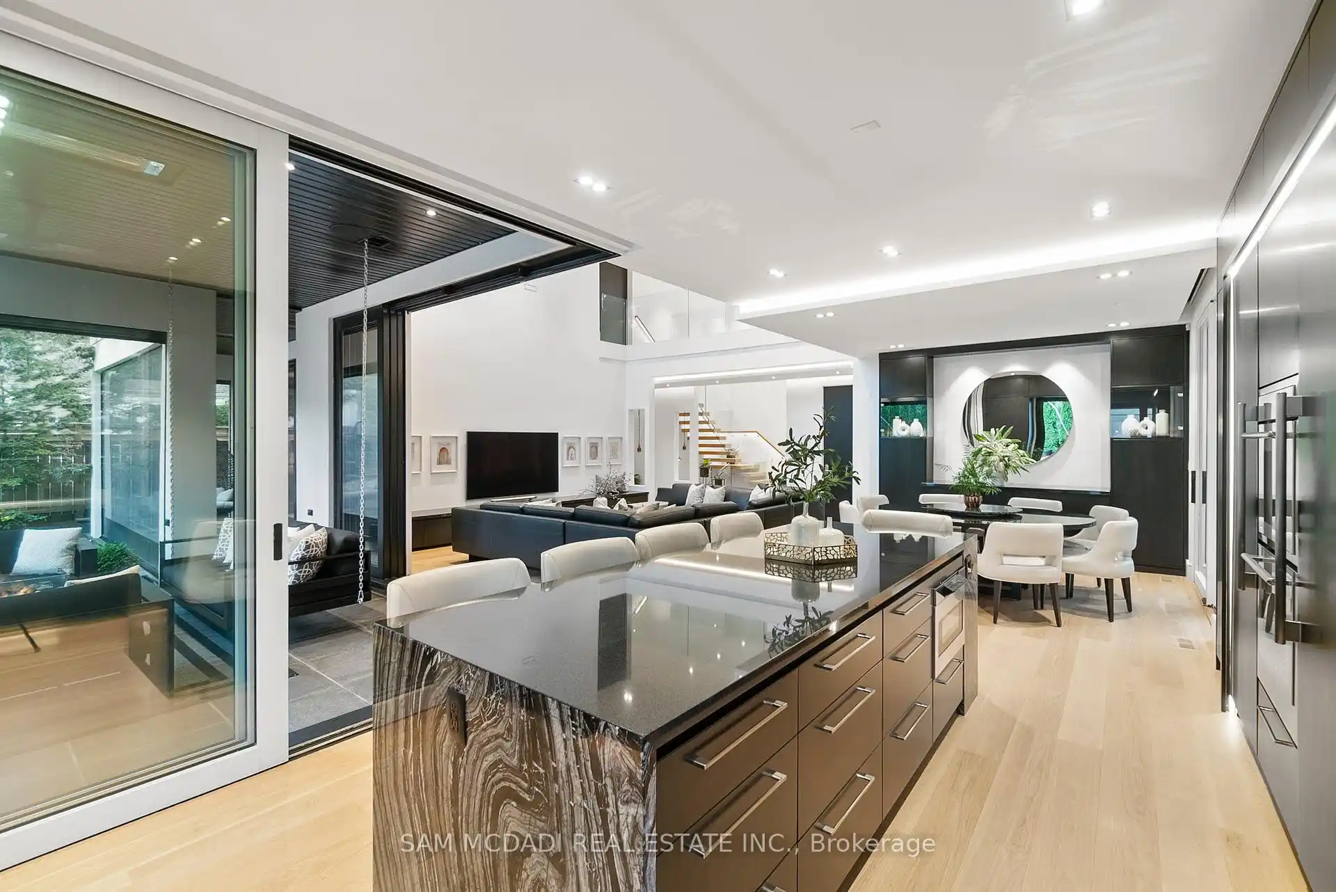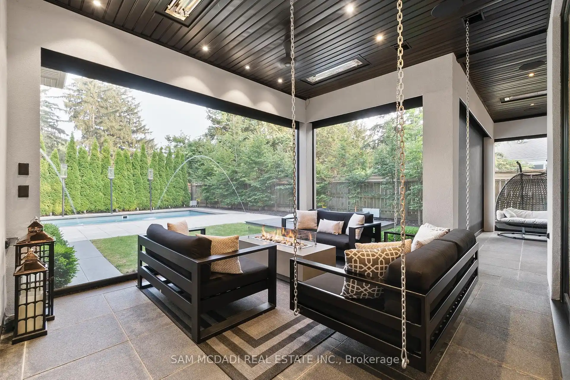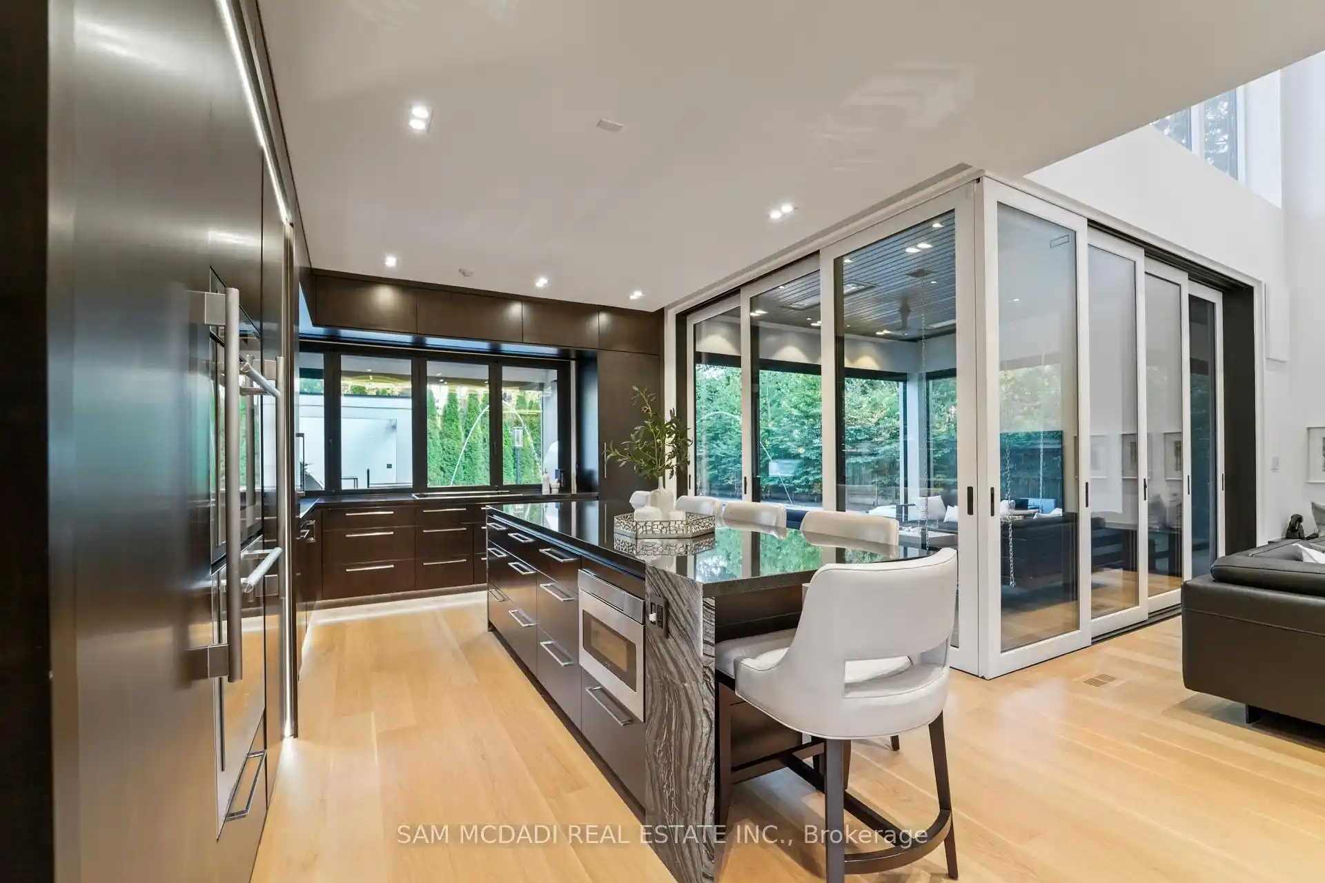 A rare offering, this fully gated, custom-built home blends timeless design with sophisticated modern living, offering over 7,000 square feet of luxurious, well-thought-out space. Designed by Hicks Design, the home showcases exceptional craftsmanship, sleek architectural lines, high-end finishes & natural light throughout, with thoughtfully placed skylights and expansive windows. The grand foyer makes a memorable first impression with soaring ceilings and a dramatic two-storey mirror-finish stainless steel waterfall. At the heart of the home is a well-designed, open-concept floor plan that seamlessly connects the kitchen, living, & dining areas. The custom Cameo chefs kitchen strikes the perfect balance of form and function, showcasing a marble waterfall island, Thermador appliances, custom cabinetry & effortless access to the private backyard retreat through automated Lift and Slide doors. The NanaWall opens to seamlessly connect the indoor and outdoor. The main floor primary suite is a sanctuary, complete with a spacious dressing room, laundry, double vanities, steam shower, and smart circadian rhythm lighting, as well as direct access to the hot tub and backyard. The second floor offers a second primary suite, and two additional bedrooms, each with their own ensuite and a conveniently located secondary laundry area. It doesn't stop there! The basement is every entertainer's dream with a home theatre, gym, spa with steam and sauna, large recreation space, sleek wet bar, and nanny suite. Enjoy resort-style living outdoors with a saltwater pool, hot tub, outdoor kitchen, and a three season covered porch with infrared heaters and retractable screens for year-round enjoyment. Additional highlights include an elevator, wide doorways, radiant heated floors, intelligent glass with UV/security film, Control4 technology, and integrated sound system. A rare blend of comfort, design, and luxury, expertly curated for modern living & refined entertaining. Truly one-of-a-kind!
