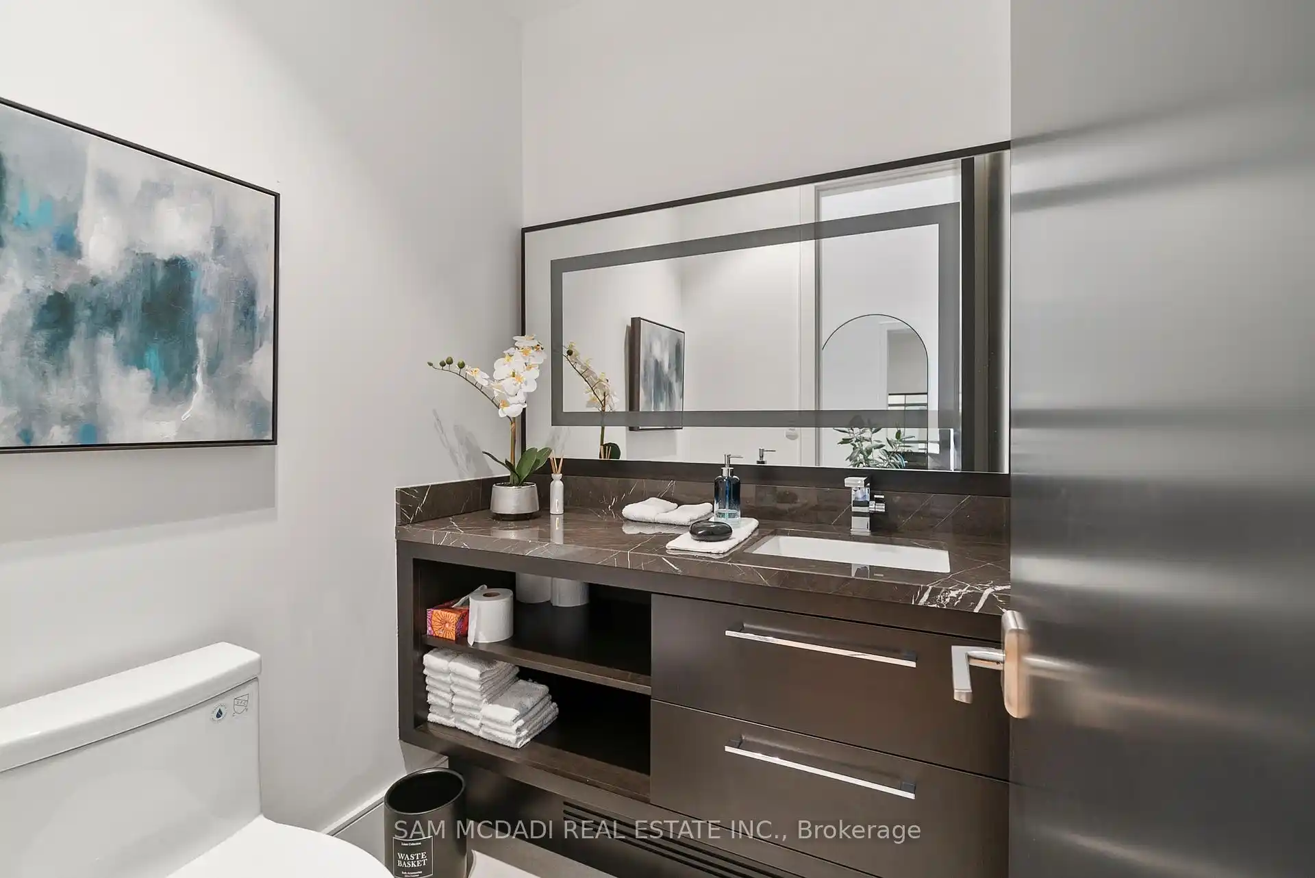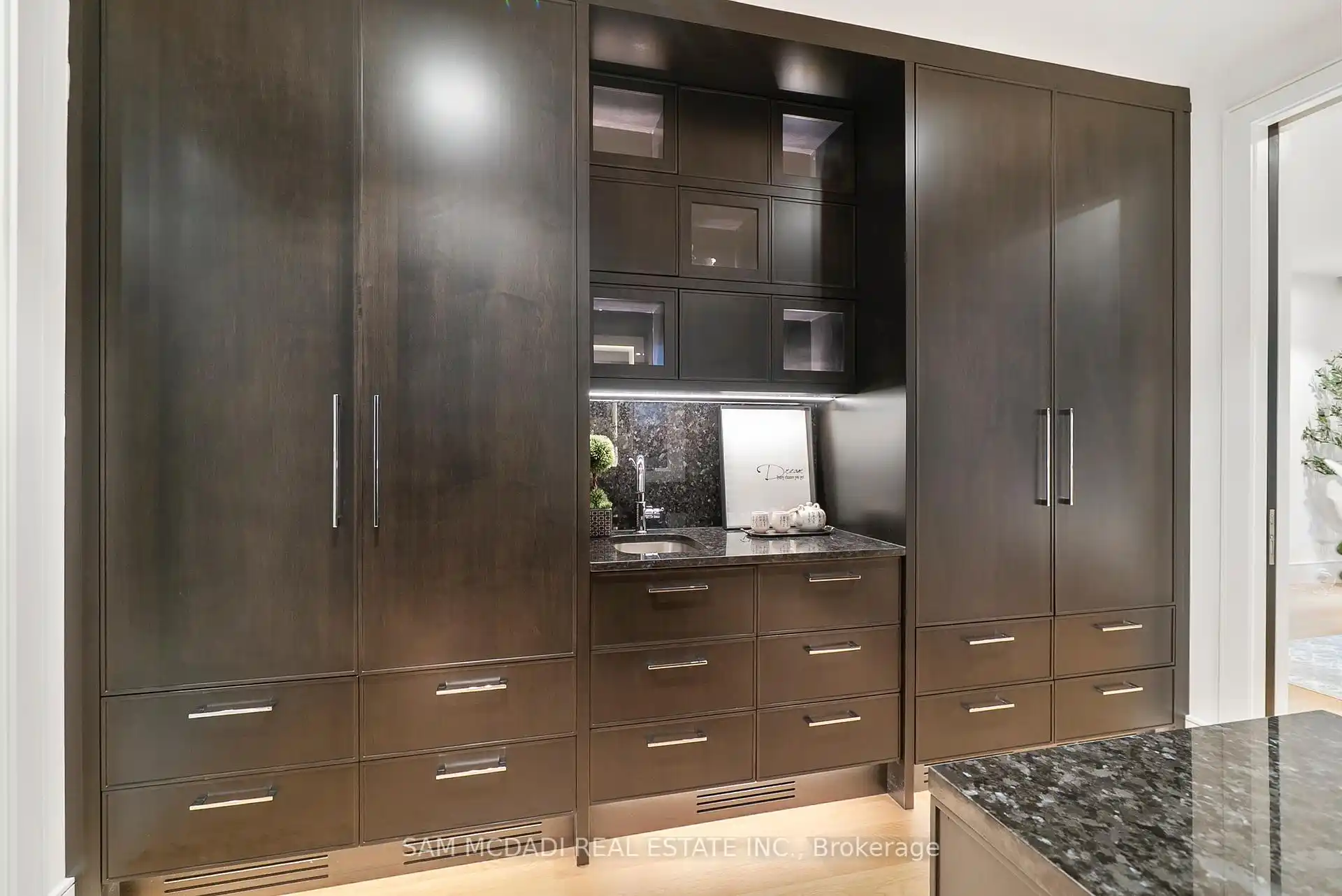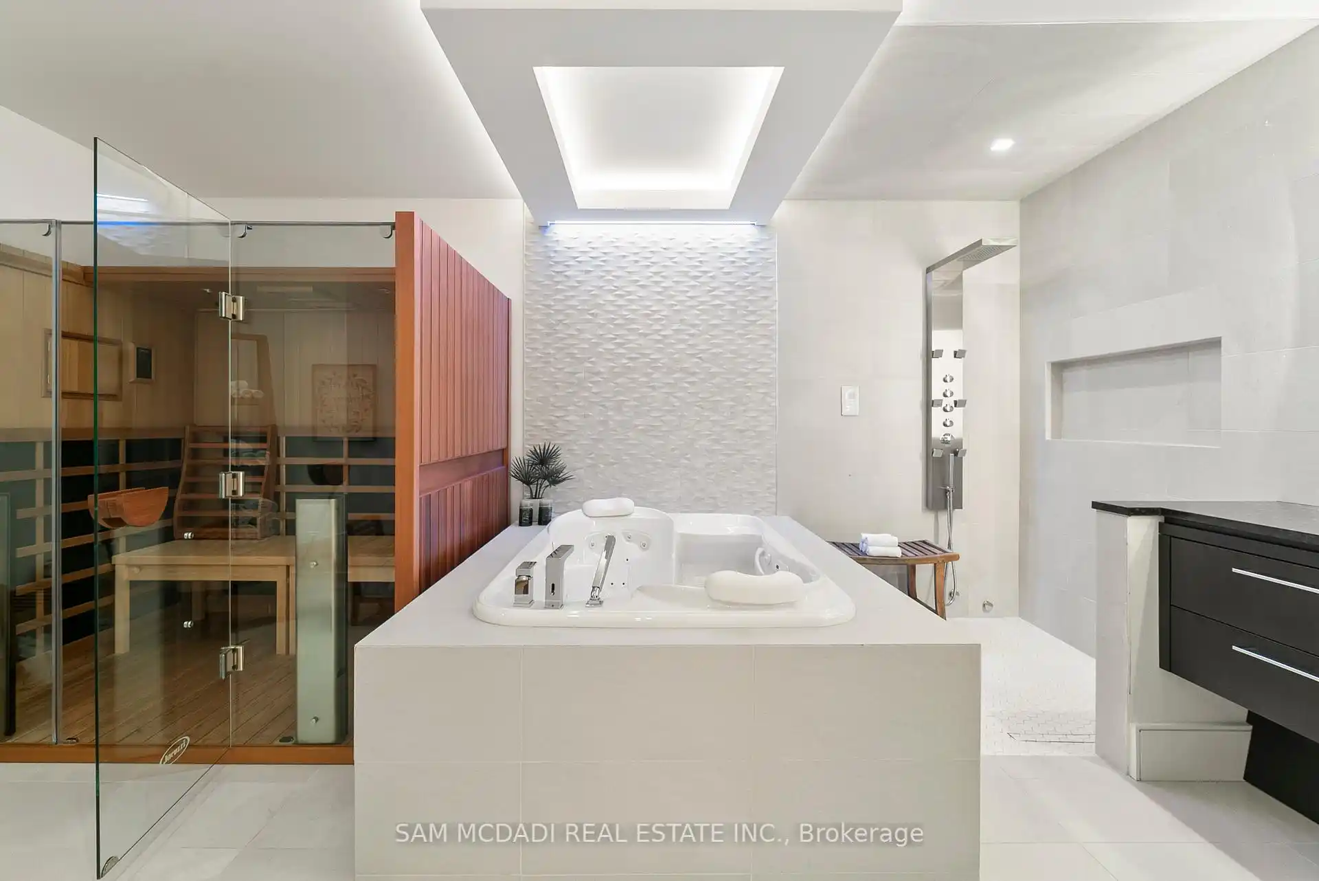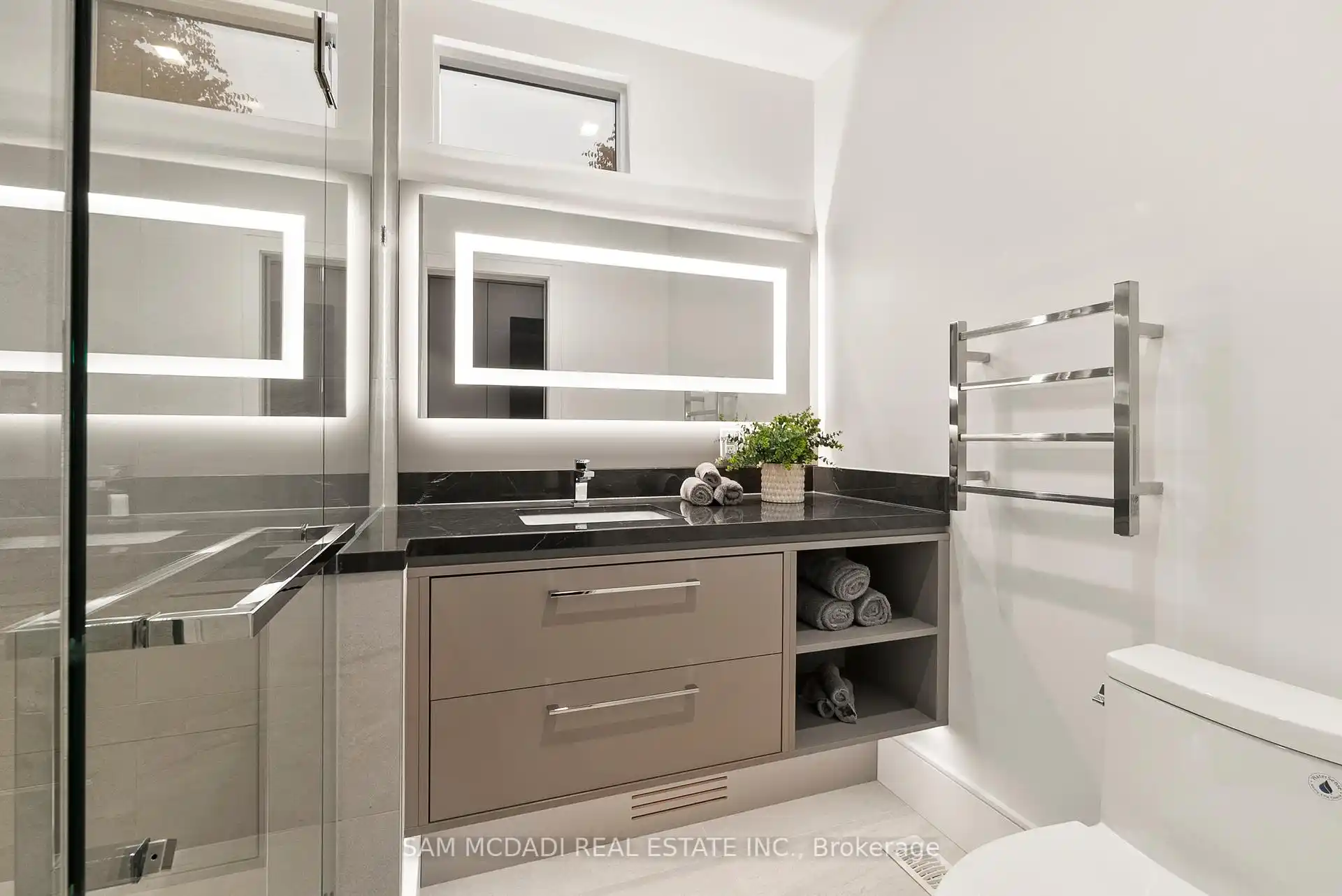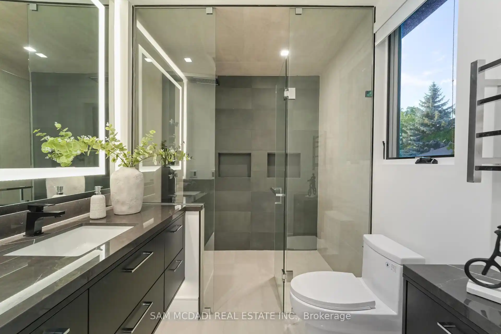 A rare offering, this fully gated, custom-built home blends timeless design with sophisticated modern living, offering over 7,000 square feet of luxurious, well-thought-out space. Designed by Hicks Design, the home showcases exceptional craftsmanship, sleek architectural lines, high-end finishes & natural light throughout, with thoughtfully placed skylights and expansive windows. The grand foyer makes a memorable first impression with soaring ceilings and a dramatic two-storey mirror-finish stainless steel waterfall. At the heart of the home is a well-designed, open-concept floor plan that seamlessly connects the kitchen, living, & dining areas. The custom Cameo chefs kitchen strikes the perfect balance of form and function, showcasing a marble waterfall island, Thermador appliances, custom cabinetry & effortless access to the private backyard retreat through automated Lift and Slide doors. The NanaWall opens to seamlessly connect the indoor and outdoor. The main floor primary suite is a sanctuary, complete with a spacious dressing room, laundry, double vanities, steam shower, and smart circadian rhythm lighting, as well as direct access to the hot tub and backyard. The second floor offers a second primary suite, and two additional bedrooms, each with their own ensuite and a conveniently located secondary laundry area. It doesn't stop there! The basement is every entertainer's dream with a home theatre, gym, spa with steam and sauna, large recreation space, sleek wet bar, and nanny suite. Enjoy resort-style living outdoors with a saltwater pool, hot tub, outdoor kitchen, and a three season covered porch with infrared heaters and retractable screens for year-round enjoyment. Additional highlights include an elevator, wide doorways, radiant heated floors, intelligent glass with UV/security film, Control4 technology, and integrated sound system. A rare blend of comfort, design, and luxury, expertly curated for modern living & refined entertaining. Truly one-of-a-kind!