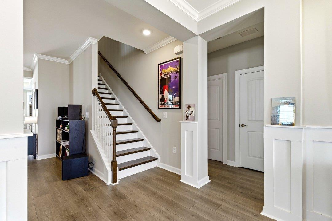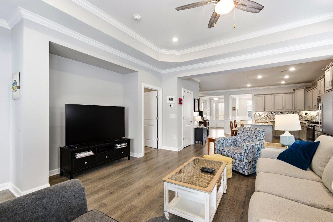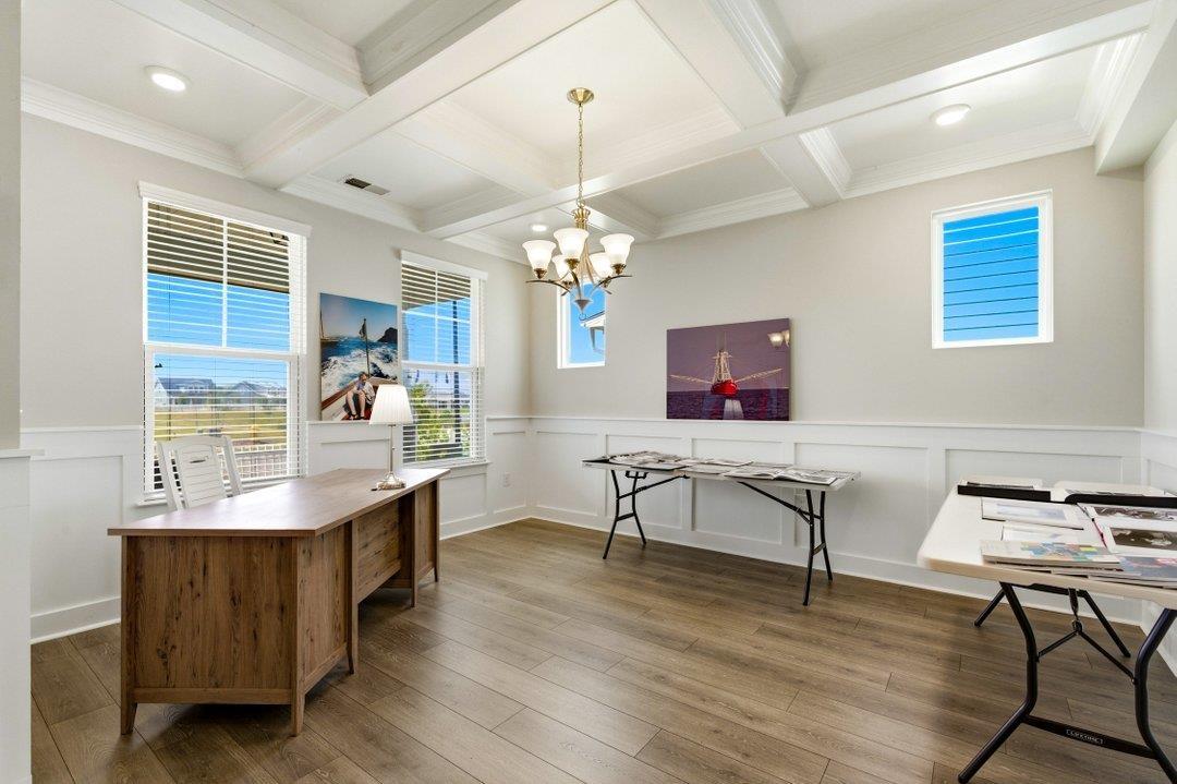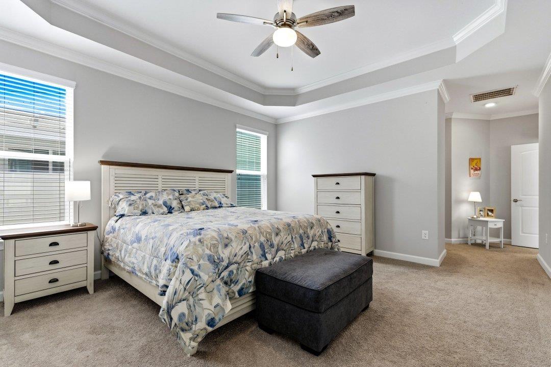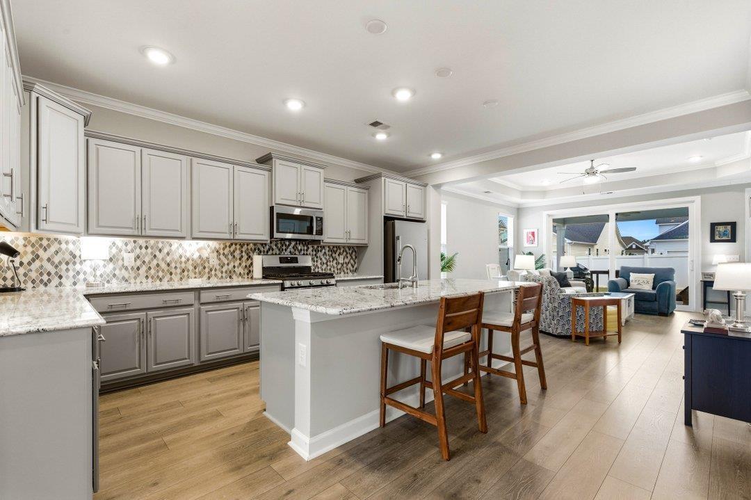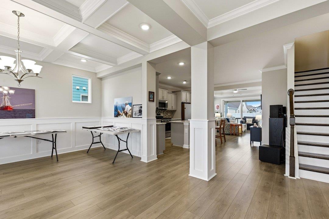 Beautiful home on a premium lot offering stunning lake views from the spacious front porch. This charming cottage-style home, located in a natural gas community, boasts exceptional curb appeal and sits directly across from the outstanding amenities in Bridgewater. Just a few miles from the beach in the Cherry Grove section of North Myrtle Beach, the location is hard to beat. The exterior features a two-car rear-load garage, a nicely fenced backyard, covered patio, tropical landscaping, and fresh mulch. Inside, this well-maintained home shows beautifully and offers 4 bedrooms, with the fourth serving as a large bedroom or flexible bonus space, along with 3 full bathrooms. The primary suite is conveniently located on the first floor, along with an additional bedroom and full bath. The primary bath includes an oversized tiled shower and a spacious walk-in closet with additional linen storage. The open floor plan is bright and airy, featuring a dedicated dining room with coffered ceilings, tray ceilings, LVP flooring, cottage-style doors, recessed lighting, and elegant finishes throughout. The kitchen is a standout, offering a large island, granite countertops, quality cabinetry, stainless steel appliances, and extensive crown molding and wainscoting. Additional features include a laundry room, tankless water heater, and wooden staircase leading to a large upstairs area complete with a bedroom, full bathroom, flex room, and an expansive walk-in storage space that could be finished if desired. This beach bungalow is ideally situated within the neighborhood, just a short distance to the amenities center. Bridgewater offers an impressive array of features, including a 5,000-square-foot clubhouse, state-of-the-art fitness center, resort-style pool with cabanas, pickleball courts, kayak launch, outdoor grilling areas, dog parks, playground, and expansive green spaces for community events.