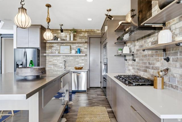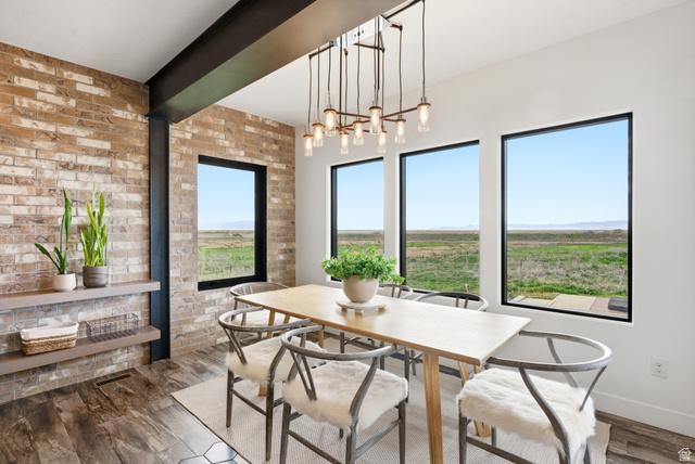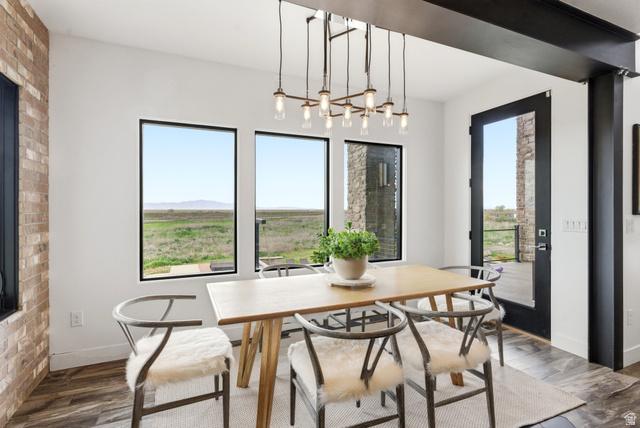 Great Salt Lake & Antelope Island views 1.21-acre estate Pool, spa, and theater room. Luxury 5 bed, 3.5 bath home with industrial-modern design, large windows, exposed beams, brick accents, floating stairs, and metal railings. Open-concept layout with incredible natural light oriented toward lake and sunset views.
