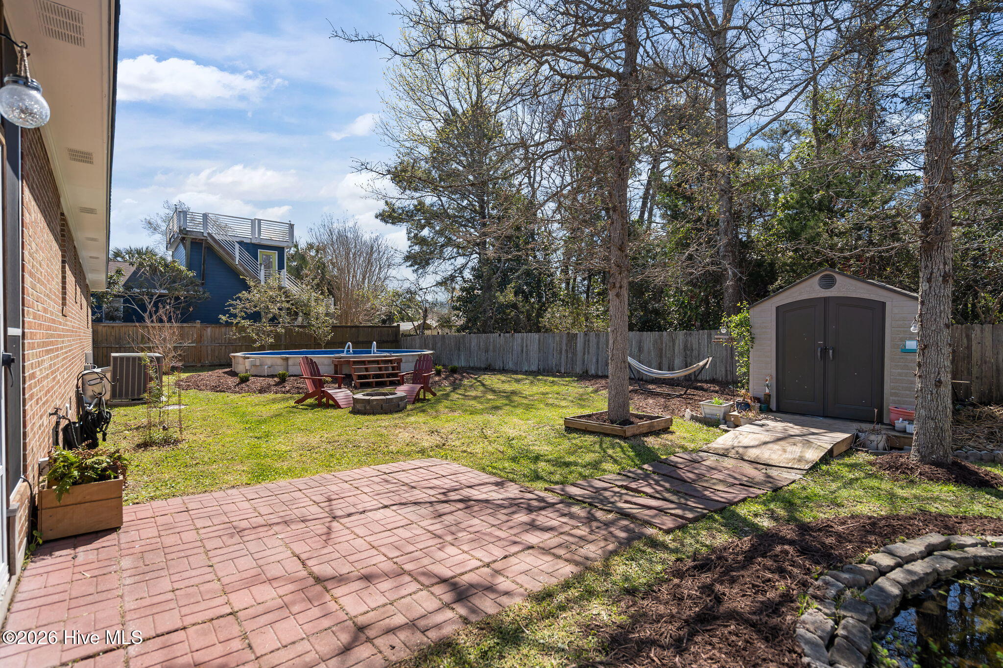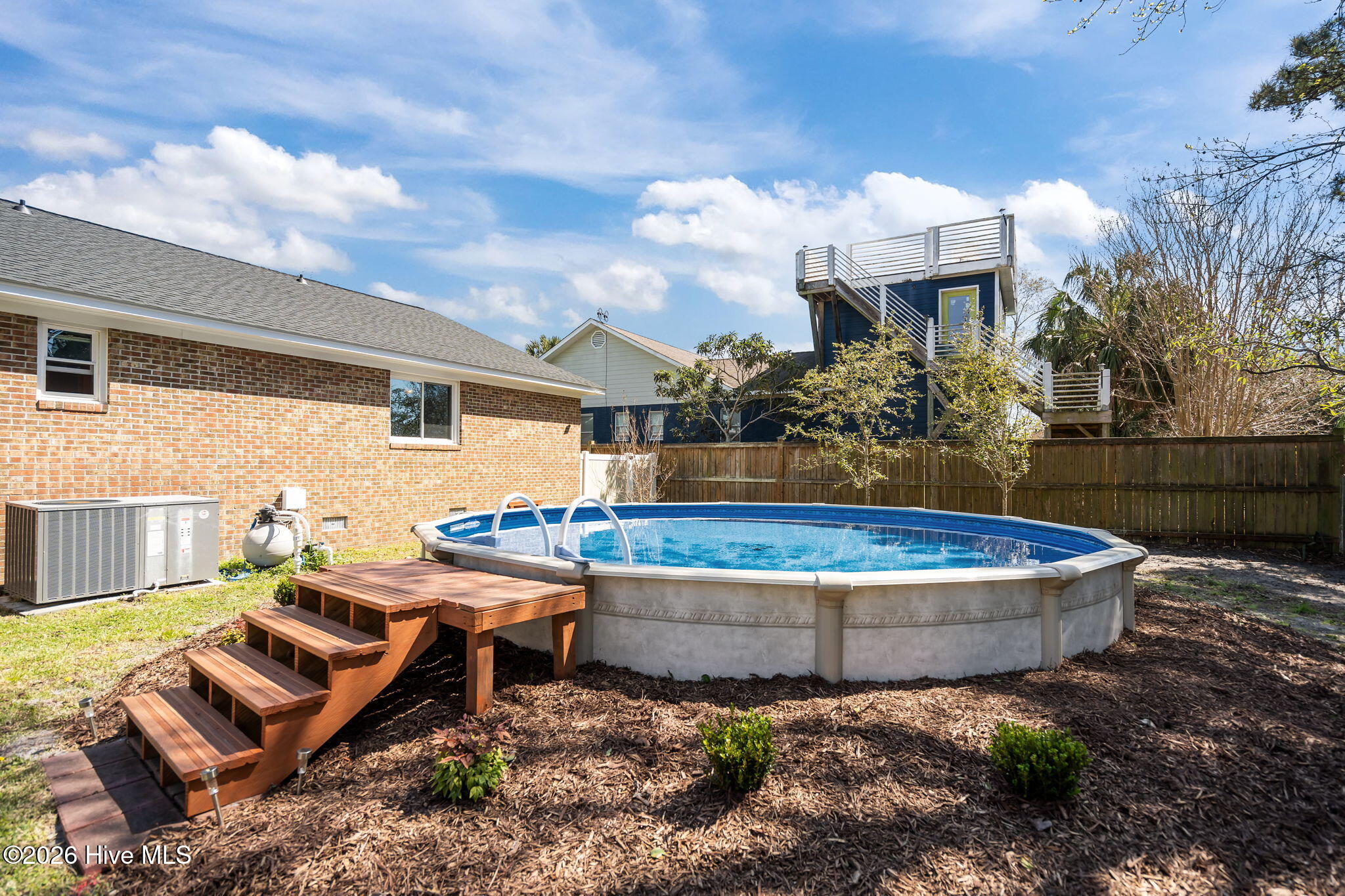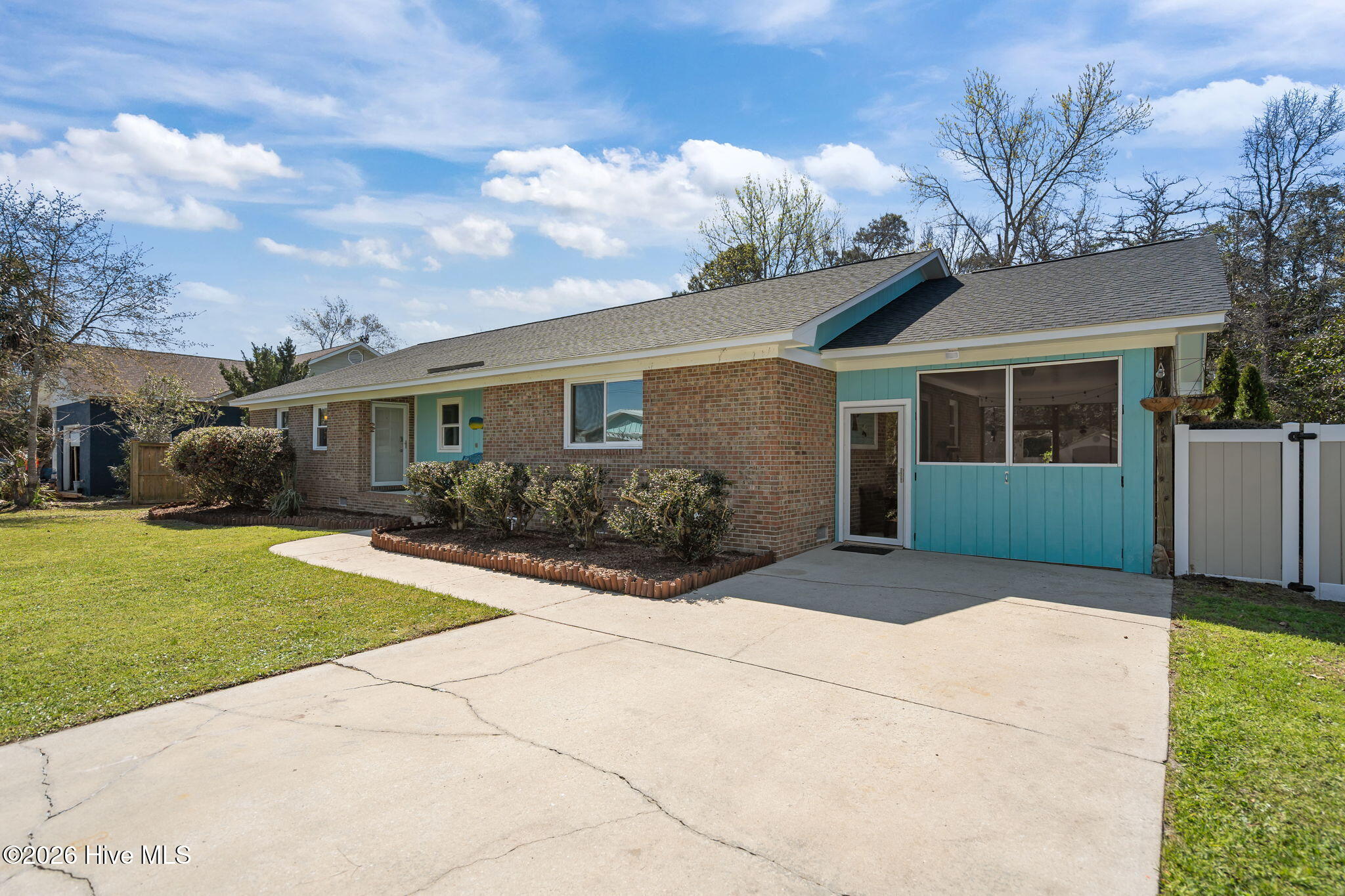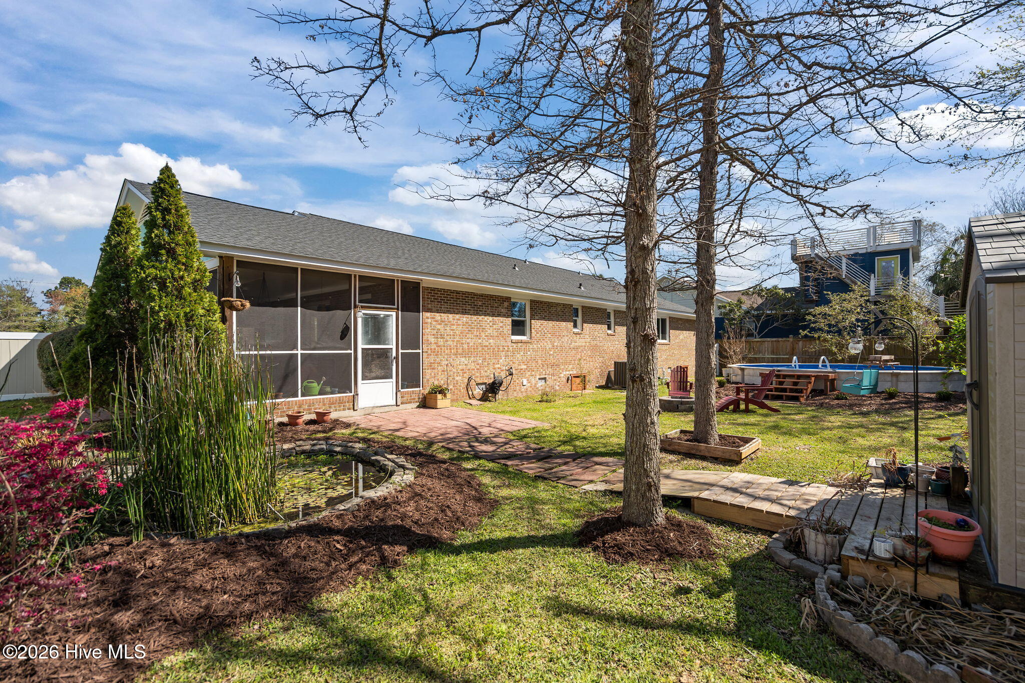 Excellent opportunity to own a spacious brick beach home in the heart of Carolina Beach. Situated on a rare .29 acre homesite-one of the largest on the island-this 4 bedroom, 3 full bath home offers 2,104 sq ft of coastal living with numerous updates throughout. Recent improvements include renovated bathrooms (guest 2020, family 2021, primary 2025), newer luxury vinyl plank flooring (2024-2025), and updated windows (2023). A covered front porch welcomes you into a bright living room centered around an electric fireplace with a classic brick surround. The kitchen features craftsman-style cabinetry with stacked uppers, stainless steel appliances, a newer refrigerator (2025), and a sunny breakfast nook. The primary suite includes a second electric fireplace and a well-appointed en suite bath with dual vanities, a tiled walk-in shower, and spacious walk-in closet. A secondary bedroom with en suite bath connects to a flexible living area with a sink and private porch access-ideal for a home office, playroom, guest suite, or multigenerational living. Two additional bedrooms and a generous laundry room complete the interior. Outdoor living truly sets this property apart. The expansive fenced backyard offers space to spread out, complete with a firepit overlooking the pond, an above-ground pool for warm coastal days, and a 6x8 shed for storage. The screened porch provides a shaded retreat and can open to function as a covered carport. Additional features include a newer water heater (2025), heat pump (2018), a fortified roof (2025), and the added benefit of not being located in a flood zone. Located just 4.5 blocks from Hamlet Public Beach Access, 0.6 miles to the iconic Carolina Beach Boardwalk, and even closer to numerous dining, shopping, and entertainment options. Whether youre searching for a primary residence, beach getaway, or investment opportunity, this property offers the space, updates, and location to make it happen.