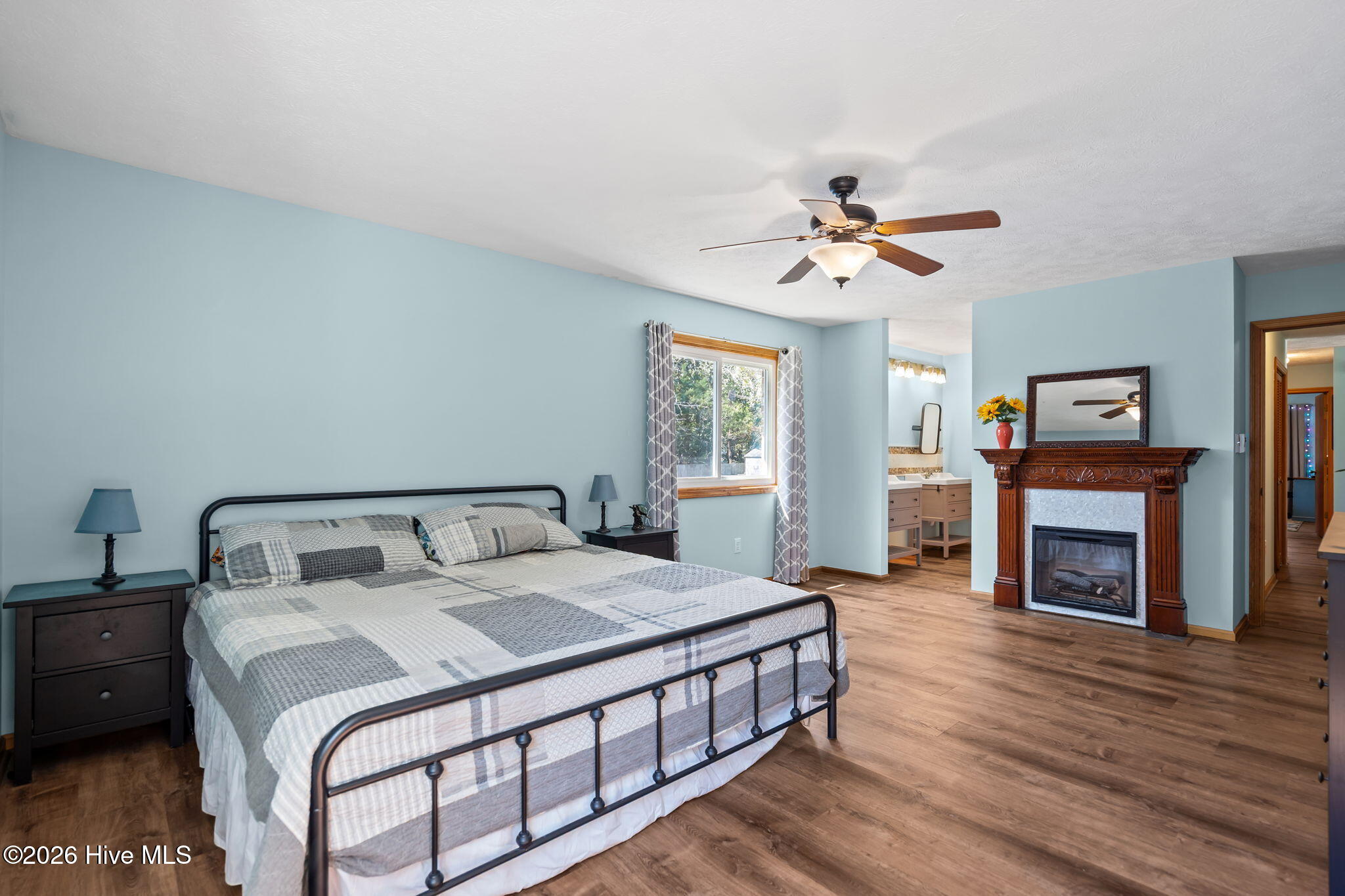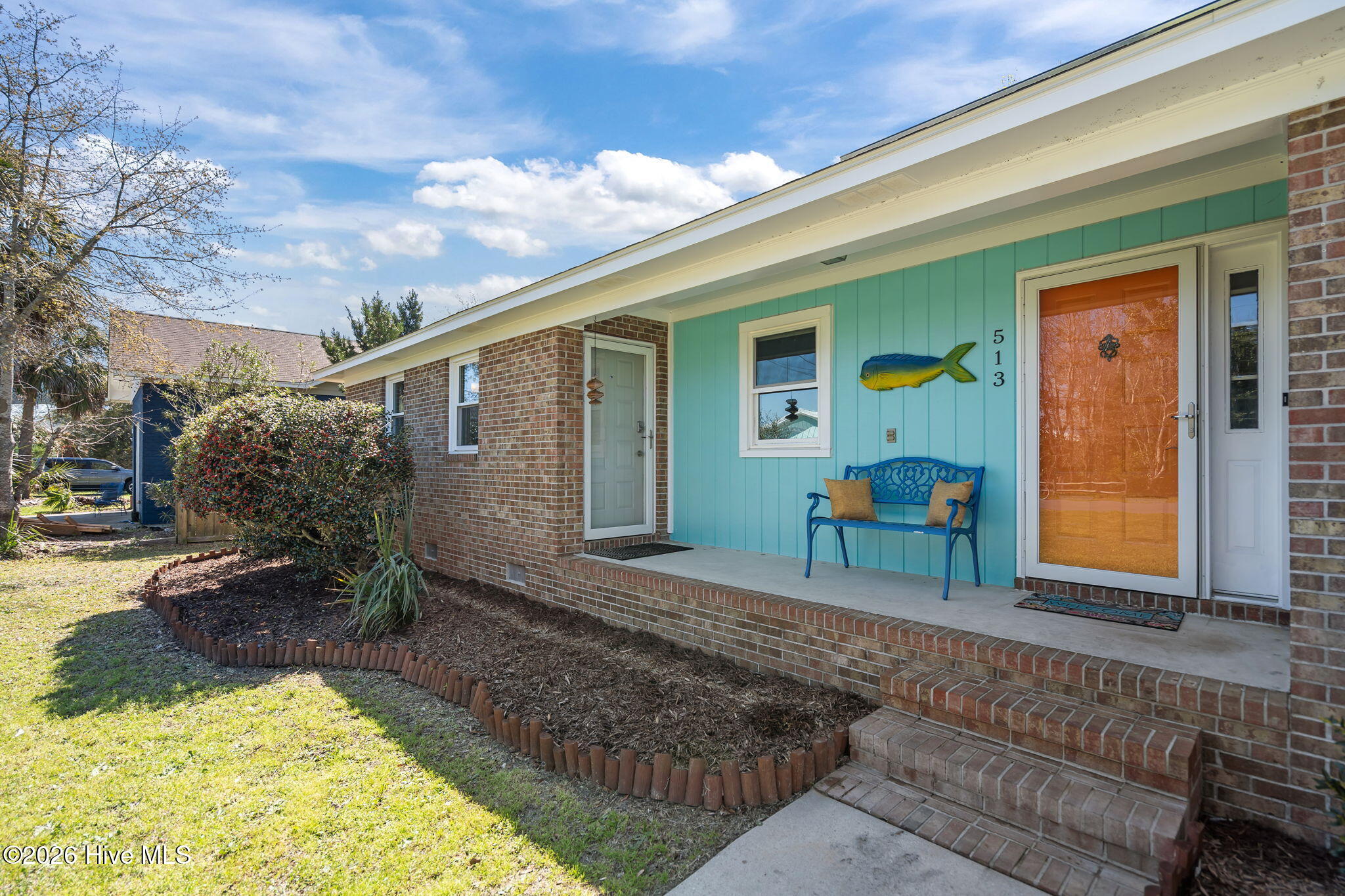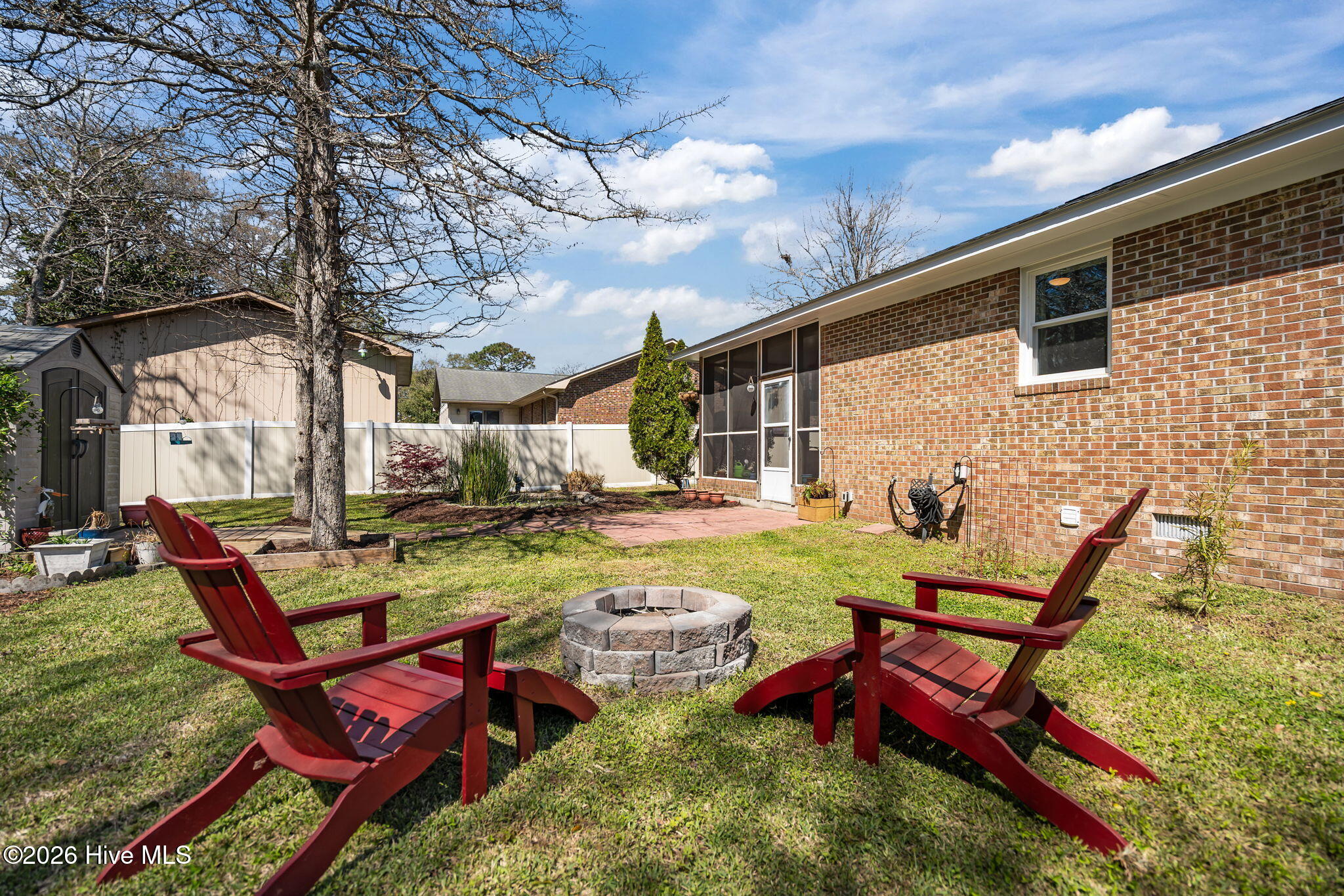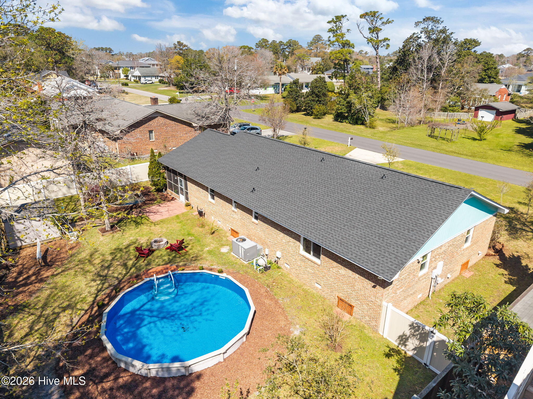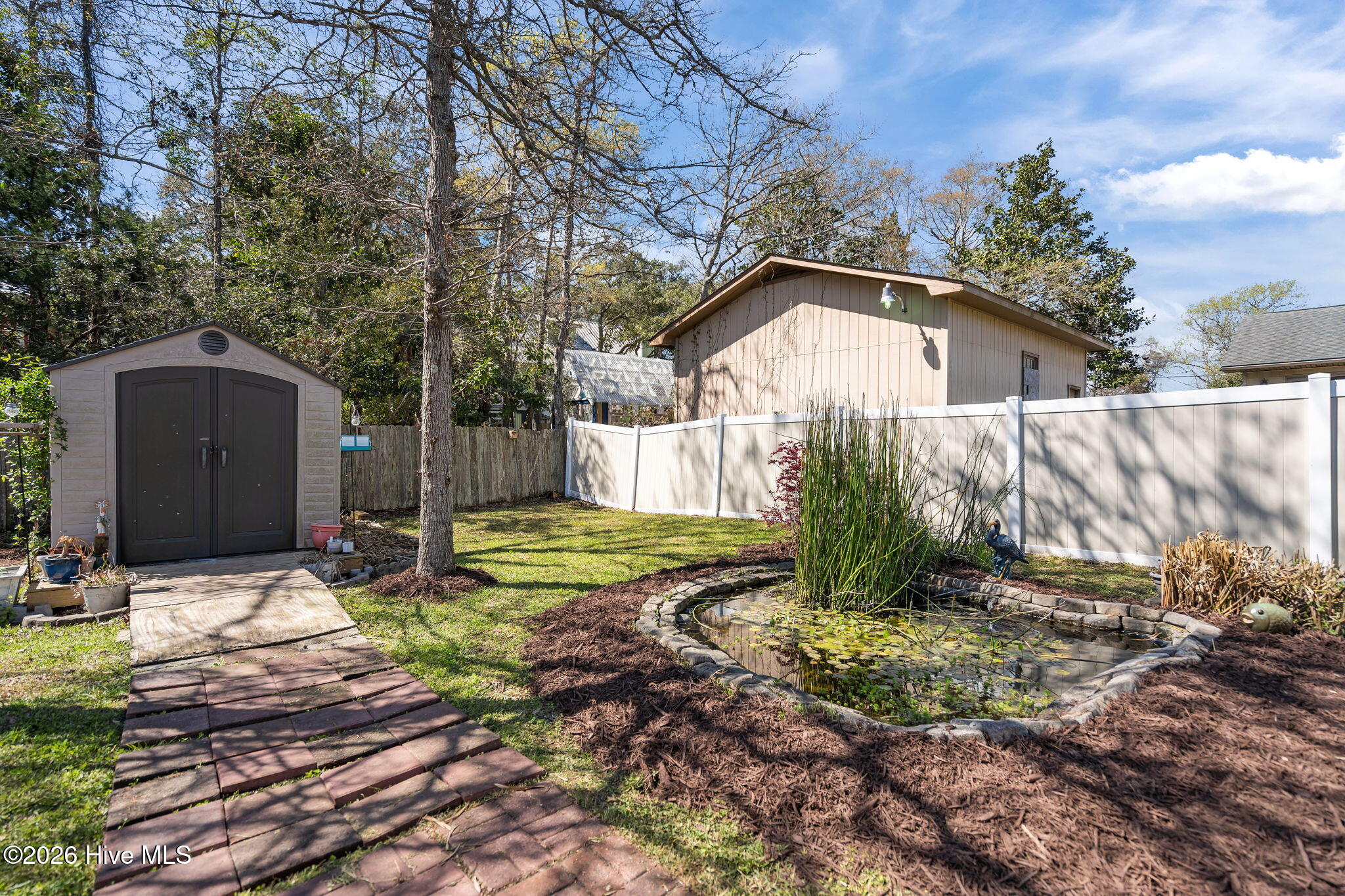 Excellent opportunity to own a spacious brick beach home in the heart of Carolina Beach. Situated on a rare .29 acre homesite-one of the largest on the island-this 4 bedroom, 3 full bath home offers 2,104 sq ft of coastal living with numerous updates throughout. Recent improvements include renovated bathrooms (guest 2020, family 2021, primary 2025), newer luxury vinyl plank flooring (2024-2025), and updated windows (2023). A covered front porch welcomes you into a bright living room centered around an electric fireplace with a classic brick surround. The kitchen features craftsman-style cabinetry with stacked uppers, stainless steel appliances, a newer refrigerator (2025), and a sunny breakfast nook. The primary suite includes a second electric fireplace and a well-appointed en suite bath with dual vanities, a tiled walk-in shower, and spacious walk-in closet. A secondary bedroom with en suite bath connects to a flexible living area with a sink and private porch access-ideal for a home office, playroom, guest suite, or multigenerational living. Two additional bedrooms and a generous laundry room complete the interior. Outdoor living truly sets this property apart. The expansive fenced backyard offers space to spread out, complete with a firepit overlooking the pond, an above-ground pool for warm coastal days, and a 6x8 shed for storage. The screened porch provides a shaded retreat and can open to function as a covered carport. Additional features include a newer water heater (2025), heat pump (2018), a fortified roof (2025), and the added benefit of not being located in a flood zone. Located just 4.5 blocks from Hamlet Public Beach Access, 0.6 miles to the iconic Carolina Beach Boardwalk, and even closer to numerous dining, shopping, and entertainment options. Whether youre searching for a primary residence, beach getaway, or investment opportunity, this property offers the space, updates, and location to make it happen.