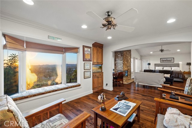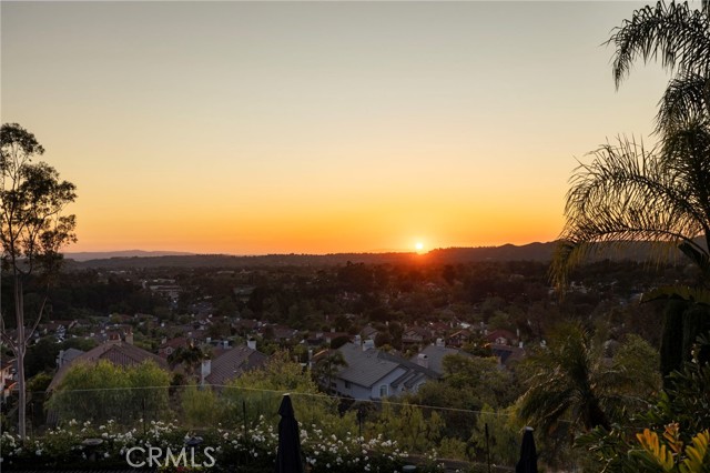 A Hilltop Oasis One of A Kind: Luxury Resort-Style Living with Panoramic 180-Degree Views. Discover the perfect blend of luxury and tranquility in this gated, private, quiet neighborhood with 3,728 sq ft of spacious living, 5 bedrooms (1 down/ full bath), 3.5 baths, bonus room and private retreat featuring breathtaking mountains, city and picturesque sunsets. Entertain effortlessly across your open-concept living, dining, and family rooms, Thoughtfully remodeled for sophisticated comfort, this home features an open floor plan with custom built-in wood cabinetry throughout. This transitional chefs kitchen is a masterpiece of convenience, custom built in double stacked cabinets and modern drawers, equipped with a 6-burner gas stove, pot-filler, Subzero freezer/fridge, Bosch dishwasher, butlers pantry, and expansive granite countertops, glass backsplash and convenient center island. Work out of home featuring custom built-in office spacious desks, French doors multiple cabinets and drawers. cozy fireplaces, The master suite is a private retreat boasting vaulted ceilings, a private fireplace, dual walk-in closets, and a spa-like bath with travertine floors and a custom double-head walk-in shower, custom built-in alder wood designer with extensive storage and vanity. Your outdoor oasis awaits: a modern tiled pool, a sparkling firepit, and a built-in BBQ island are designed for ultimate relaxation. Enjoy year-round entertaining in the covered lanai with electric shades, recessed and lanscape lighting, ceiling fans, and unobstructed views spanning to the horizon behind a sleek glass fence. A rare find featuring modern efficiency with 2 AC units, attic fans, water softener, and a tankless water heater. The backyard is a true retreat with a custom-tiled pool, paver decking, built-in BBQ island, and covered patio with shiplap ceiling, lighting, fans, outdoor TV, and drop-down shades. Professionally landscaped with synthetic turf, olive tree, lighting, glass fencing, and smart irrigation. Ideally located near Santa Margarita Lake, top-rated schools, scenic trails, and golf, this home offers incredible sunset views with ocean glimpses on clear days and views toward the Palos Verdes hills.