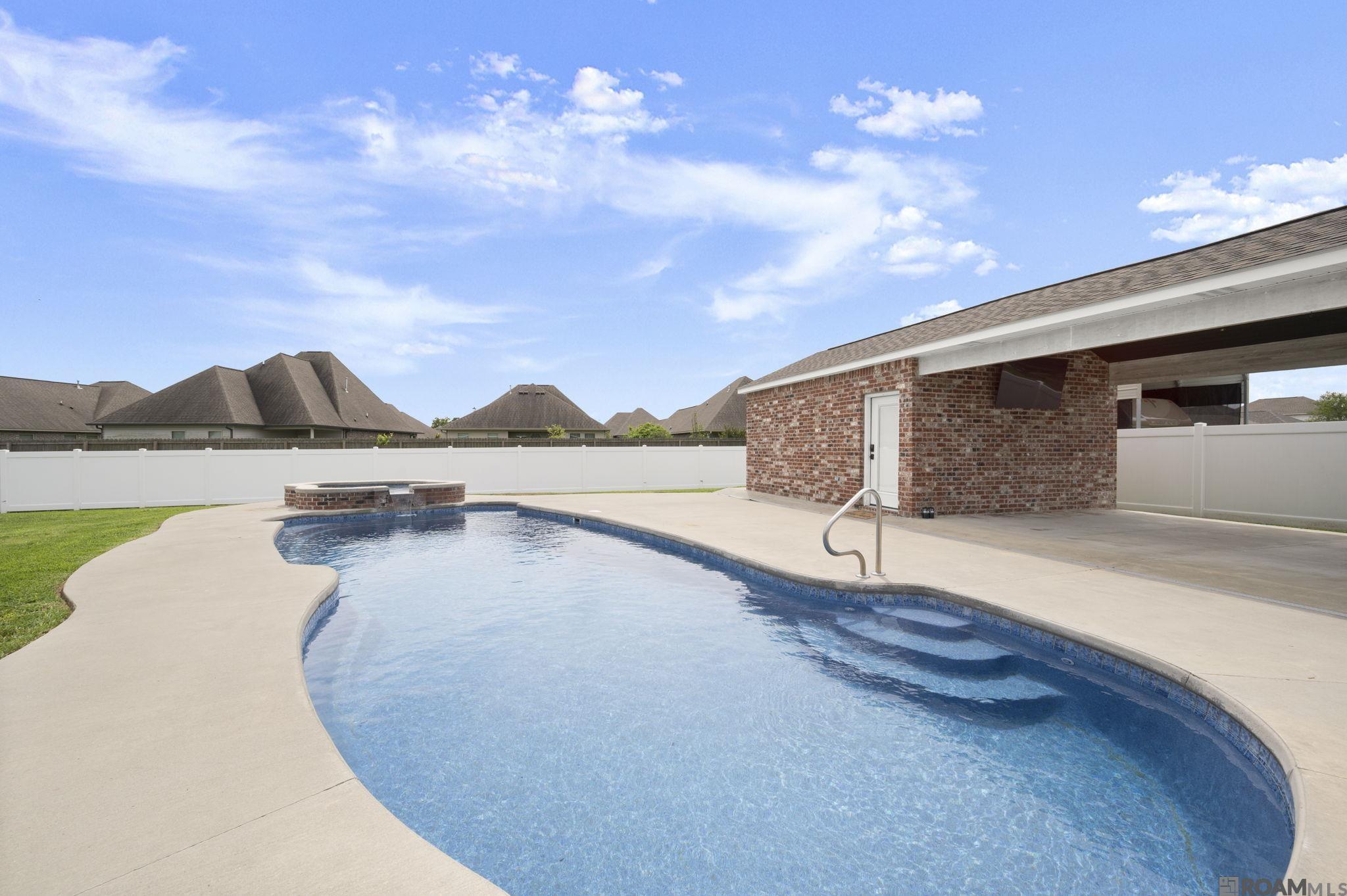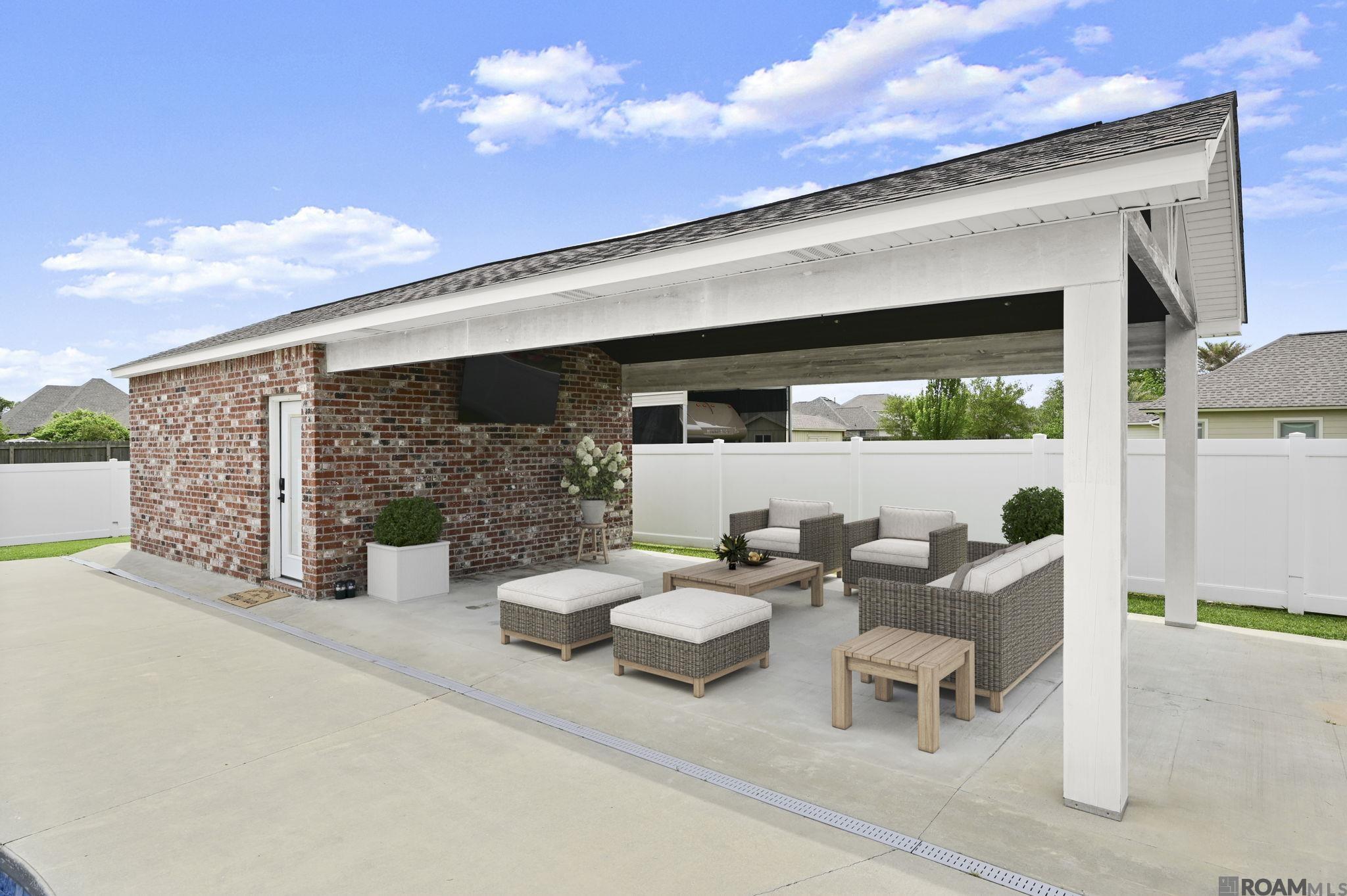 Beautifully renovated and thoughtfully designed, this property offers the perfect blend of comfort, functionality, and entertainment. The 3-bedroom, 2-bath main home features new wood flooring, fresh paint, and detailed trim work throughout, along with a brand-new kitchen showcasing custom cabinetry. The dining area is highlighted by a large bay window with automatic shades overlooking the pool and backyard, while a gas fireplace adds warmth and charm to the living space. Connected by an expansive 1,000 sq. ft. carport, you'll find a spacious 1-bedroom, 1-bath apartment complete with living/dining area, kitchenette—ideal for guests or extended family. The outdoor amenities are exceptional, featuring a heated and cooled fiberglass pool with a spa/spillover, along with a 20x16 pool house and a 23x15 covered pavilion perfect for entertaining. Additional features include a 40x30 two-bay workshop with an attached carport and large automatic gate, a whole-home 26kW generator servicing the entire property, and a generous ¾-acre lot enclosed by a 6-ft hurricane-rated vinyl privacy fence. With a newer roof and HVAC, no HOA, and located in Flood Zone X (per LSU Flood Map), this home also falls within Prairieville Primary, Middle, and the new Prairieville High School district (per apsb.org). Don't wait! Schedule your private tour of this one of a kind property today!