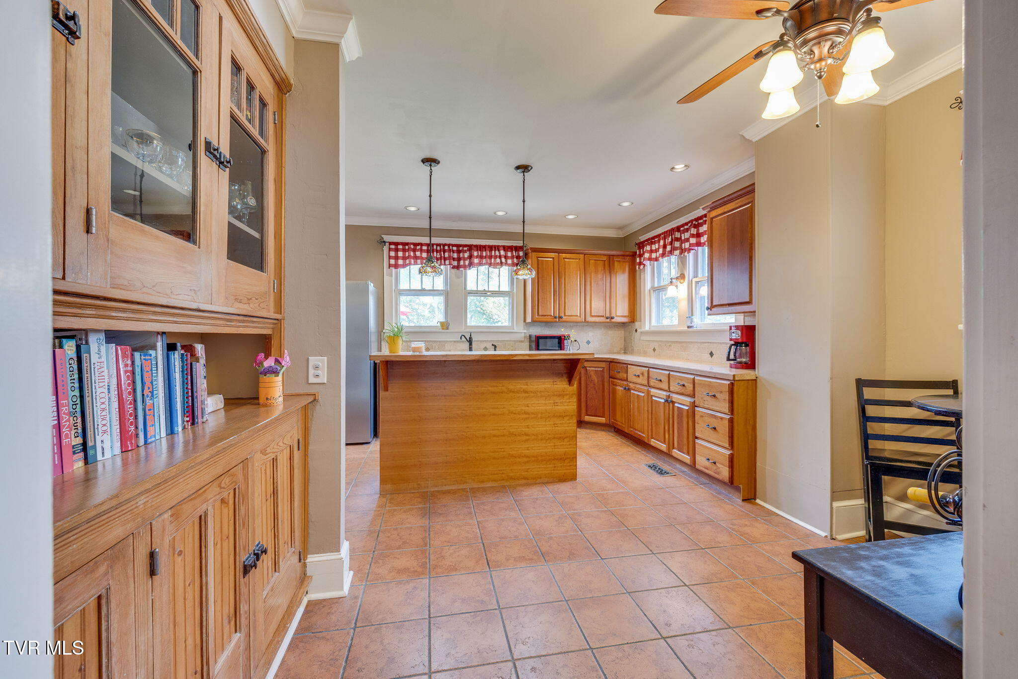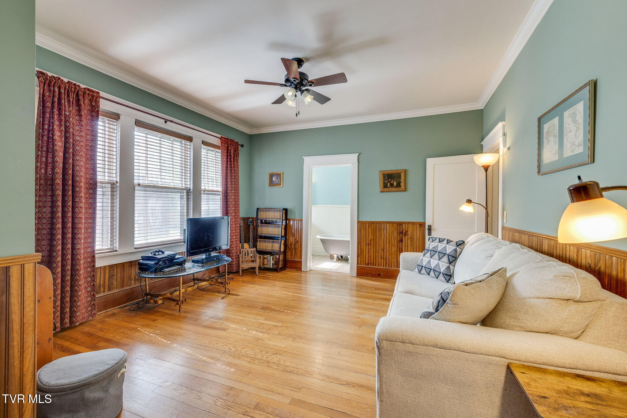 CHARMING TREE STREETS BUNGALOW A BLOCK FROM ETSU AND SHORT WALK TO WEST WALNUT STREET AND DOWNTOWN! This well-maintained 4 BR / 2 BA home has plenty of historic charm with tall baseboards, wide window and door trim, wainscoting, a claw foot tub, a built-in butlers pantry / china cabinet, hardwood floors throughout, and tall ceilings on the first floor.