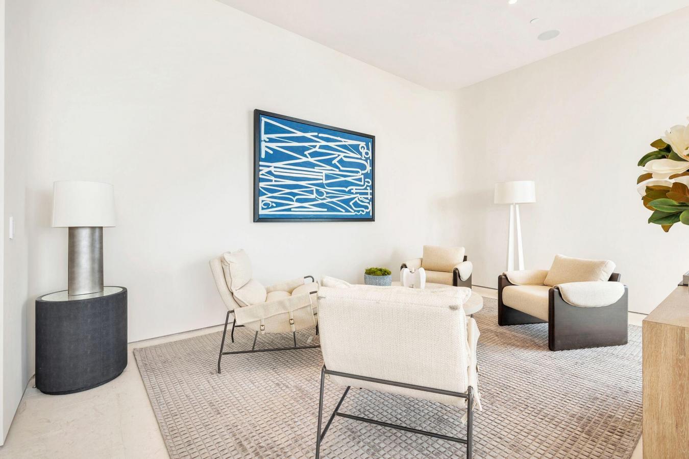 This unique and deliberate customization continues throughout all the rooms of the residence with marble and limestone accents in the great room overlooking the bay. At the heart of the room, find a stunning marble fireplace and note the millwork crafted from individual blocks, perfectly aligned by artisan woodworkers. A media room adjacent to the living room serves as a cozy space to unwind with wood paneled walls and a custom movie theatre size screen with theatre-style lights.