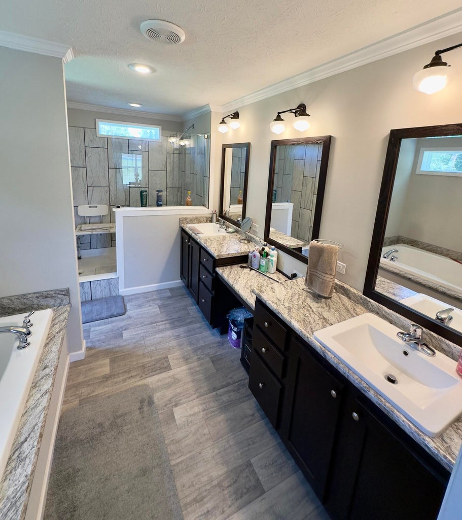 Elegant Zero-Entry Villa with High-End Custom Finishes Experience effortless living in this stunning, detached standalone villa. This zero-entry home combines architectural beauty with practical accessibility, featuring a striking brick and stone exterior and professional landscaping with custom retaining walls. Inside, the main level impresses with 9-foot ceilings, durable LVP/LVT flooring, and cased windows outfitted with custom blinds. The heart of the home is a vaulted living room anchored by a gas fireplace and an elegant iron-spindled staircase. Culinary enthusiasts will love the custom kitchen, featuring quartz countertops, subway tile, and high-end built-in appliances. Relax in the light-filled sunroom or step through the four-panel sliding doors to a truly unique EZ Breeze Lanai. This versatile space features a puncture-resistant vinyl panel system and a power privacy screen, leading out to a 10x16 Trex deck with a SunSetter retractable awning. The primary suite is a private retreat with 36-inch doors, a tray ceiling, a bay window and a spa-like ensuite designed for longevity with a walk-in shower, reinforced walls for grab bars. Mechanicals & Tech: CAT 5 wiring with battery backup, Kinetico water softening/Reverse Osmosis system, radon mitigation, and a generator with a 10-year transferable warranty. Expanded Garage: Oversized 24x25 space with 8’ doors, service door, epoxy flooring, and an integrated storage system. Listing broker has attempted to offer accurate data & info is deemed reliable but not guaranteed. Square footage may not be accurate. Buyers & agents are responsible for verifying accuracy. Camera/Video on premises.