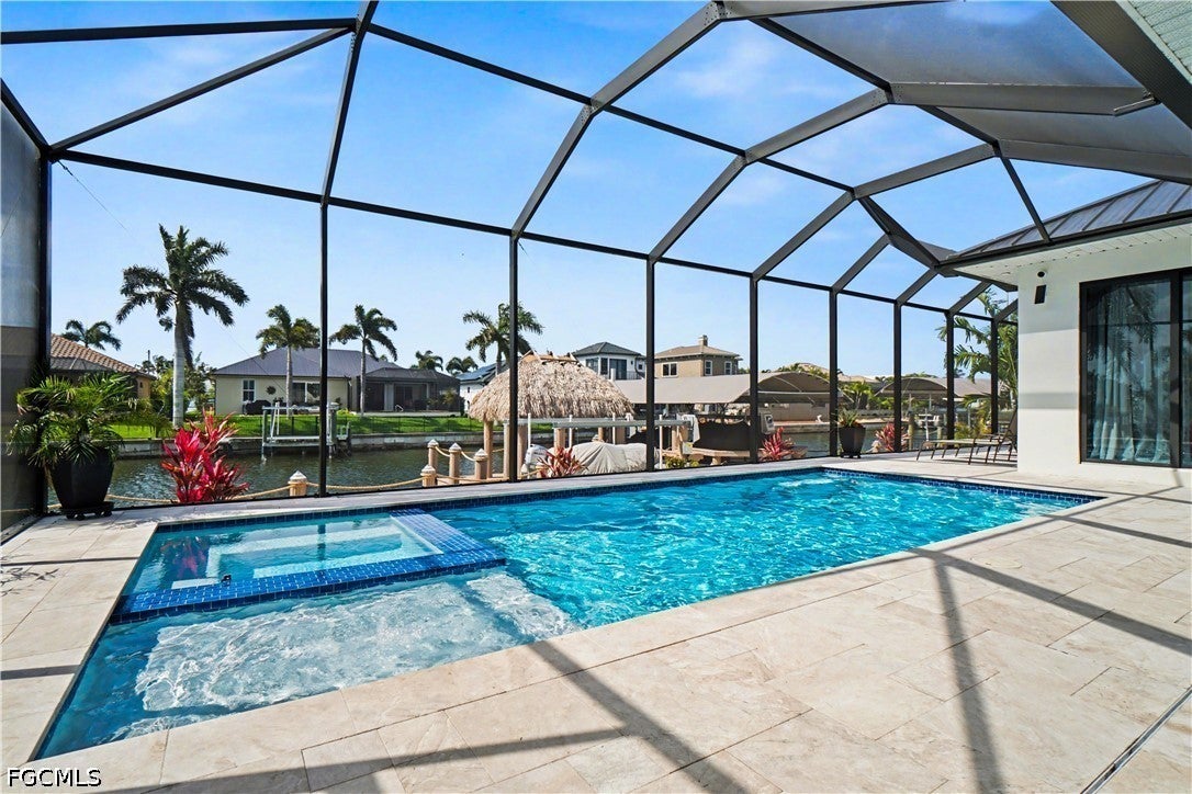 Luxurious Southern facing Gulf Access property overlooking extra wide canal south of Cape Coral Parkway. This stunning, fully furnished, West Indies Styled home was custom designed to emphasize elegant contemporary indoor and outdoor living. The exclusive property features 3 bedrooms and 4 bathrooms, DEN, a Gourmet Kitchen with Quartz counter tops and built-in stainless steel appliances, a gracious great room that opens to the huge pool deck area with a custom pool with Jacuzzi, and a large lanai for entertaining and to enjoy the stunning water views. The outdoor kitchen, Kevlar storm shutters to protect your patio furniture and to add extra privacy, a spa-like master bathroom, feature wall with electric fire place and 12 ft ceilings in the great room are only a few of the spectacular upgrades. The property offers a boat dock with a 10K LB Lift and sitting area. Check out virtual tour!