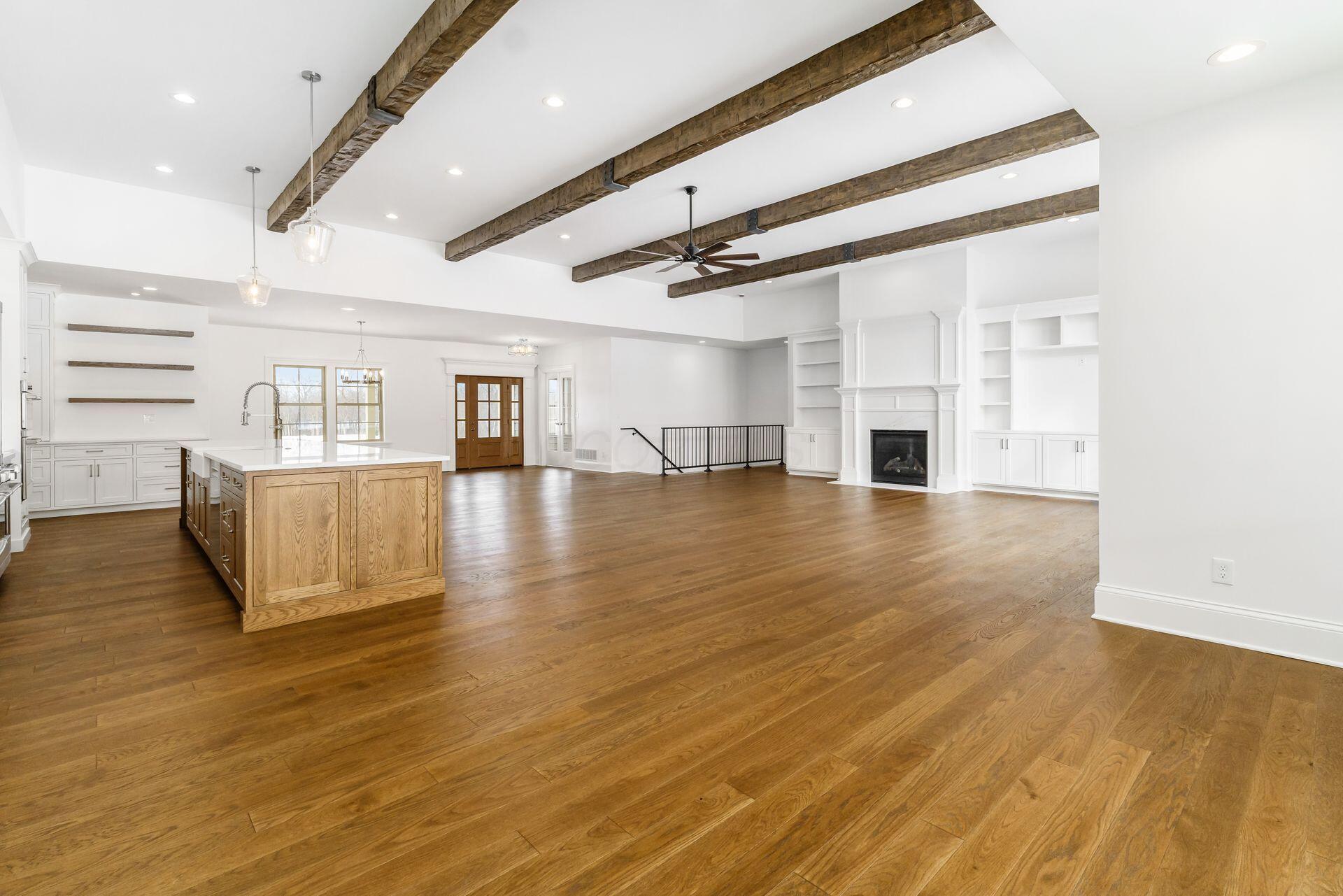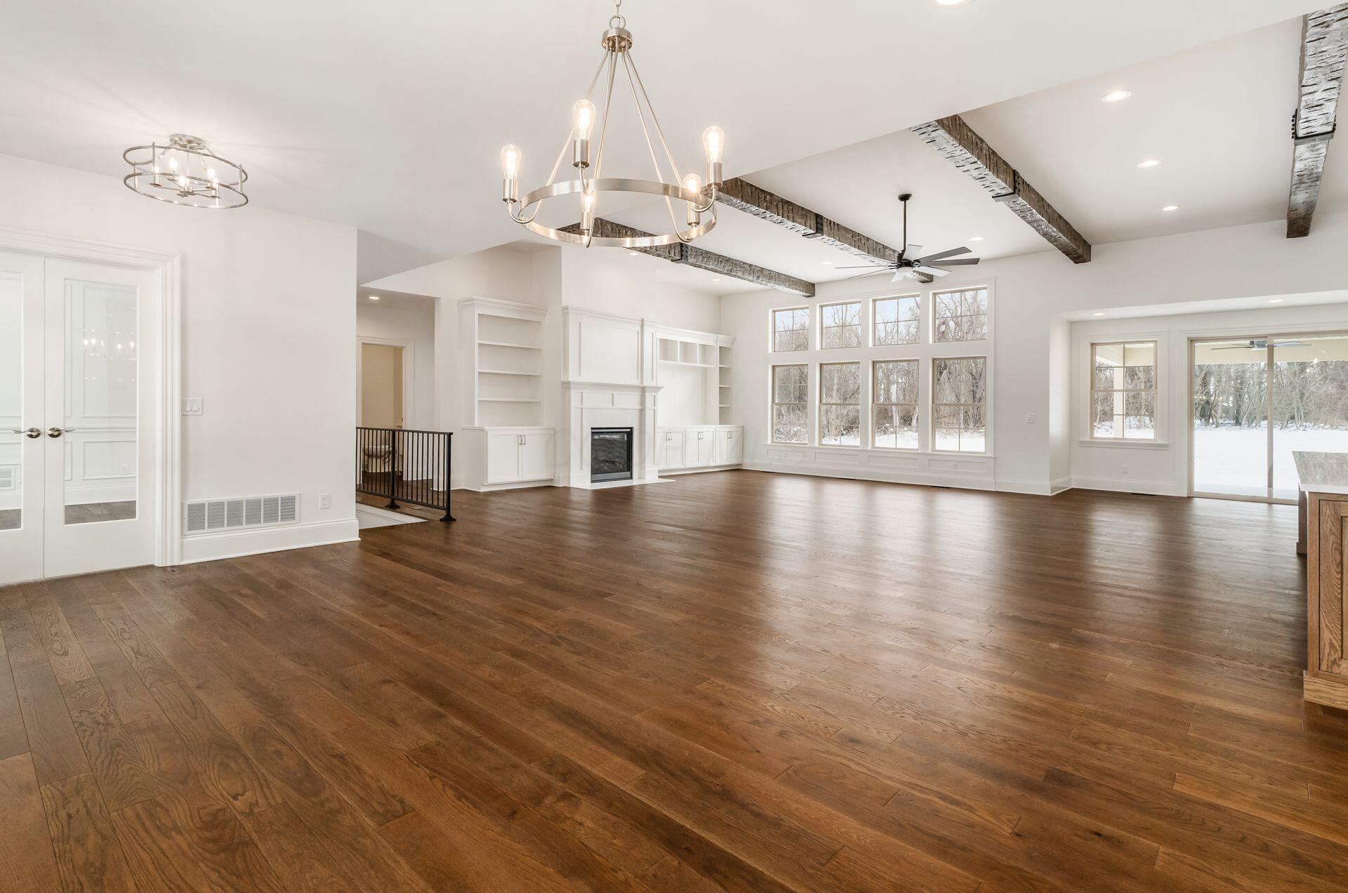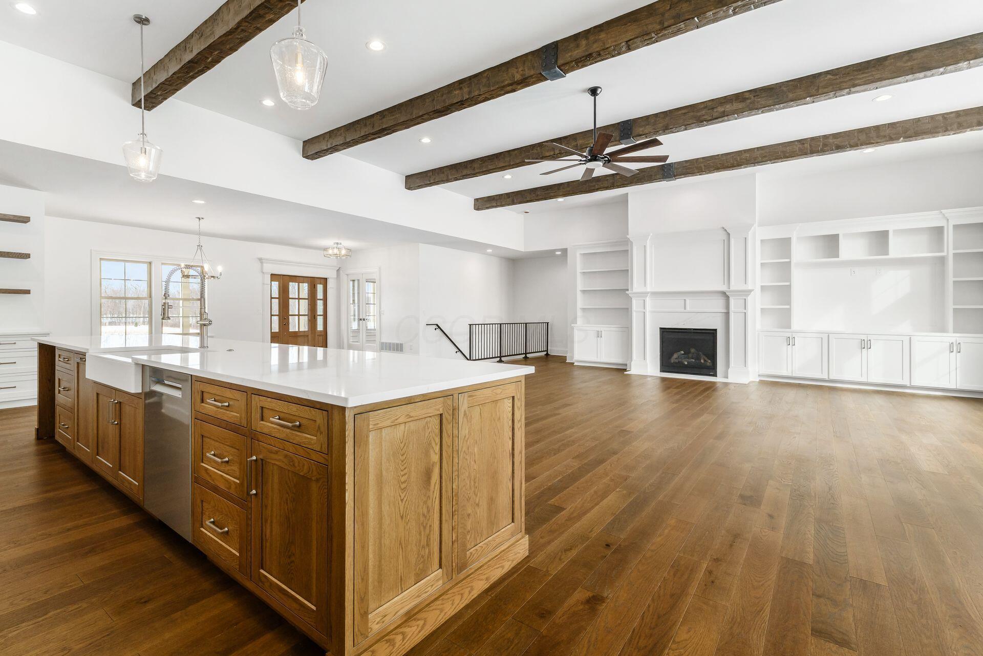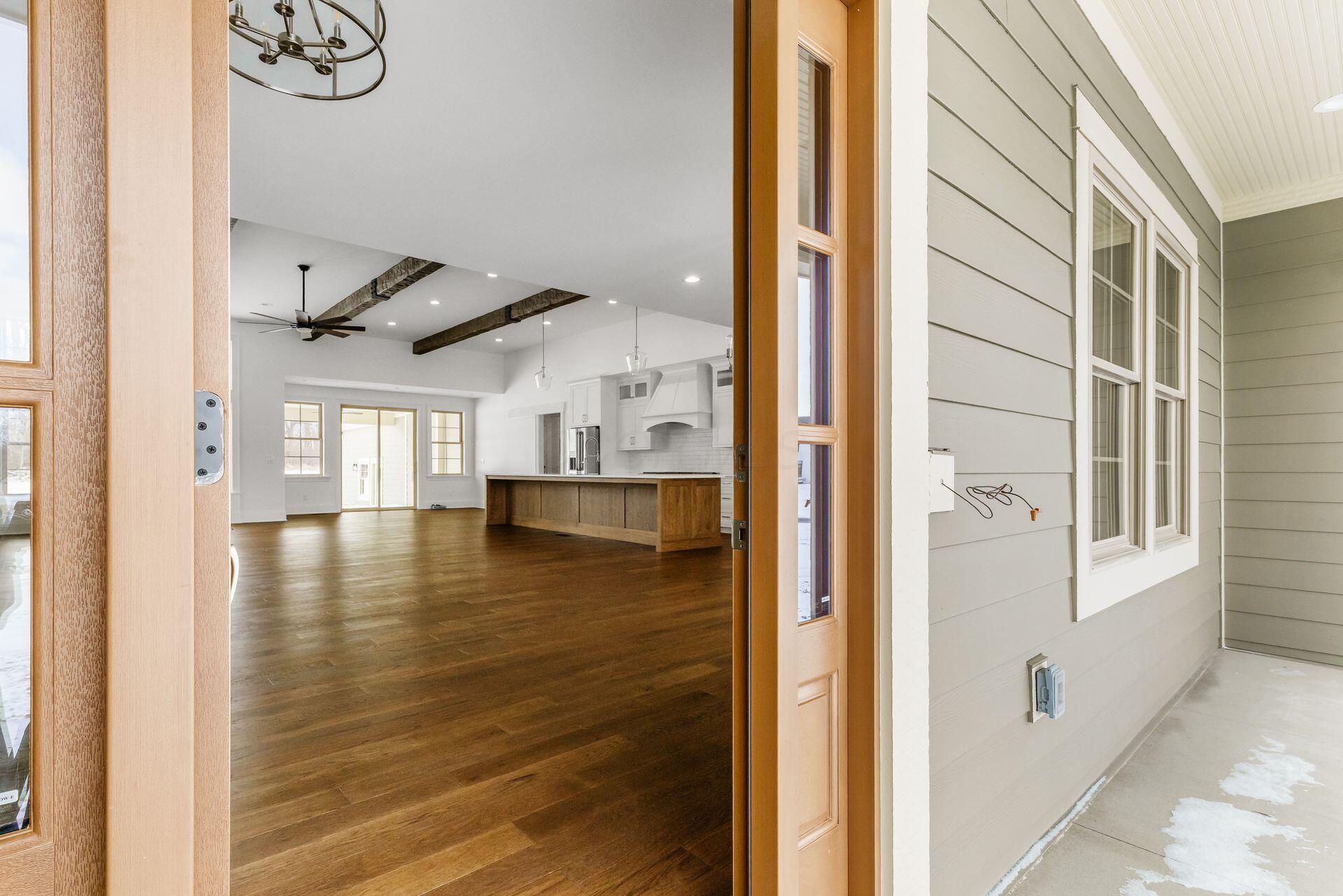Sprawling custom ranch situated on 3 acres, tucked away on a quiet cul-de-sac with unmatched quality throughout. Offering nearly 5,800 square feet of luxurious living space with four bedrooms and five-and-a-half baths. An expansive garage accommodates up to seven vehicles and includes a finished living area with a full bath and direct backyard access--ideal for a future pool house or man cave--along with a heated section perfect for a golf simulator. Garage includes stairwell directly to the basement. The spacious kitchen features custom Amish cabinetry and a large island connecting to the messy kitchen, morning room, and great room. The great room includes a 12-foot beamed ceiling, wall of windows, fireplace, and built-in shelving. Additional highlights on the 1st floor include a formal dining room, den with custom built-ins, laundry and mudroom. Custom woodwork throughout, including all closets. The finished lower level offers a bedroom with full bath, two expansive living spaces with custom built-ins and a kitchen, a den, and a potential exercise room enclosed by glass wall and doors. 2 egress windows in the basement. Enjoy outdoor living on the covered back porch with an electric fireplace. A truly one-of-a-kind property with exceptional workmanship throughout, where no detail has been overlooked.