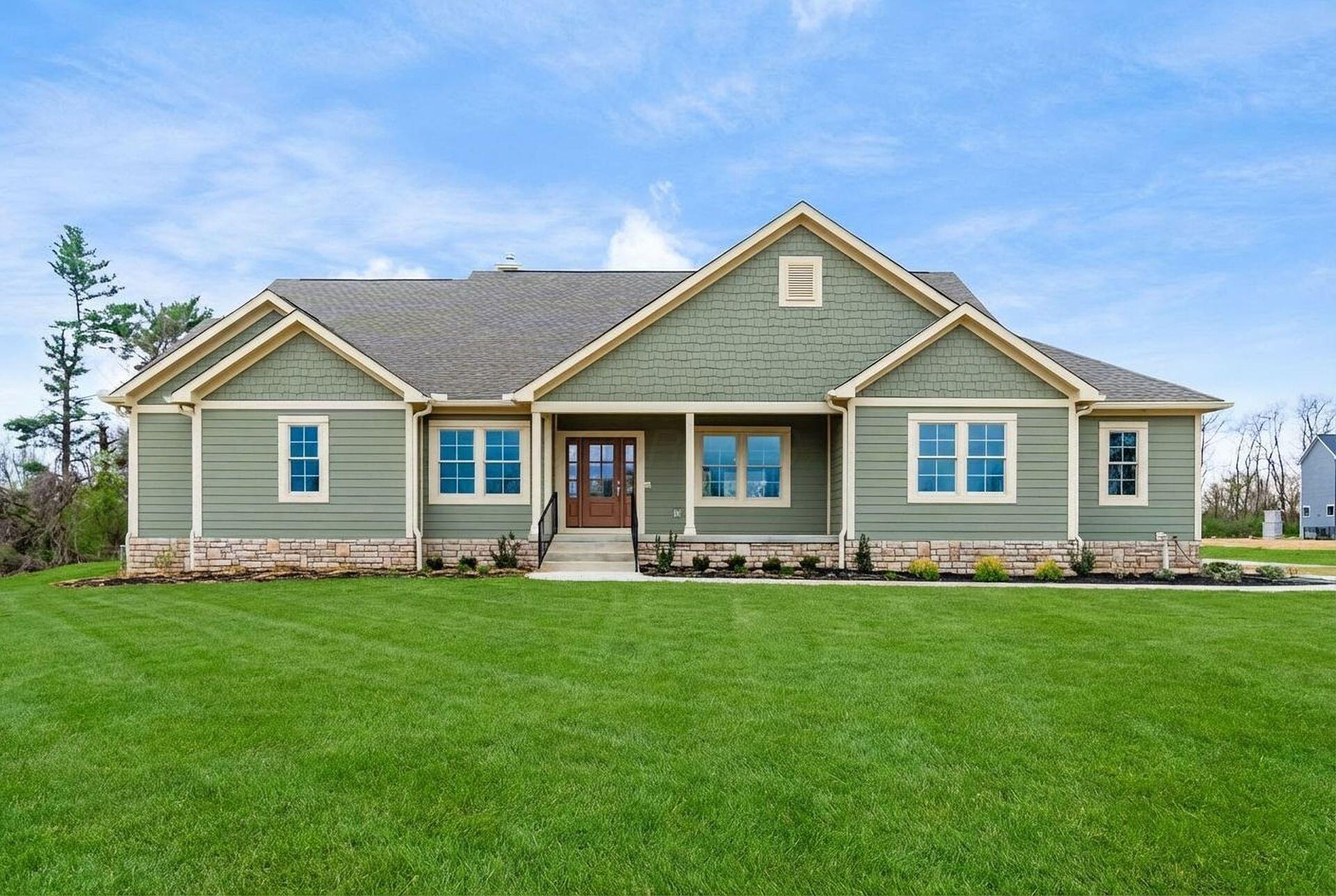 The Cove is a 2,275 sq. ft. custom single-level home by Meridian Custom Homes offering 3 bedrooms, 2 baths, and a 2-car garage. The exterior features solid clapboard siding with stone accents and a welcoming front portico with columns. The spacious, open floor plan features a great room with a cathedral ceiling, gas fireplace, and custom built-ins.