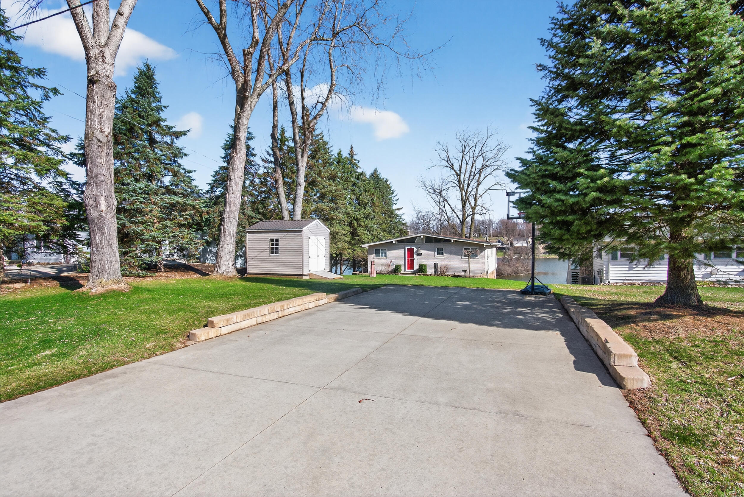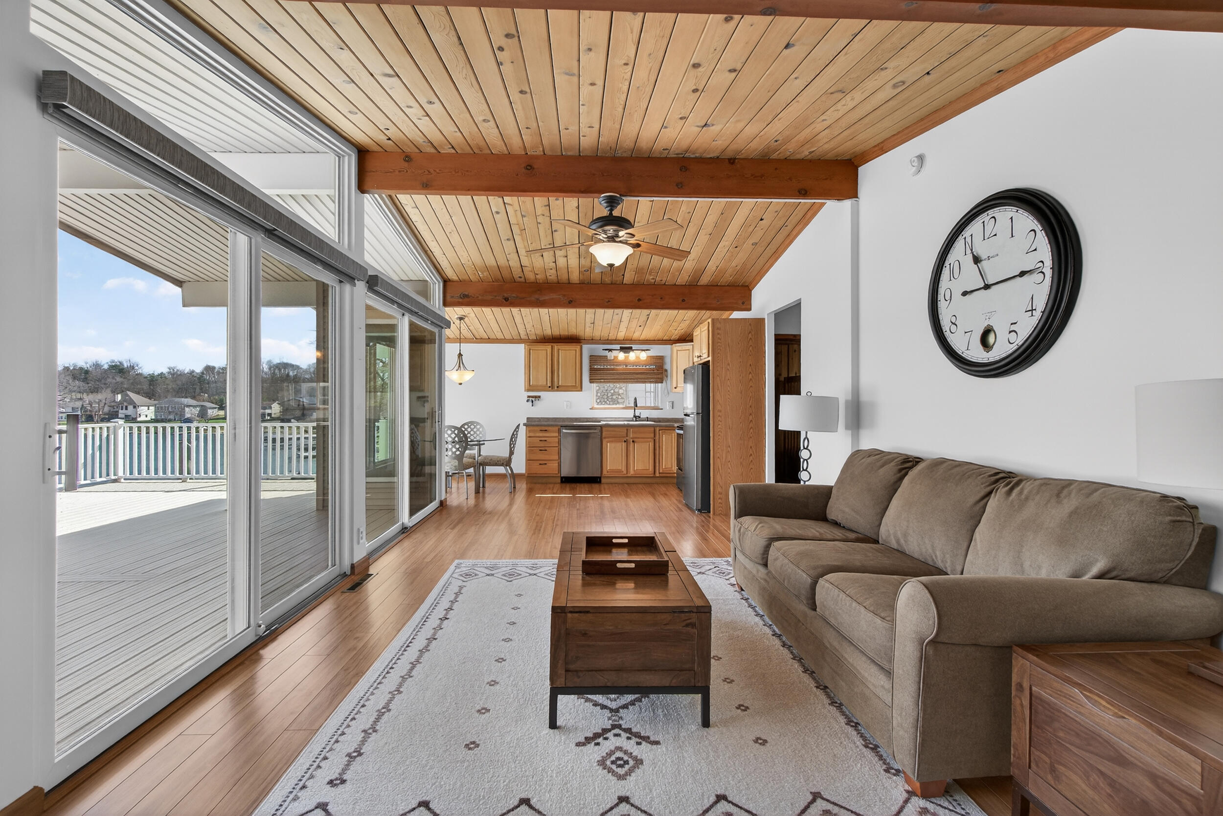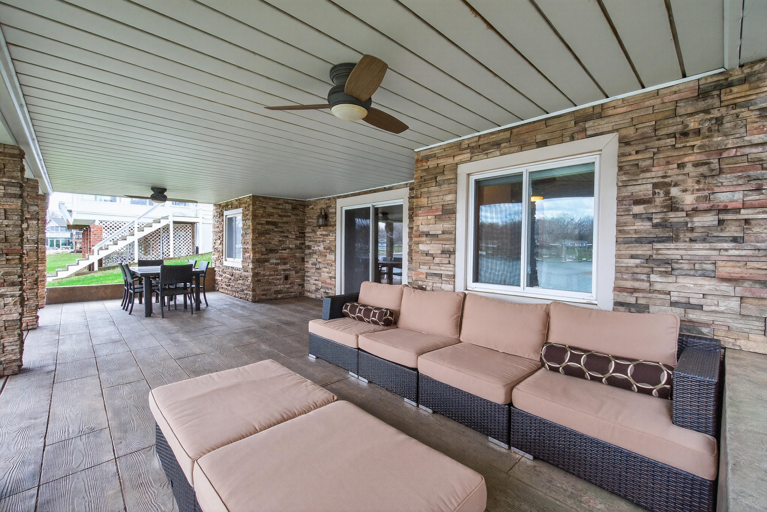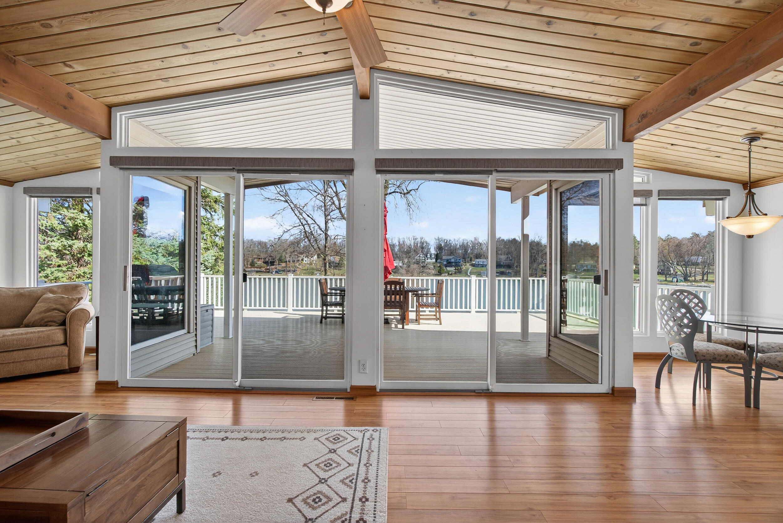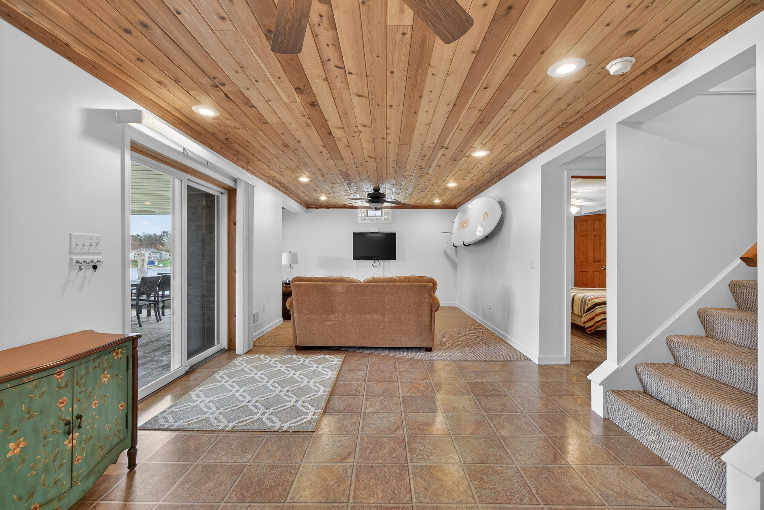 Experience the pinnacle of low-maintenance luxury, and the ultimate turn key at Lake LeAnn. This thoughtfully designed retreat was built specifically for those who want to spend less time on chores and more time on the water. From the sandy beach frontage to the multiple covered entertainment areas, every inch of this property invites you to relax.As you step into the main living area, the world opens up through wall-to-wall windows spanning both levels. The vaulted ceilings flood the home with incredible natural light, framing an unbeatable panoramic view of Waldron Bay. Whether you're sipping morning coffee or hosting a sunset dinner, the lake is always your backdrop, now complemented by newer blinds throughout for effortless light control and privacy.From the lakeside, this home truly makes a statement. The grand patios and expansive walls of glass, perfectly paired with the rugged rock siding, create a striking architectural presence that makes this home stand out from the rest. Lake LeAnn is a premier private, all-sports lake, offering the perfect balance of adrenaline and serenity. You can enjoy high-speed boating or retreat to the secluded no-wake bays to kayak and fish in total peace, even during busy holiday weekends where other lakes are packed. Stocked nearly every year with fish, this is a known destination for advanced anglers. For families, the multiple pull-up beach parks allow kids to hop off the pontoon and play on the shore before boating over to the next park.The outdoor living spaces are truly exceptional. The massive weather-proof upper deck comes equipped with a built-in overhang for essential summer shade and features a natural gas line already run for your grill--no more swapping tanks during a BBQ. Below, the lower level features an amazing lanai space with ceiling fans and newer stamped concrete. Walking down toward the water, you will find a new lakeside patio with a fire pit and a beach swimming area for the kids. The sale also includes a newly installed shed for all your lake gear and a nice-sized cleared extra lot, providing ample parking for summer guests and a dedicated place for boat storage in the winter.Inside, the lower level serves as a complete secondary living suite perfect for entertaining. It features a full living area and a wet bar to keep the refreshments flowing without ever having to head back upstairs.This home is being sold as a complete turn-key opportunity, including the U-shaped dock, the paddle board, all indoor and outdoor furniture, an underground dog fence, and a professional sprinkler system. Significant recent updates provide total peace of mind, including an updated electrical panel, a new roof in 2021, and a natural rock seawall and dock installed in 2019.