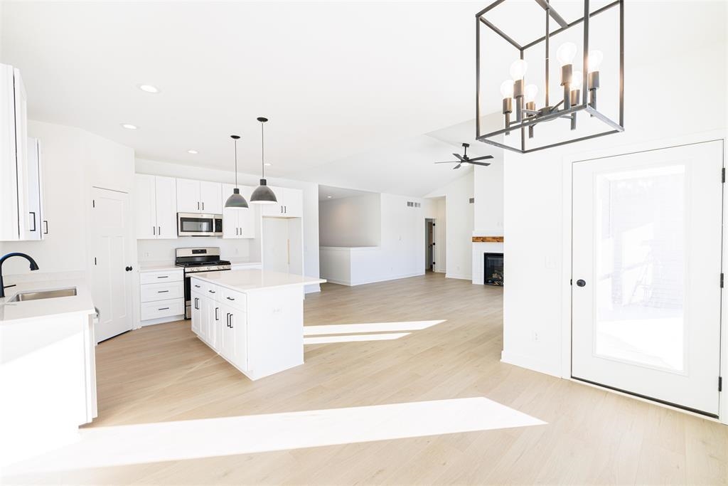 Estimated Completion August 2026. Leveled up split-bedroom ranch with 3-car attached garage. Exterior offers sleek black windows & garage doors accented with natural stone trim and gabled peaks. The open main level features a vaulted great room with a gas fireplace, white doors and trim flow into the eat-in kitchen.