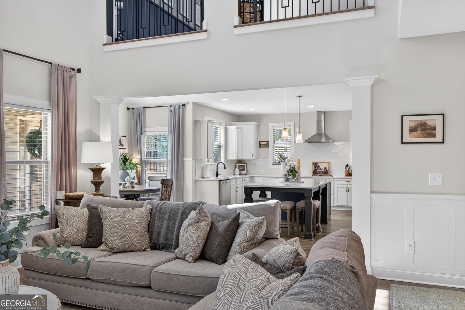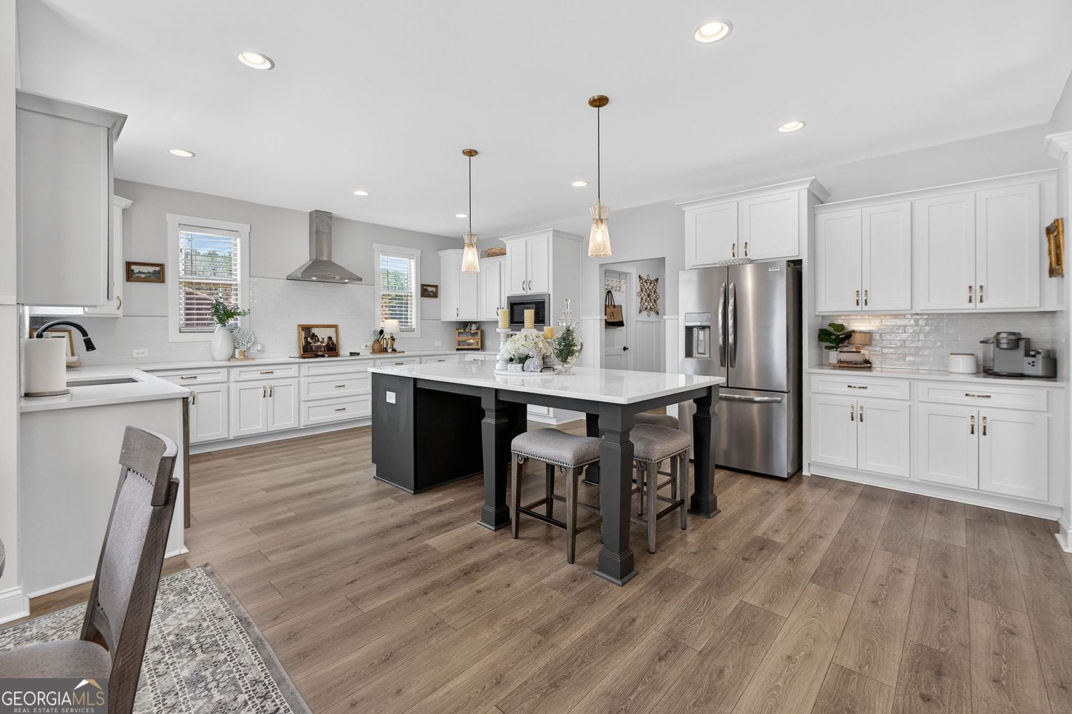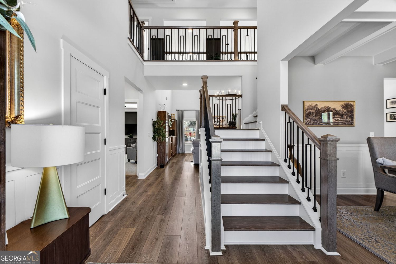 Welcome Home! This beautiful home welcomes you with a charming rocking chair front porchthe perfect place to relax and unwind. Inside, the foyer leads to a spacious home office or formal living room, an oversized dining room, and an open-concept living area featuring a great room with fireplace and custom built-in entertainment center.