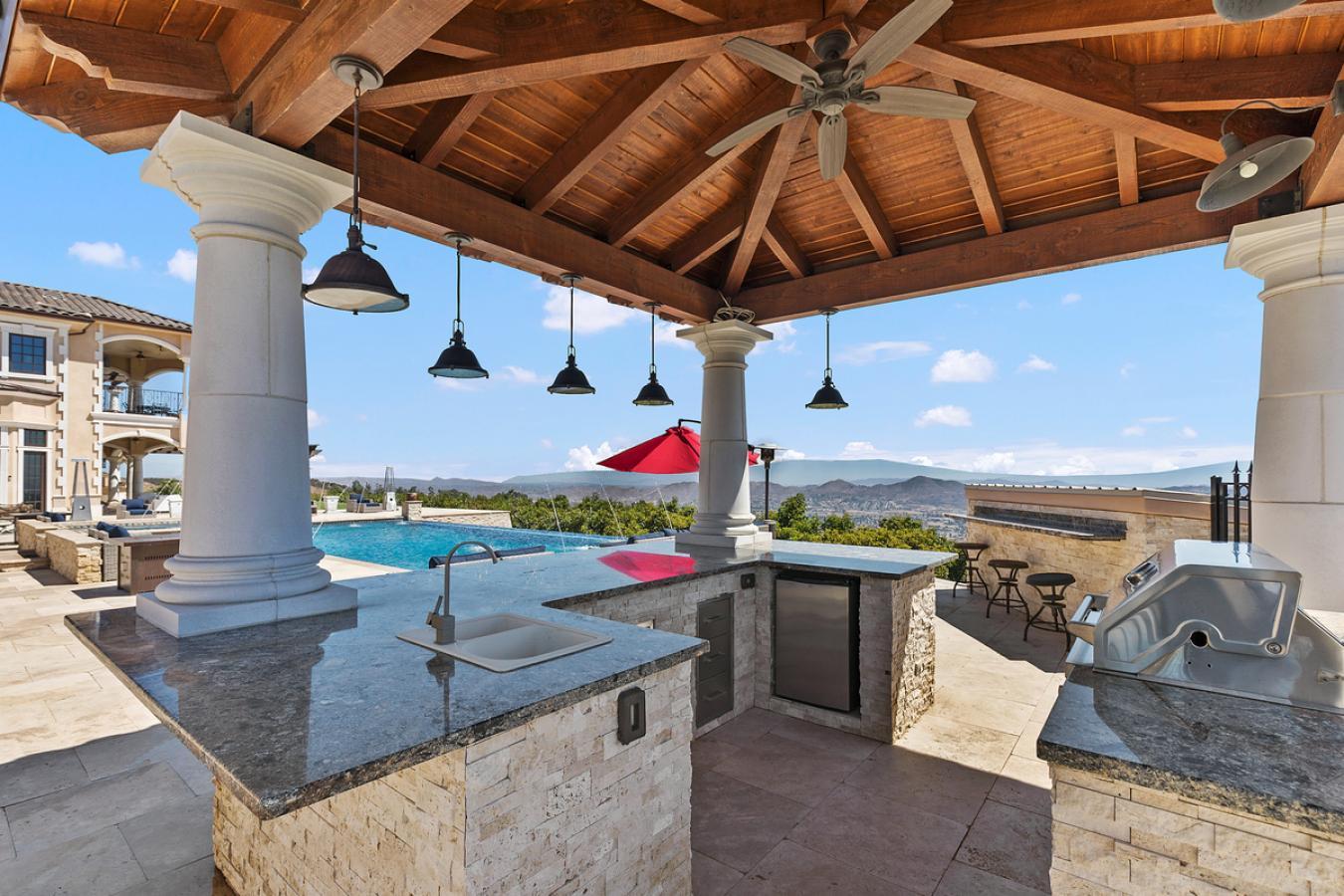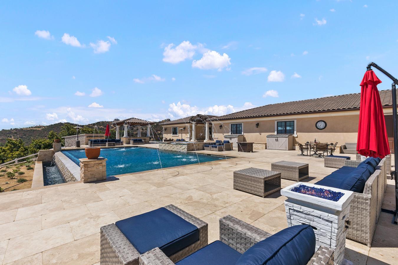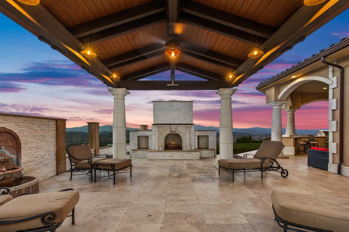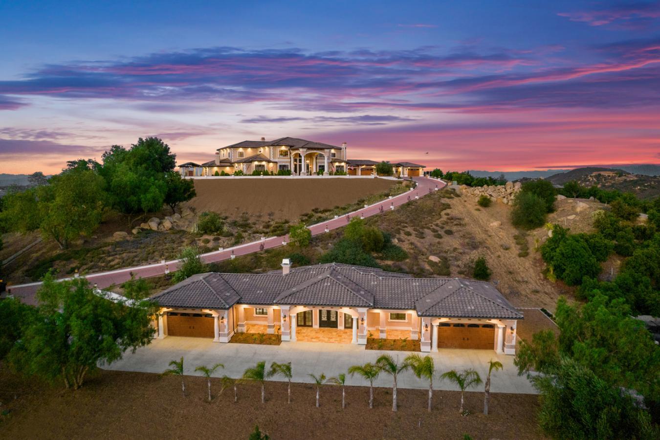 Welcome to Villa Dolce Vista. Commandingly positioned atop 20.39 ACRES at the north point of the EQUESTRIAN COMMUNITY of La Cresta, this Italian inspired masterpiece offers luxury amenities appreciated by the most discerning buyers. Impressive private GATED COMPOUND offers uninterrupted panoramic VIEWS of mountains, city lights, and the Temecula Valley. Encompassing nearly 14,000 SF, the resplendent home includes 5 EN-SUITE BEDROOMS, 8 BATHROOMS, a grand foyer with DUAL STAIRCASES and 24 ceiling, elegant wood paneled STUDY, FORMAL DINING ROOM with fireplace and expansive city light view. Incredible CHEFS KITCHEN includes a 20 granite topped island, COPPER CEILING and LEDGER STONE WALLS. Extraordinary PRIMARY SUITE offers a FIREPLACE, BALCONY with staggering city light views, OPPULANT BATH with dual water closets, vanity areas, marble spa showers, and Jacuzzi tub. Massive GAME ROOM with full wet bar and access to the outdoor travertine deck with FOUNTAINS, INFINITY EDGE JEWEL SCAPE POOL AND SPA and two full outdoor BBQ kitchens. EIGHT CAR GARAGE with built in cabinetry. This SMART HOME is equipped with 155,000 in electronics that provides you with touch screen devices throughout the home. For extended family, a 1,777 SF SINGLE STORY 2 BEDROOM, 2 BATH BUNGALOW with two- 2 car attached garages. Energy efficient with a 47 KW 136 PANEL SOLAR SYSTEM powering both the main home and casita. 53x40 RV GARAGE totaling 2,120 SF for storage of two 45 motorhomes plus all the toys. INCOME PRODUCING HAAS AVOCADO GROVE with automatic fertilization system and WELL watered with two 5000 gallon holding tanks. Additional building pad for future barn, tennis court or helipad. The La Cresta community is located mid-way between Orange County and San Diego County with convenient access to Ontario, San Diego, and John Wayne International Airport. This stunning estate is just minutes from the members only Bear Creek Golf Club offering a Jack Nicklaus designed golf course, tennis, and fine dining as well as the growing Temecula wine country.