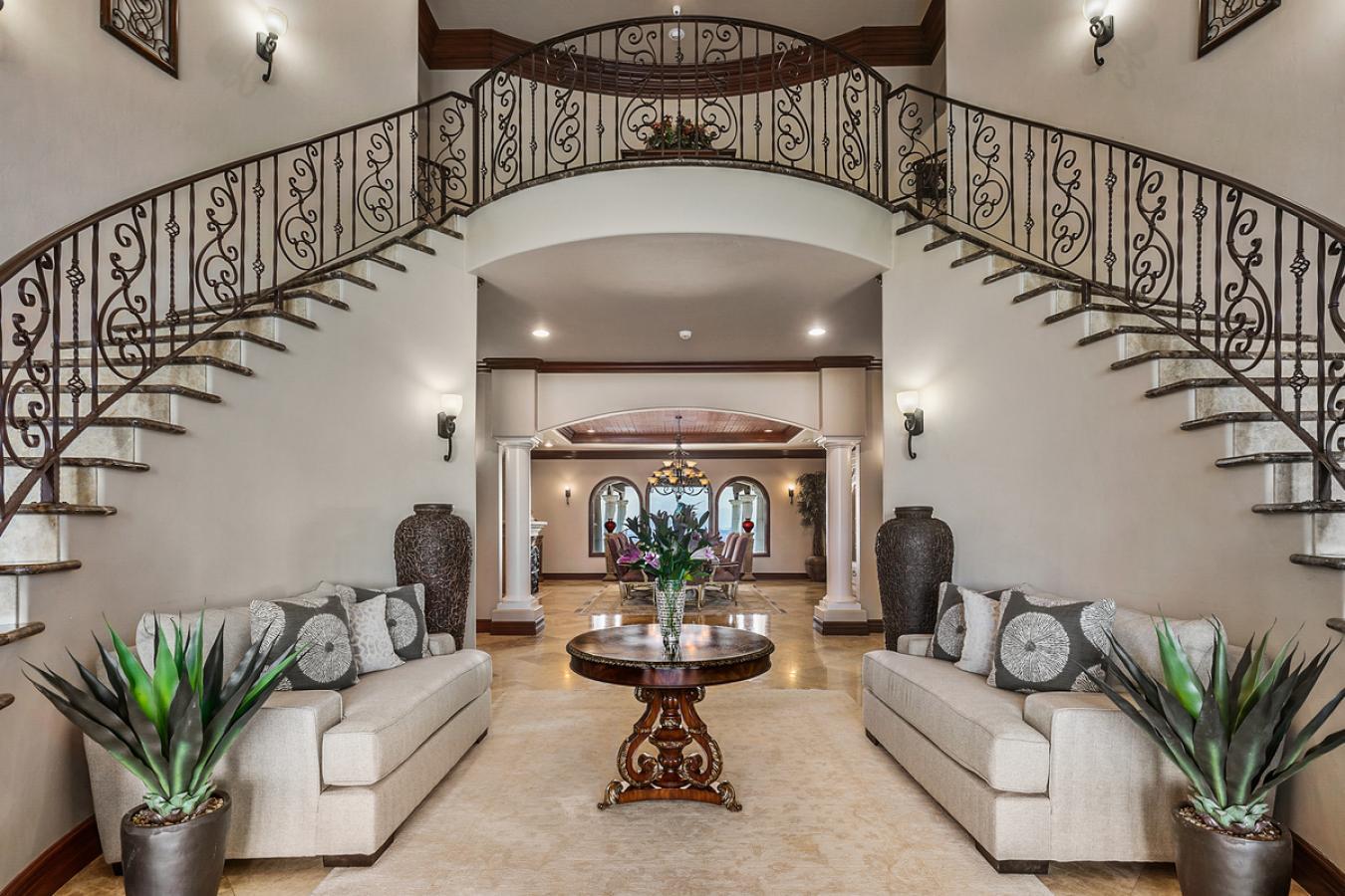 This exquisite Mediterranean-contemporary residence in one of Malibus most prestigious, celebrity-favored gated communities commands sweeping panoramic ocean, dramatic coastline, and crashing whitewater views from nearly every room. A grand two-story foyer with palatial spiral staircase opens to a formal dining room, fireplace-warmed living room with sit-down bar, cozy family room, and a spacious island kitchen with junior dining area all flowing seamlessly to expansive patios and decks that embrace the breathtaking vistas. Highlights include an ocean-view living room with grand piano nook, a large ocean-view office opening to a private deck over the water, a versatile first-floor bedroom/gym with bath and patio access, and an upstairs primary suite retreat featuring a sitting area, expansive shaded terrace, dual spa-like bathrooms, and generous his-and-hers closets, plus three additional en-suite bedrooms each with jaw-dropping views. Outdoors, a covered entertainment patio with built-in BBQ adjoins a sparkling pool overlooking the endless blue, complemented by a three-car garage, motor court all just minutes from the Country Mart, Nobu, and the exclusive Little Beach House for the ultimate in private, luxurious coastal living.