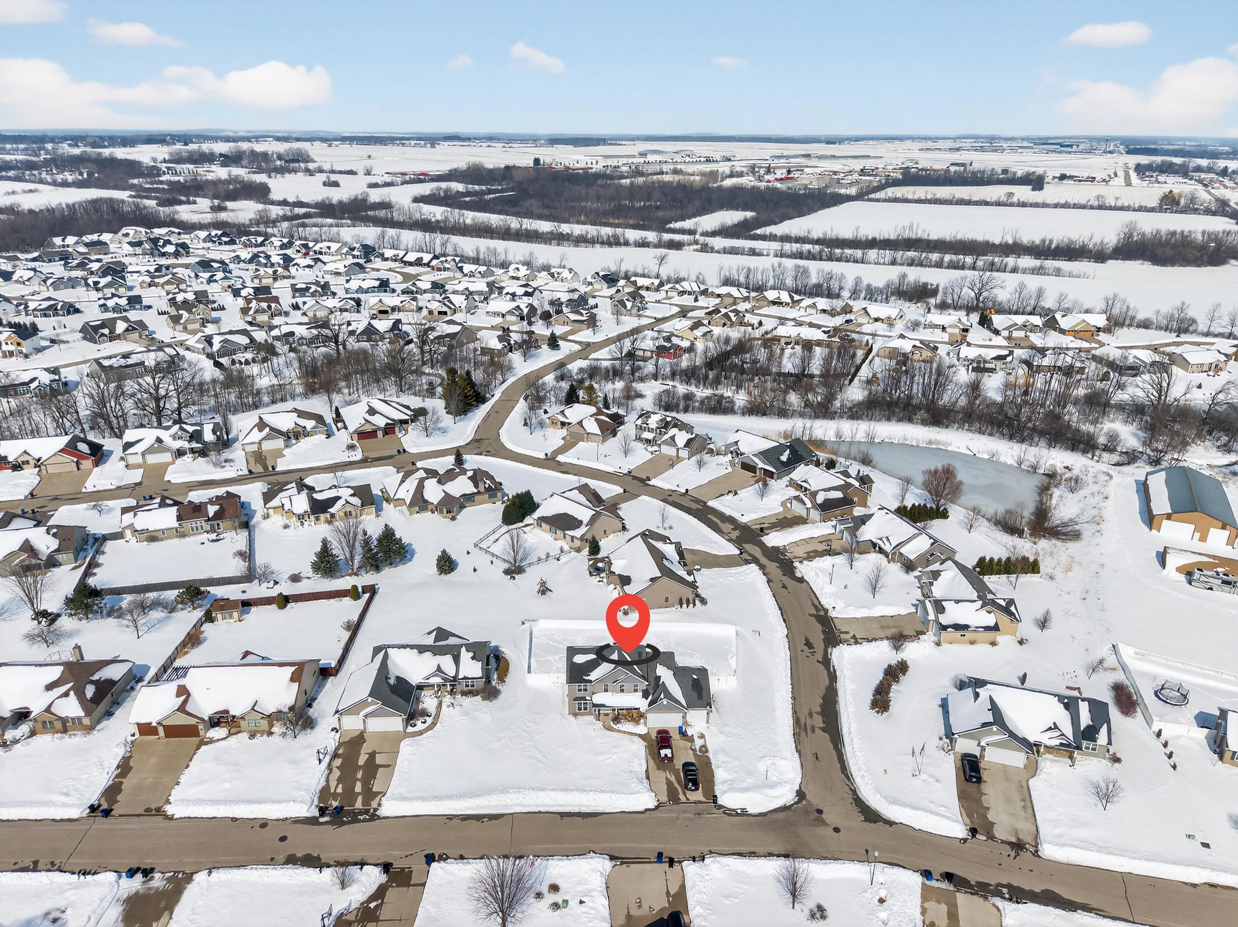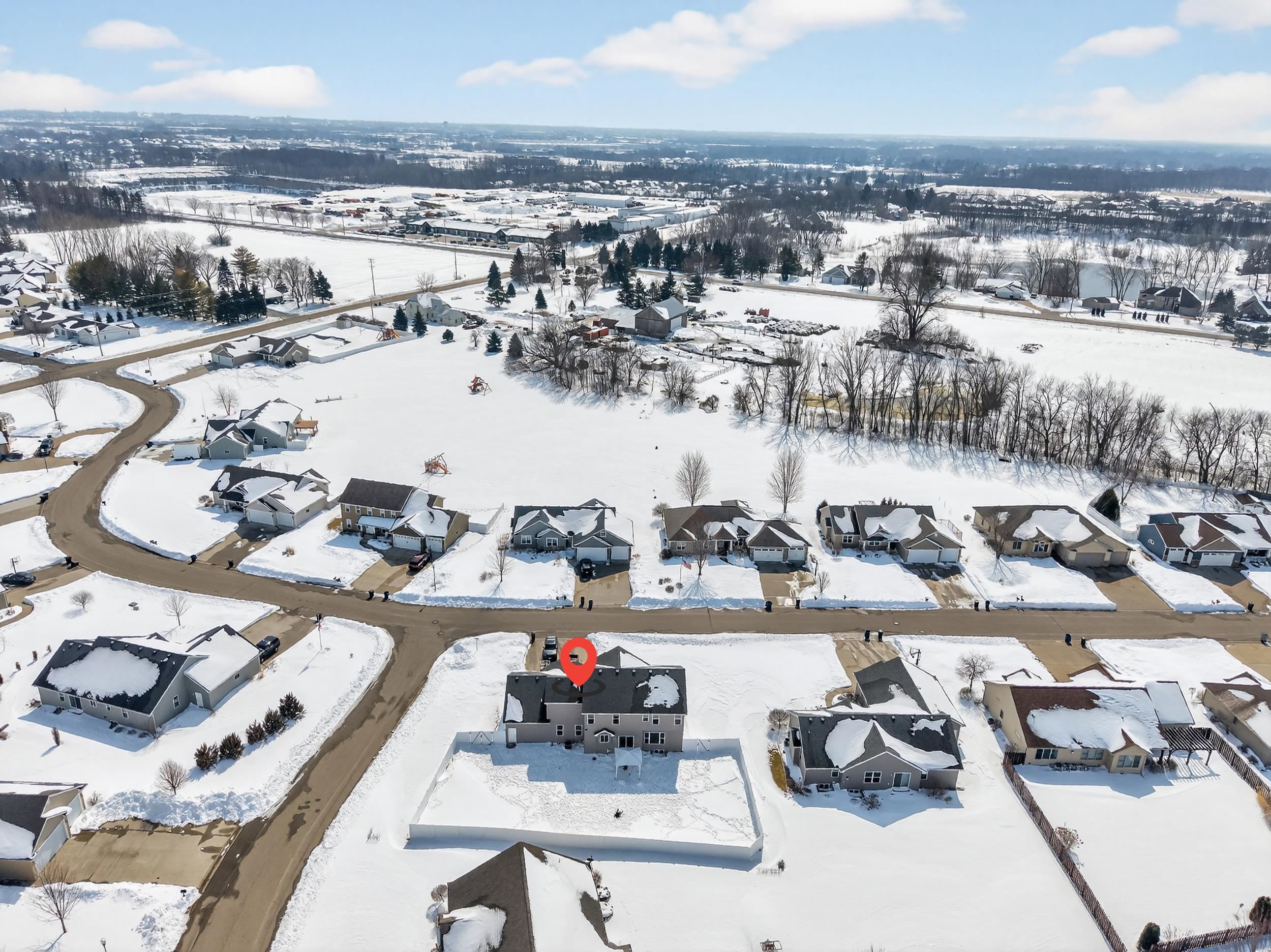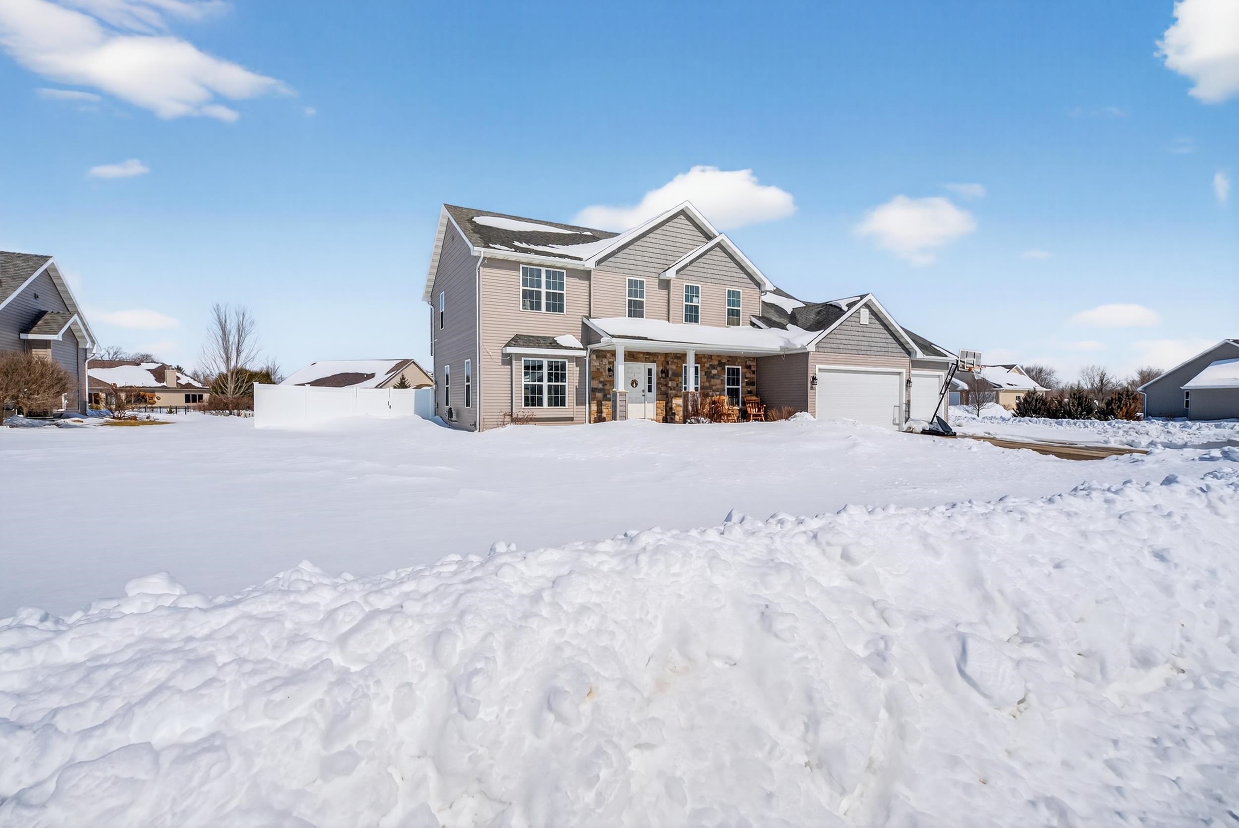 Modern Elegance in Fox Crossing! This stunning 4BR, 2 full BA, 2 half BA colonial built in 2017 is perfectly situated near the new Neenah schools. The open-concept main floor shines with vaulted ceilings, a cozy gas fireplace, and a chef's kitchen featuring granite countertops, a large island, and a hidden walk-in pantry. Upstairs, the primary suite offers a spa-like retreat with a jetted tub. Practicality meets luxury with 1st-floor laundry, a partially finished LL, and a massive 3-car garage with a bonus room above ready to finish. Step outside to a beautifully landscaped .35-acre corner lot, complete with a patio and included pergola. Move-in ready and meticulously maintained—this gem won't last!