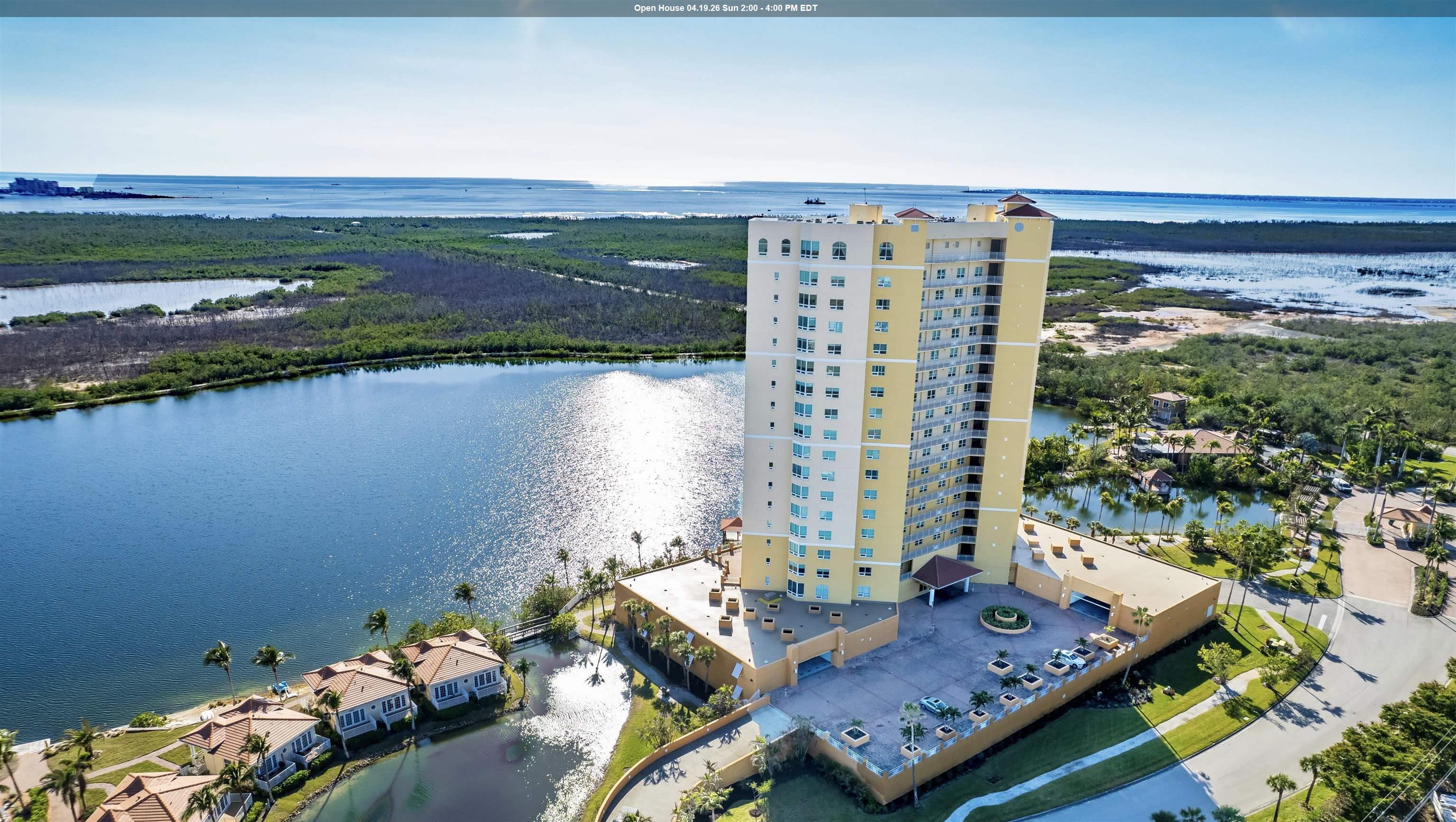 Be mesmerized by the sun glistening on a 25-acre lake, 700 acre preserve filled w/birds, Bay & Gulf in the distance. Secured elevator opens to a private foyer. Double doors lead to a spacious Great RM w/floor to ceiling sliders (with hurricane impact glass even stronger on lower floors) frame the tranquil views.