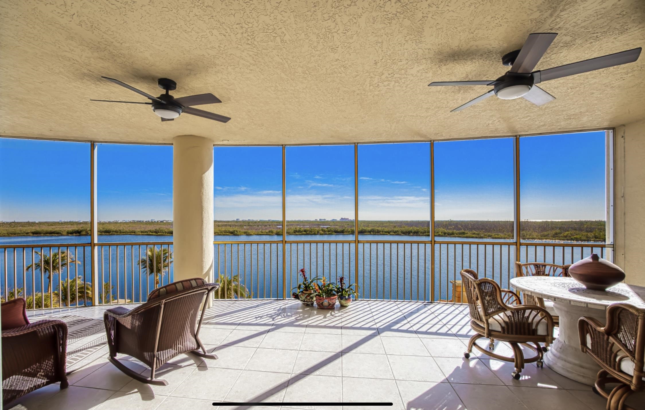 Be mesmerized by the sun glistening on a 25-acre lake, 700 acre preserve filled w/birds, Bay & Gulf in the distance. Secured elevator opens to a private foyer. Double doors lead to a spacious Great RM w/floor to ceiling sliders (with hurricane impact glass that is even stronger for lower floors) frame the tranquil views. A 450 screened lanai offers outdoor living while hearing & watching fish jump & birds glide over the water. KIT w/wood cabinets, solid surface & BRKFST bar open to family rm (this space could easily & inexpensively be converted to 3rd BR). S&E exposures allow you to witness beautiful sunrises. Primary suite has lanai access, a LG window to enjoy views, oversized WIC & attached BA w/WIS, soaking tub, 2 vanities & WC. On the opposite end is a laundry w/sink, guest in-suite w/twin Murphy BDs & 3rd BA. 2 under bldg parking spaces & dehumidified storage convey. Lakeside cabana w/Murphy BD can be purchased separately. Offered furnished w/exceptions. Walk to a beach, eateries, grocery, bike to Sanibel & FMB. Resort style amenities at your disposal.