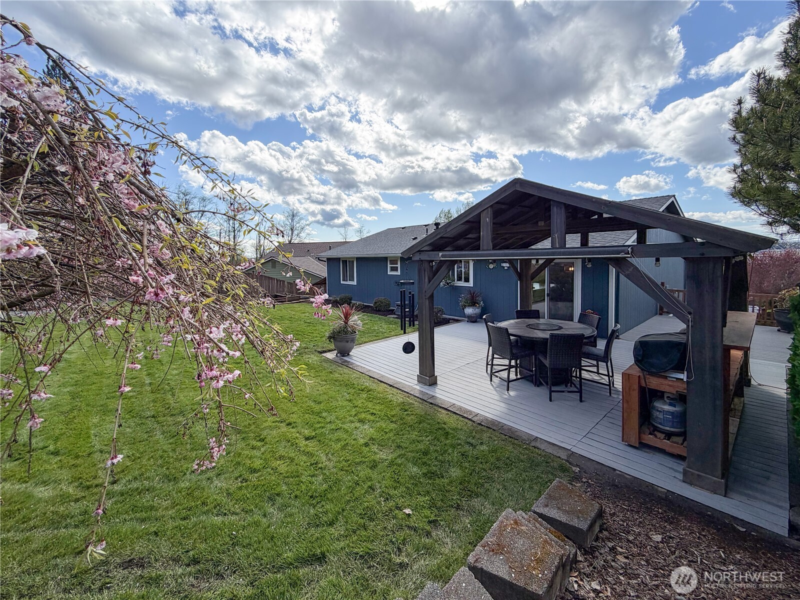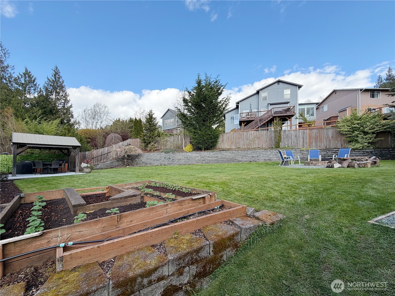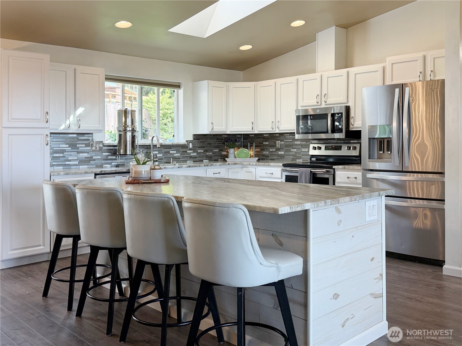 Gorgeous view-home with beautifully landscaped grounds, a fully-fenced yard, and a warm, welcoming feel throughout. This 4-bedroom, 3-bath home offers a brand new roof with warranty, vaulted ceilings, skylights, a cozy fireplace, and natural gas utilities for added comfort and efficiency. Your stunning kitchen offers SS cabinets, a massive island with bar seating, hands-free faucet, custom lighting and leathered-finish granite countertops. Step out to the resort-style backyard with no stairs, lush landscaping, a covered outdoor entertaining area, 2 fruit-bearing apple trees and a cherry tree, and a garden area making outdoor living easy, beautiful, and accessible. Ample storage can be found throughout the home, including built-in shelving in the garage that conveys. Ideally located near shopping, schools, freeway access, and all the amenities you need!