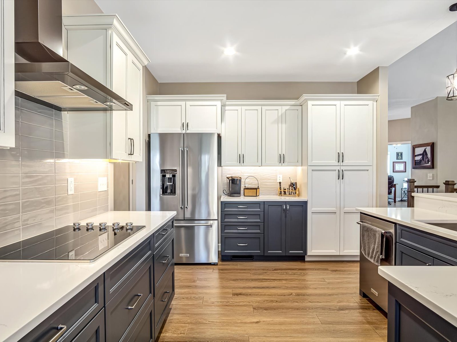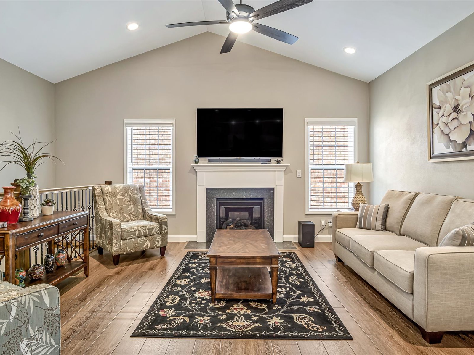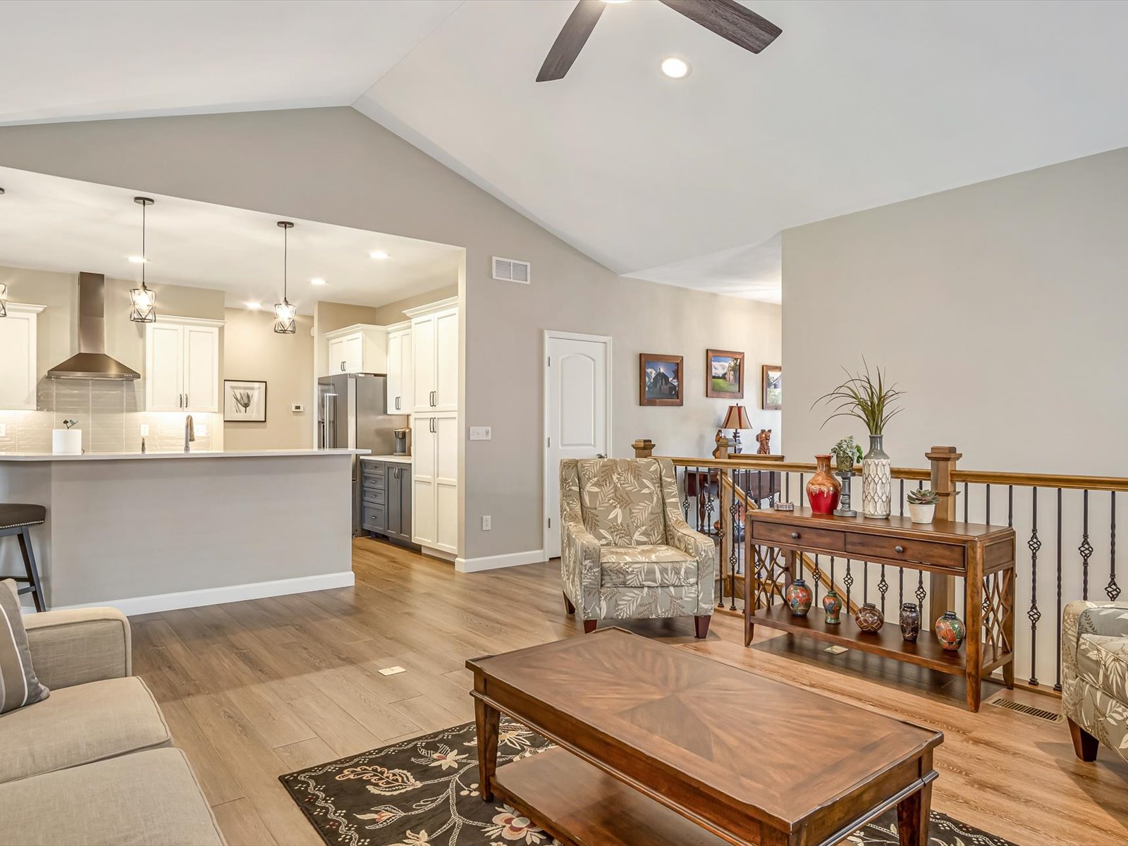 Elegant Zero-Entry Villa with High-End Custom Finishes Experience effortless living in this stunning, detached standalone villa. This zero-entry home combines architectural beauty with practical accessibility, featuring a striking brick and stone exterior and professional landscaping with custom retaining walls. Inside, the main level impresses with 9-foot ceilings, durable LVP/LVT flooring, and cased windows outfitted with custom blinds. The heart of the home is a vaulted living room anchored by a gas fireplace and an elegant iron-spindled staircase. Culinary enthusiasts will love the custom kitchen, featuring quartz countertops, subway tile, and high-end built-in appliances. Relax in the light-filled sunroom or step through the four-panel sliding doors to a truly unique EZ Breeze Lanai. This versatile space features a puncture-resistant vinyl panel system and a power privacy screen, leading out to a 10x16 Trex deck with a SunSetter retractable awning. The primary suite is a private retreat with 36-inch doors, a tray ceiling, a bay window and a spa-like ensuite designed for longevity with a walk-in shower, reinforced walls for grab bars. Mechanicals & Tech: CAT 5 wiring with battery backup, Kinetico water softening/Reverse Osmosis system, radon mitigation, and a generator with a 10-year transferable warranty. Expanded Garage: Oversized 24x25 space with 8’ doors, service door, epoxy flooring, and an integrated storage system. Listing broker has attempted to offer accurate data & info is deemed reliable but not guaranteed. Square footage may not be accurate. Buyers & agents are responsible for verifying accuracy. Camera/Video on premises.