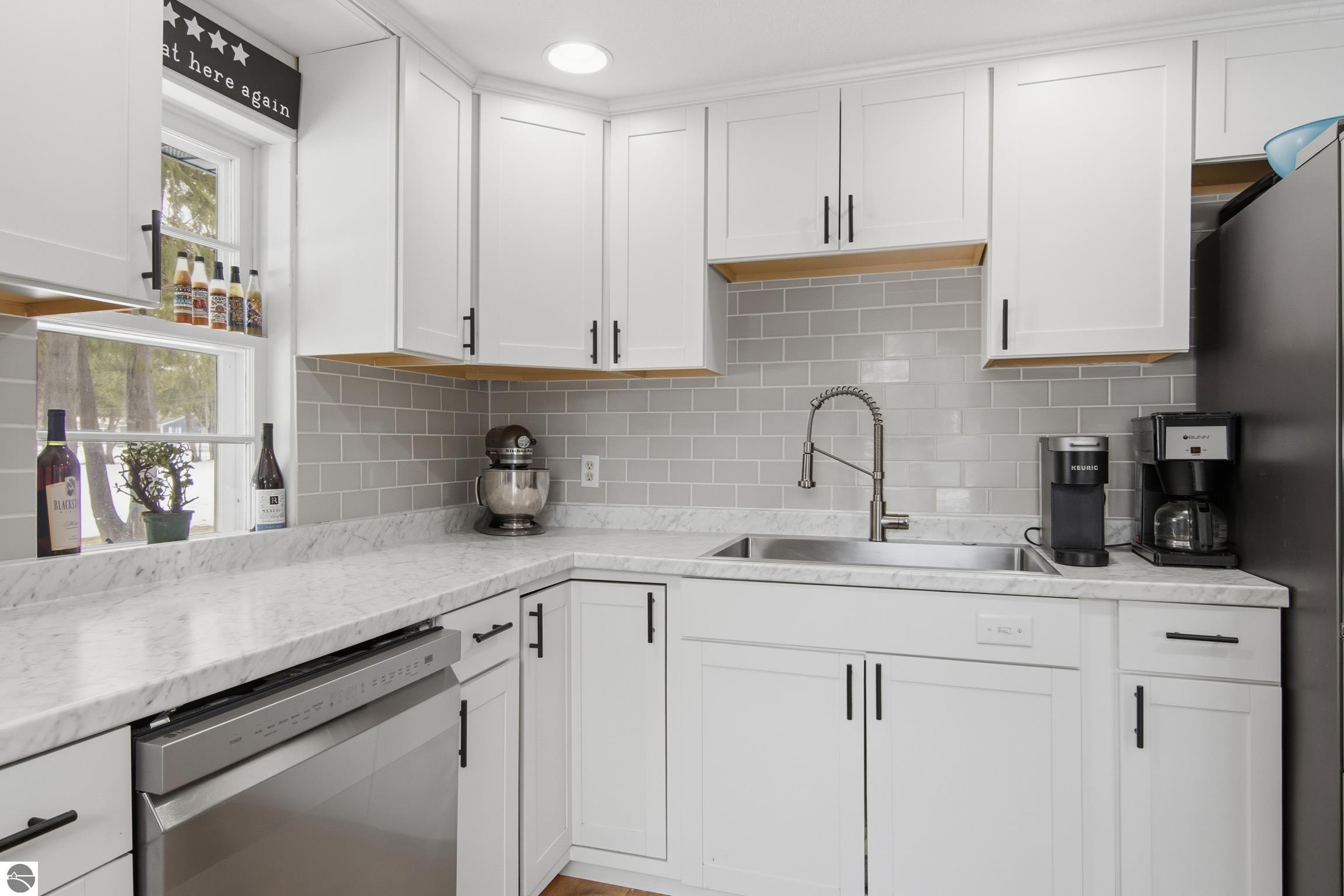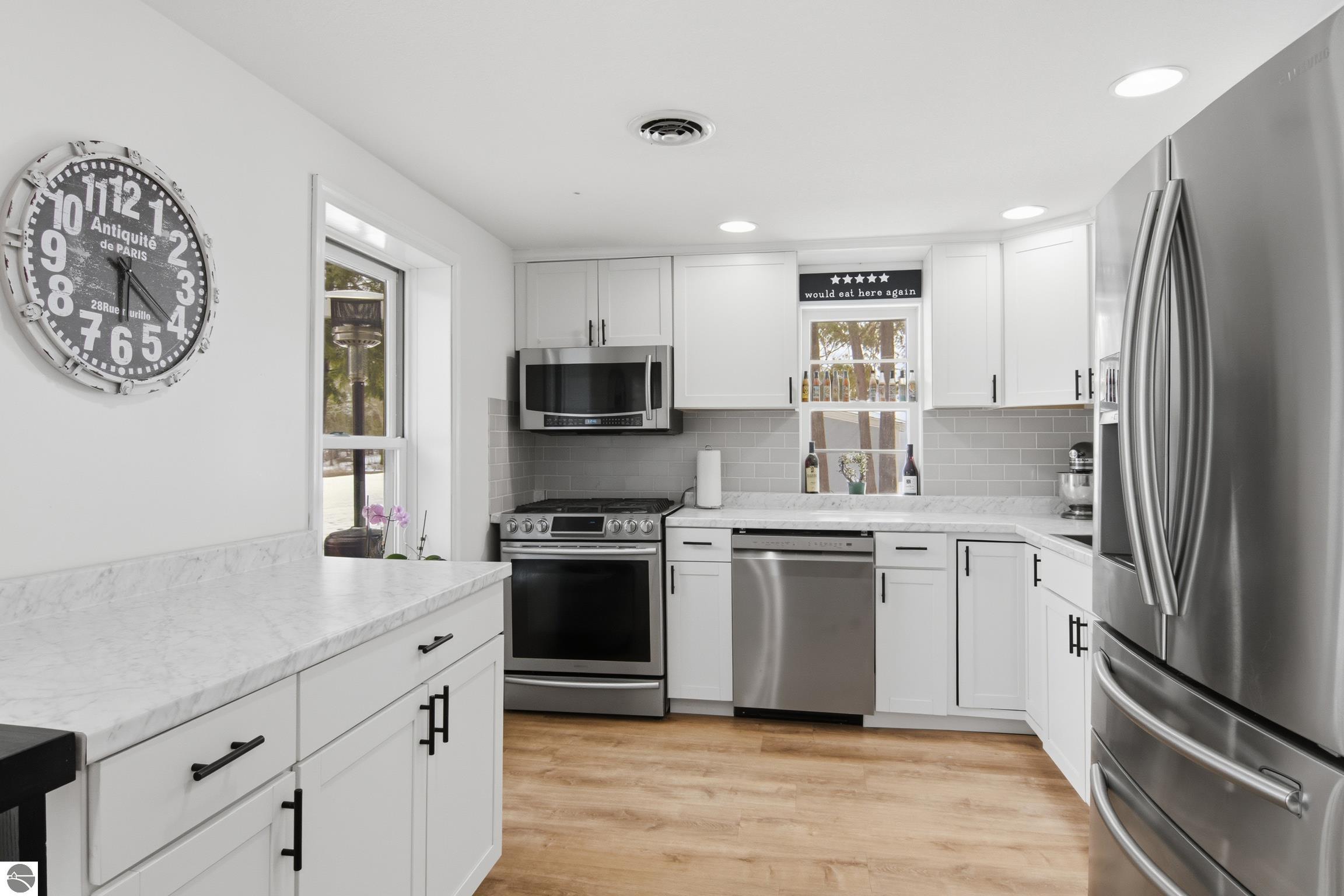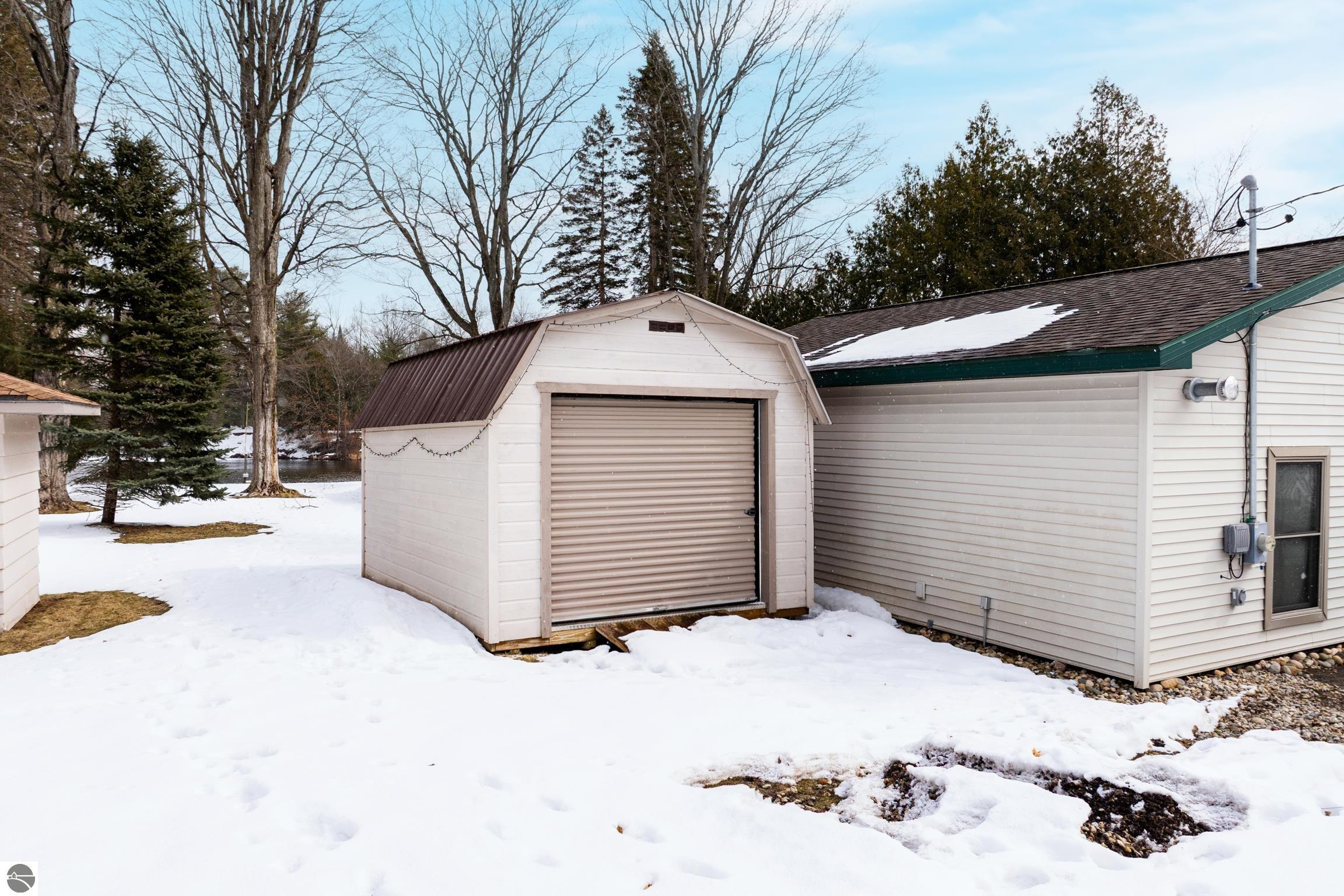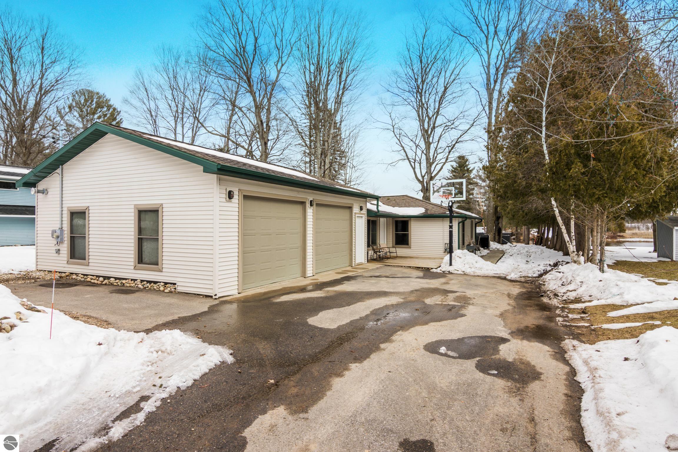 100 feet of direct frontage on the Intermediate River! This 3-bedroom, 1.5-bath home offers over 1,700 sq ft and is ideally situated on Antrim County's Upper Chain of Lakes. Enjoy stunning sunrise views and easy boating access to Intermediate Lake and over 20 miles of waterways through seven connecting lakes. Located on a desirable waterfront street just one block from downtown Bellaire, you're close to restaurants, shops, and local amenities—with the downtown walking trail right around the corner. Inside, a wall of windows fills the main living area with natural light and showcases beautiful river views. Recent interior updates include luxury plank vinyl flooring, new carpet, and an updated bathroom. The kitchen has been refreshed with new cabinets and appliances, plus a convenient stackable washer and dryer. Air conditioning has been added for year-round comfort. The heated garage features insulated doors and includes a finished office space—perfect for working from home, hobbies, a gym, or extra storage. Outdoor improvements include expanded decking, an asphalt driveway, and a sprinkler system. The property also features two docks and a 16x10 shed with a loft for additional storage. Enjoy peaceful riverfront living with abundant wildlife, all while being just steps from town.