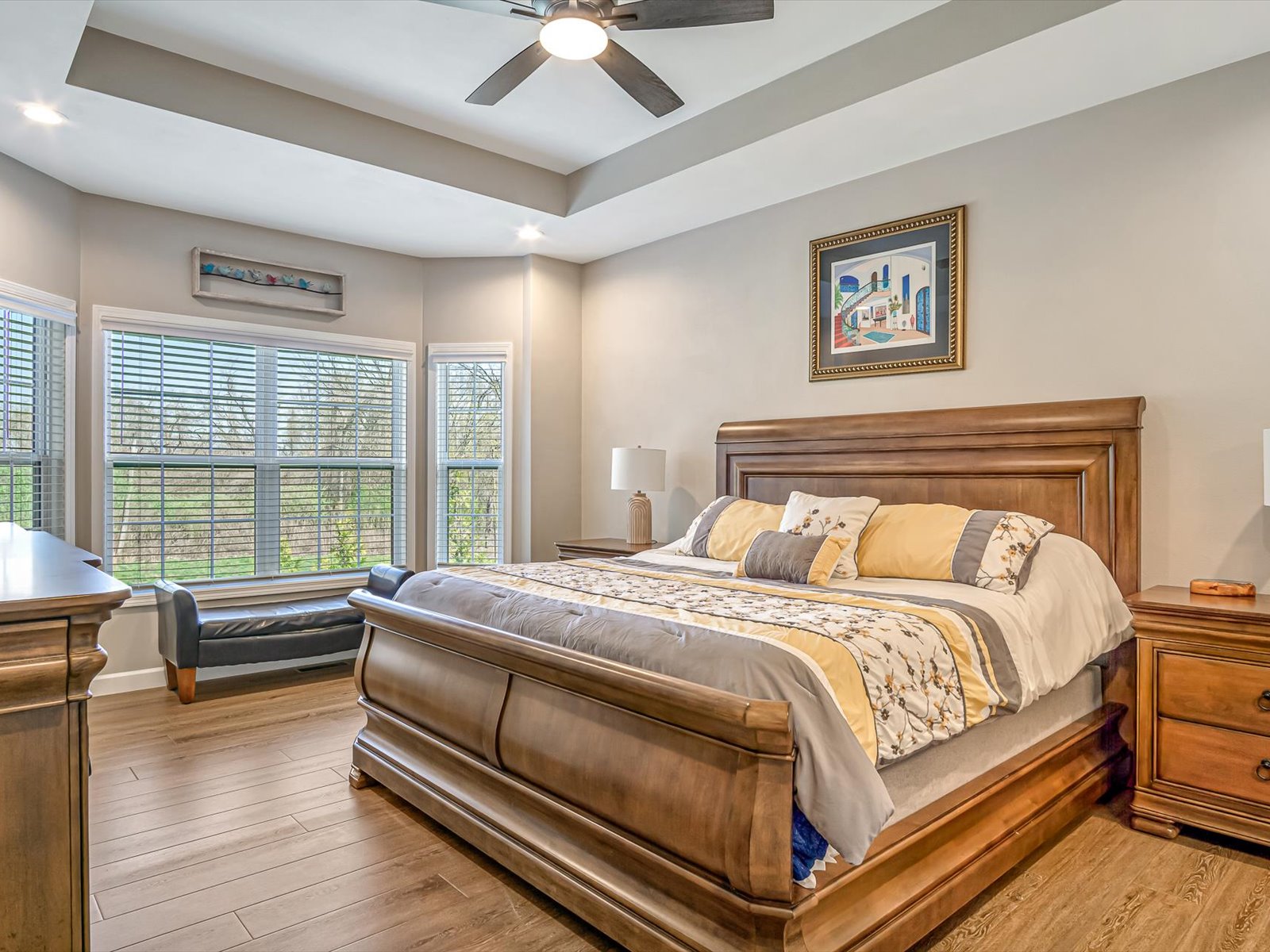 Modern luxury blends seamlessly with warmth, sophistication, and timeless design in this stunning white brick residence nestled within the exclusive gated enclave of Mallard Pond. This picturesque community features private streets lined with charming lanterns, a scenic gazebo, and a tranquil dock overlooking the lake creating a peaceful, storybook setting just outside the city limits. Residents enjoy a close-knit atmosphere surrounded by beautiful views and thoughtful amenities that elevate everyday living. Located in the highly sought-after Pleasant Grove ISD just north of I-30, this home offers unbeatable access to top-rated schools, leading healthcare facilities, and a wide array of shopping, dining, and entertainment options. Whether youre enjoying a night out at a local bistro or heading to Shreveport, Louisiana or Little Rock, Arkansas via nearby gateways, convenience is always within reach. From its sleek lines and striking curb appeal to the welcoming front porch, every detail sets the tone for what awaits inside. Step into a sun-drenched interior where soaring ceilings, expansive floor-to-ceiling windows, and a beautifully crafted wooden staircase anchor the open-concept living space. The great room exudes comfort and elegance with exposed wooden ceiling beams and a contemporary gas fireplace, creating a refined yet inviting atmosphere. The chefs kitchen is a true showpiece, featuring stainless steel appliances, a gas cooktop, herringbone-patterned subway tile, glass pendant lighting, and stunning countertops that flow into a sit-down dining surface. A statement chandelier in the dining area adds a touch of drama and completes the cohesive design. Just off the main living area, a single-panel glass door reveals a spacious private office or creative studio, outfitted with custom built-ins and ample room for productivity, inspiration, or quiet focus. Whether youre working from home or pursuing a passion project, this dedicated space offers both style and substance. Upstairs, a versatile loft provides additional living space, ideal for a media room, play area, or quiet retreat. The primary suite is a sanctuary of style, boasting cathedral ceilings, a luxurious soaking tub, a glass-tiled walk-in shower, dual vanities, and a spacious closet with built-in drawers and shelving. Thoughtful extras abound, including a generously oversized mudroom with built-in cubbies, bench seating, and storage nooks perfect for organizing daily essentials and keeping the home clutter-free. This functional hub connects effortlessly to the garage and laundry room, streamlining routines with elegance and ease. Youll also find an oversized laundry room with a utility sink and a roomy garage designed for convenience and storage. Step outside to a beautifully landscaped, fully fenced backyard that offers both privacy and tranquility. The spacious covered porch is perfect for year-round enjoyment whether youre hosting summer barbecues, sipping morning coffee, or unwinding in the evening with friends. With ample room for outdoor dining, lounging, or play, this backyard is a true extension of the home, designed for comfort, connection, and effortless entertaining. With a tankless water heater, premium finishes throughout, and a second gas fireplace, this residence is as efficient as it is elegant. Quiet, secure, and impeccably designed, this Mallard Pond masterpiece defines modern living in a private, gated setting where every detail speaks to quality, style, and thoughtful craftsmanship.