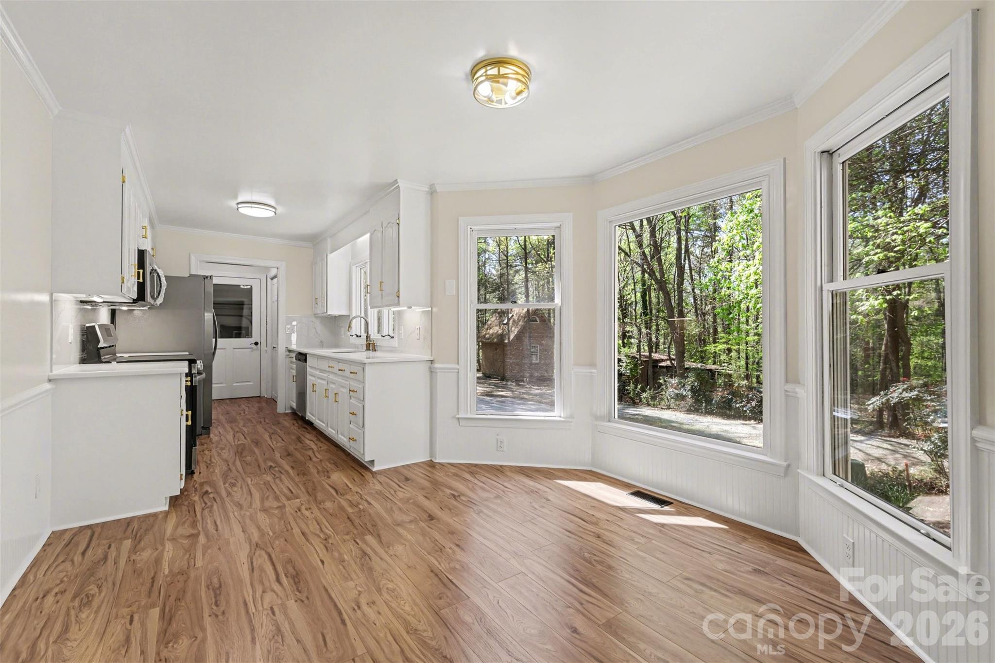 NO HOA Plenty of room to park all your vehicles, RV's, Recreational Vehicles and Toys.Welcome to 10542 Blair Road in the Beautiful Mint Hill Area. Peaceful surrounded with trees; offering an Inviting Atmosphere. As you step inside where the living room welcomefor both everyday living and special occasions. New Laminated floors throughout the home add a touch of elegance. The remodeled kitchen offers new counters and plenty of cabinetry brand new appliances and new Fixtures, whether you're entertaining guests or enjoying family meals, this space combines functionality with style. Bathrooms have been updated with new Furniture and Vanities. The Front Porch adds character where you can enjoy the view of the Woods and listen to the Birds. The extra big garage attached to the home and adjacent to the garage there is a Workshop plus 2 car metal carport, plus two-story outbuilding plenty of space for RV parking. This versatile space offers endless possibilities for personal and creative use. Outside, the private backyard setting provides a serene retreat, perfect for outdoor gatherings or quiet moments of reflection. Additionally, there is extra space for parking recreational vehicles, ensuring convenience and flexibility. Experience the perfect blend County Living and close to everything only 1 minute from 485 Hwy for easy access for commuting - a true gem in the heart of Mint Hill.s you with a fireplace, creating a cozy ambiance