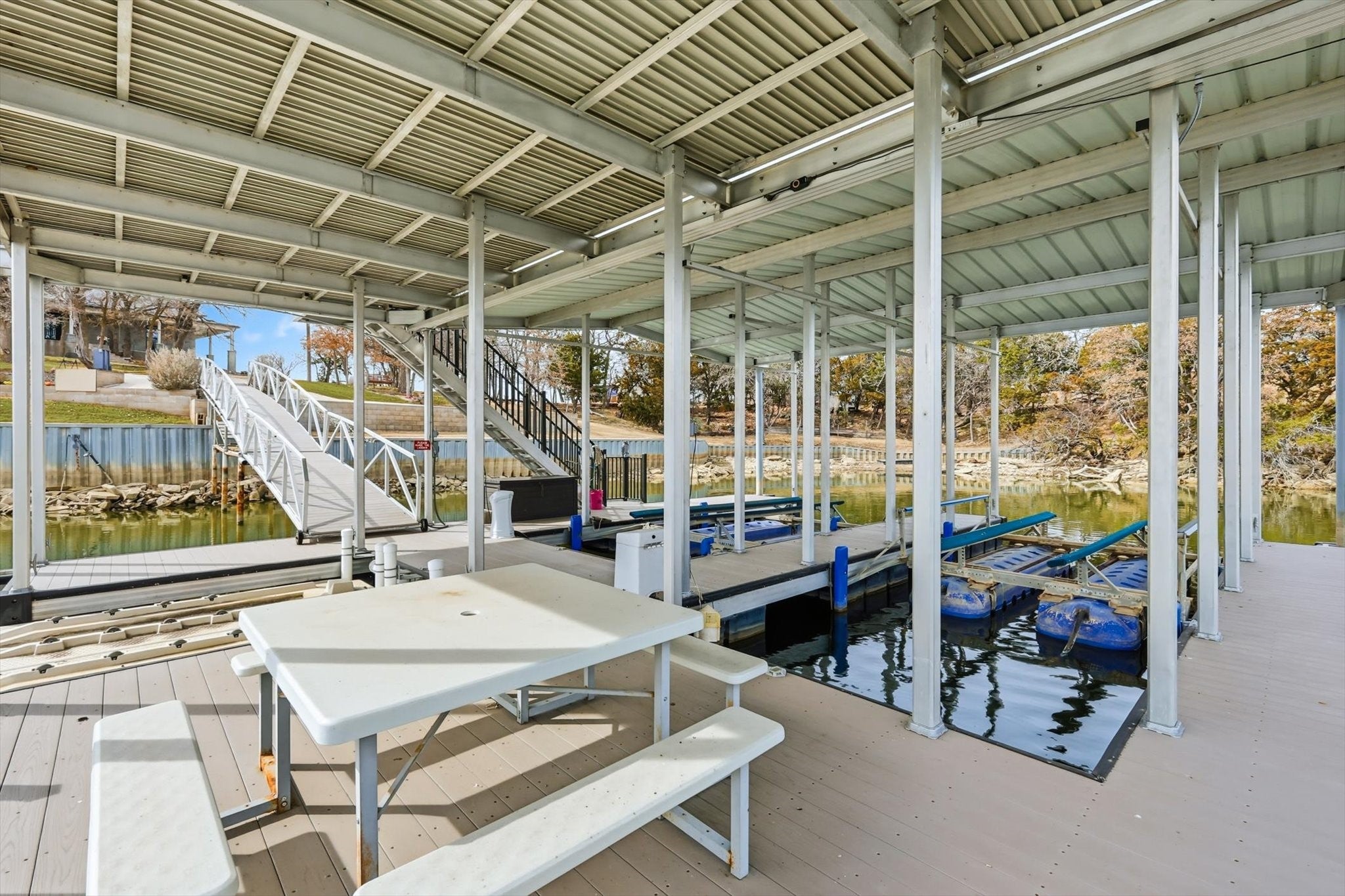 Set on the peaceful west side of PK, this property sits on 1.5 acres of secluded waterfront providing outstanding privacy, calm DEEP waters and expansive open lake views. The property is thoughtfully arranged to highlight outdoor living with tiered terraces, shaded gathering areas and stone pathways that lead naturally to the waters edge, a multilevel private dock serves as the centerpiece of lake life. The dock features 2 boat slips, 1 personal watercraft slips & generous covered, open areas designed for relaxing or entertaining family & friends, Completed in 2022, the custom built home offer a modern open layout that connects seamlessly to the outdoors. The main living area features soaring ceilings, expansive windows framing the lake, statement lighting and a centrally located wood-burning stove. The chefs kitchen is designed for gathering after long days on the water & includes premium stainless steel appliances double refrigerator & ovens, abundant cabinetry & ample storage. The main level includes a spacious primary suite with a soaking tub, walk-in shower & separate closets, along with a guest bedroom full bath & utility room. Upstairs, a loft overlooks the living area accompanied by 2 additional bedrooms, a full bath and generous storage. An unfinished attic space offers flexibility for future expansion. This private peninsula property delivers a rare opportunity to enjoy P K Lake at its finest- combining privacy, modern luxury, protected waterfront & spaces designed for true lake living.