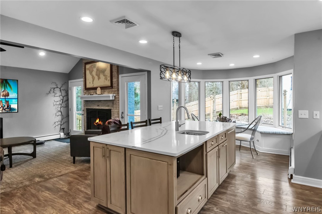 Exceptional Hager-built home in a beautiful, sought-after neighborhood just a short walk to the village. This well-designed home offers the perfect blend of elegant formal spaces and comfortable everyday living. The custom kitchen of your dreams features quartz counters, two islands great for the chef in you and a perfect breakfast bar, and a bright breakfast nook overlooking the fully fenced backyard, that opens to a vaulted ceiling great room with a cozy gas fireplace. The flexible front living area can easily serve as a formal dining room or additional gathering space. The spacious primary suite includes its own private balcony and a fully remodeled bath with soaking tub, tiled shower, double sinks, and heated floors. Enjoy added versatility with a lower-level family room featuring doors to the yard, which could also function as a 4th bedroom if needed. The expansive basement offers even more space for a gym, office, or rec room, along with a workshop and abundant storage. Set on a private lot with a full privacy fence and shed, this home also features efficient multi-zone baseboard heat and central air, and is has inviting outdoor spaces including a patio and balcony to take in the backyard views.